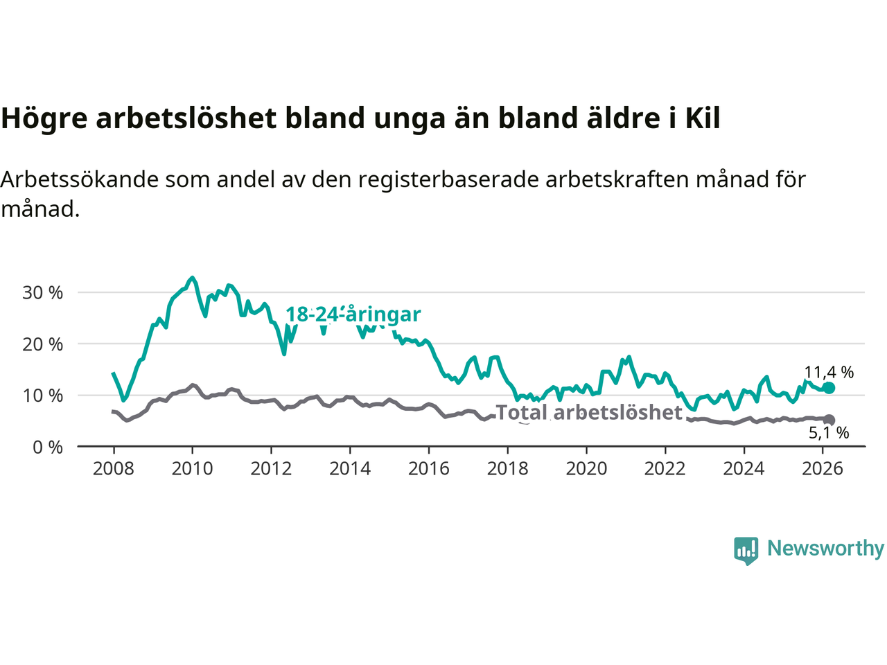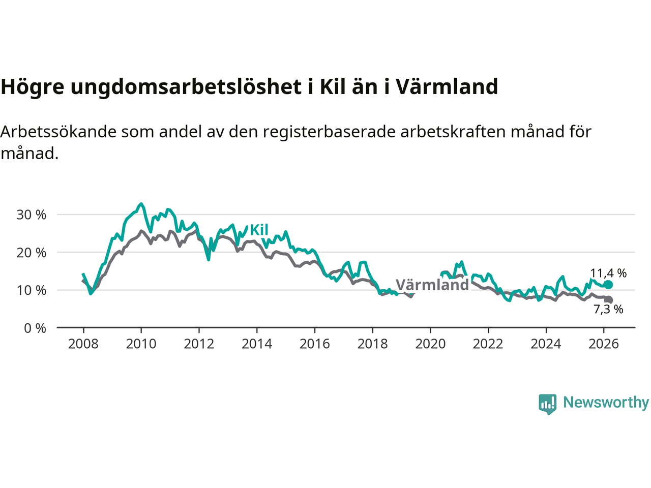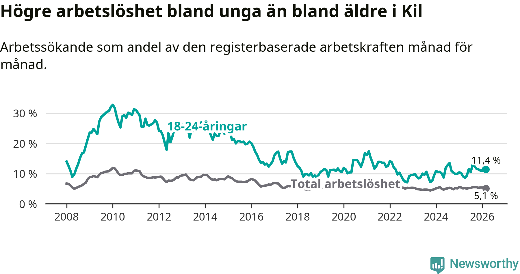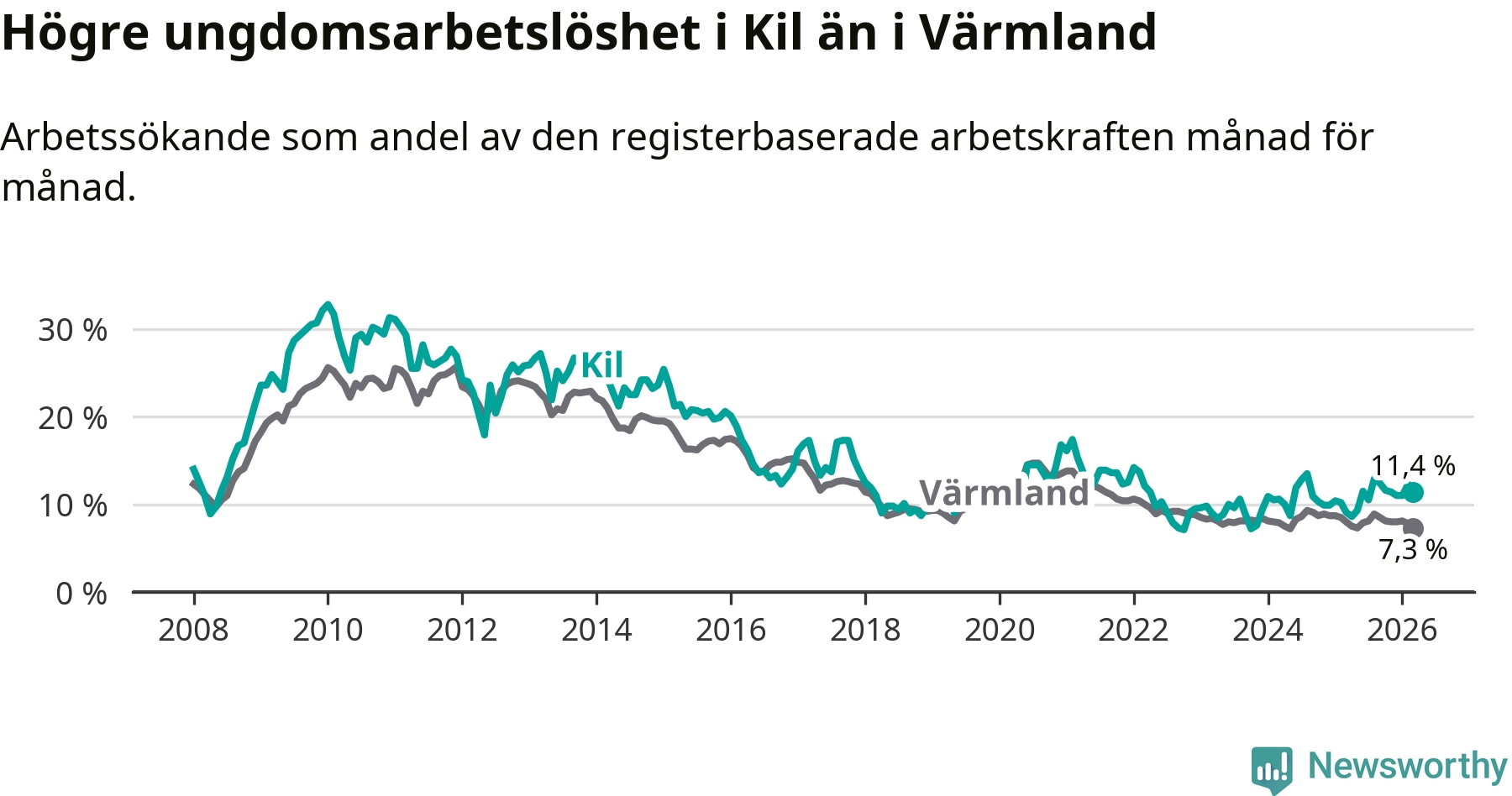 I och med den senaste månadens uppgång har de ungas arbetslöshet i Kil stigit sju månader i följd (upp från 12,9 procent i augusti 2025 till 11,4 procent nu).