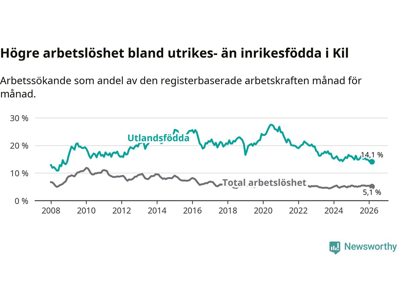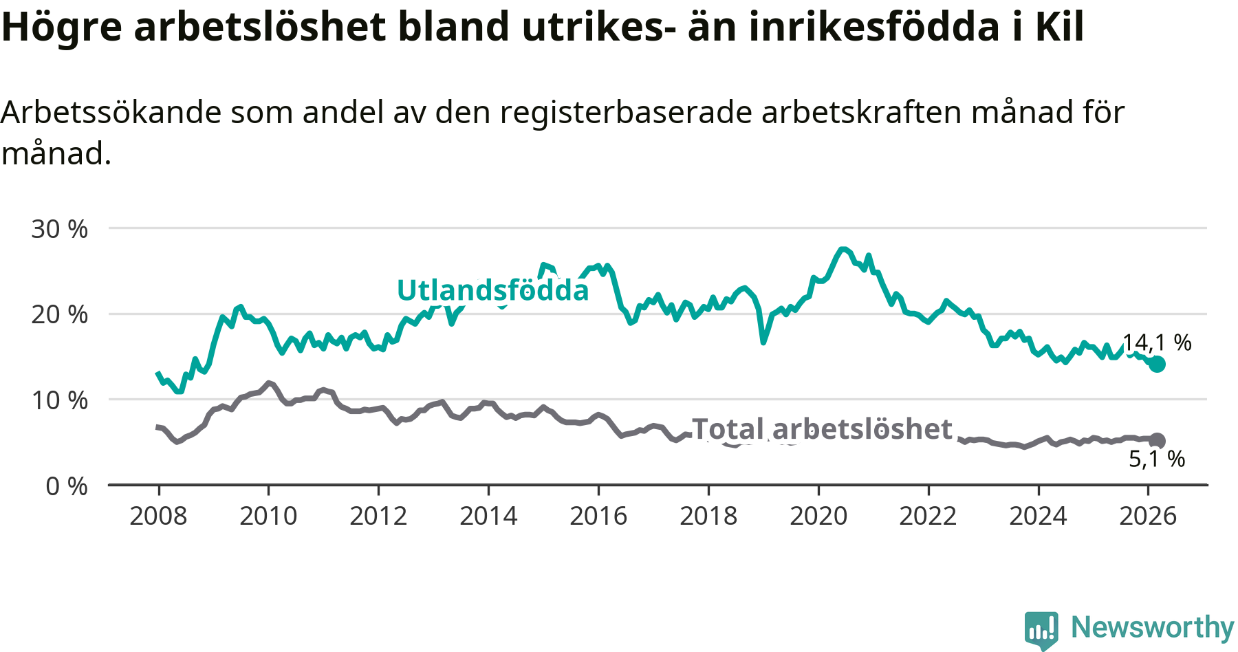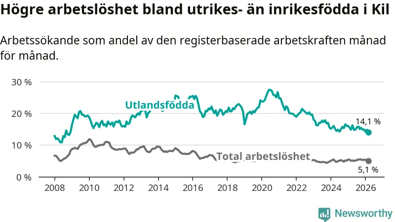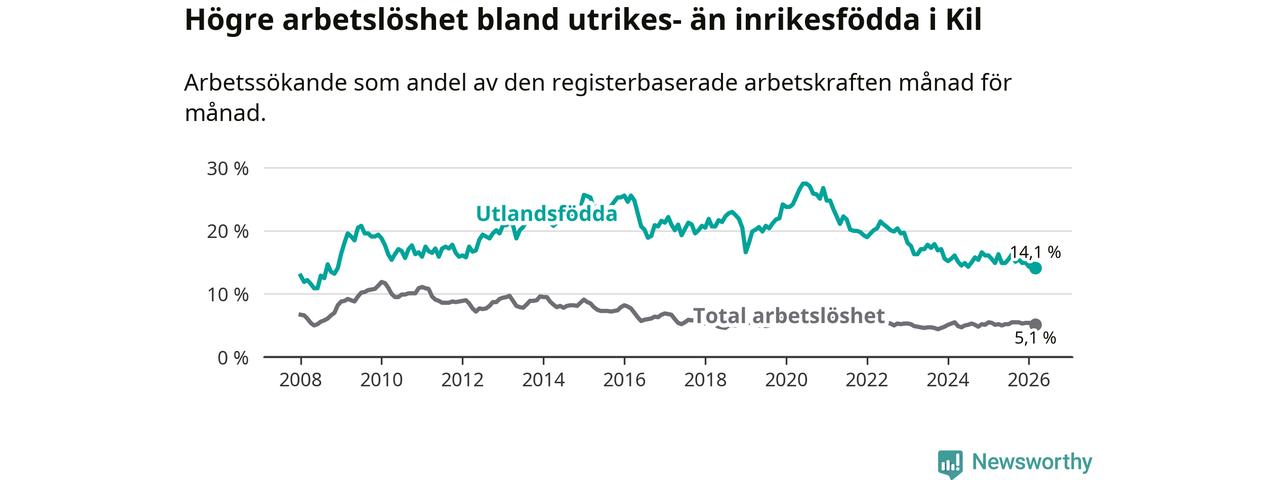 Skillnaden i arbetslöshet mellan utrikesfödda och hela befolkningen är 9,0 procentenheter i Kil. Det är en mindre skillnad än för ett år sedan (−0,8 procentenheter).