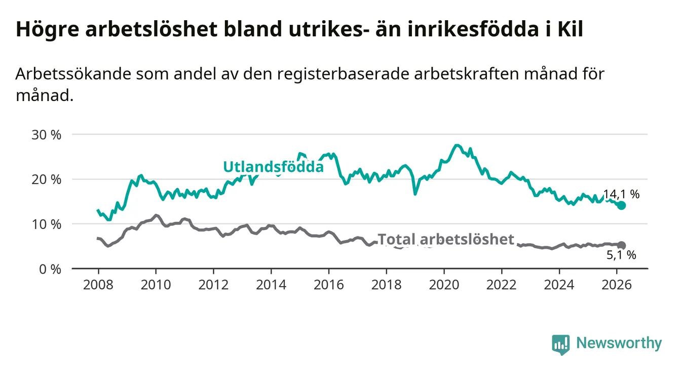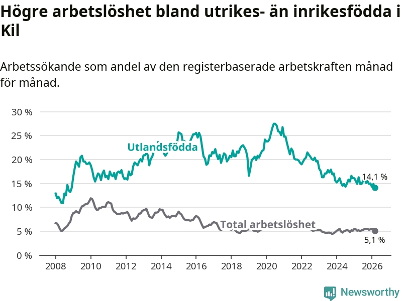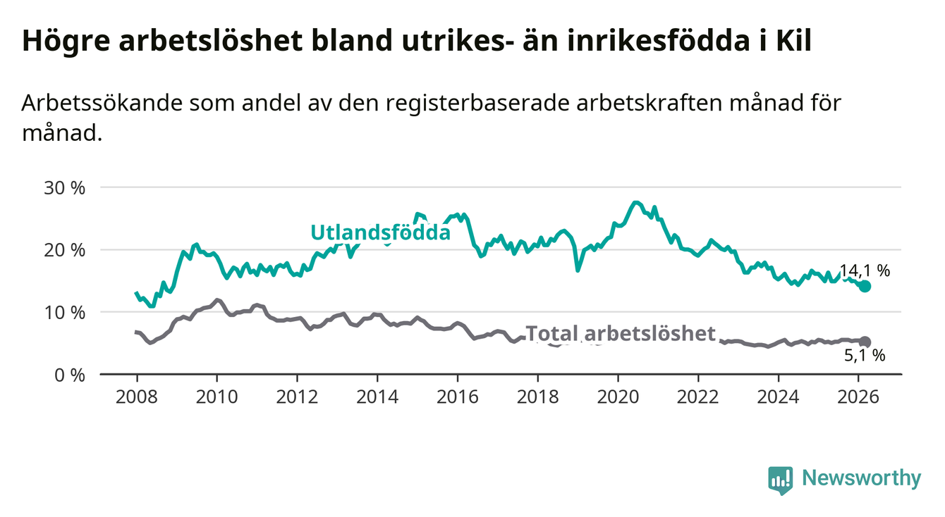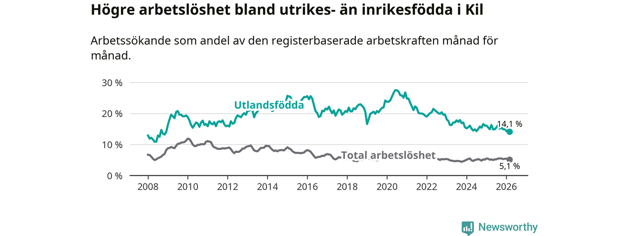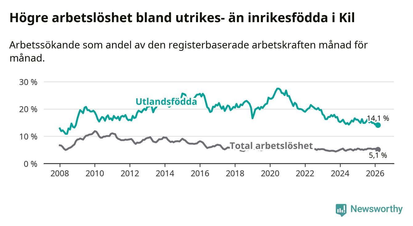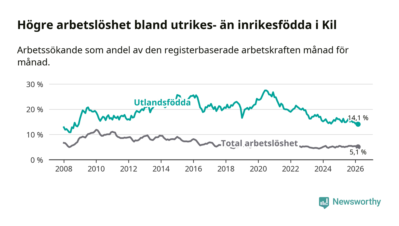 Arbetslösheten bland utlandsfödda var 14,1 procent i Kil under mars månad, motsvarande 72 av 511 personer. Det är 0,8 procentenheter färre än vid samma tidpunkt i fjol (−3 om man räknar personer). Den nuvarande arbetslöshetsnivån är den lägsta sedan december 2008.