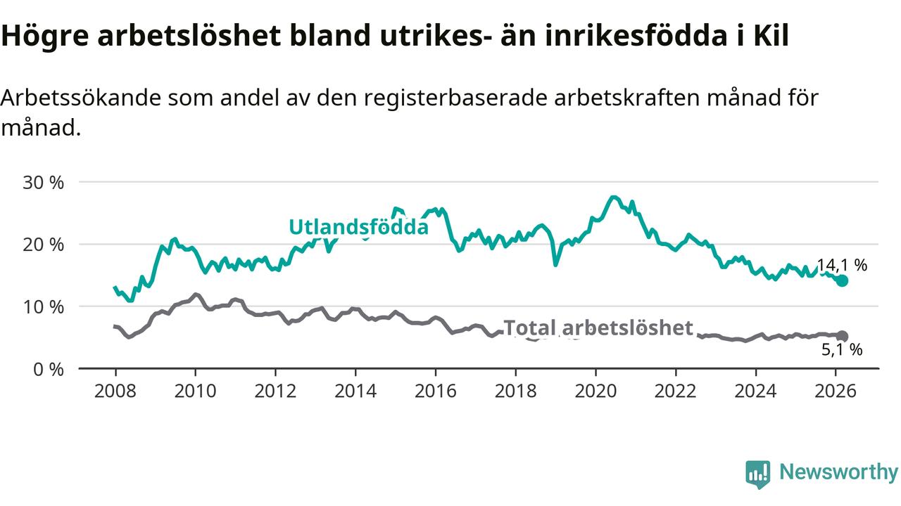 Den senaste månadsstatistiken från Arbetsförmedlingen visar på en nedgång i arbetslöshet bland utlandsfödda i Kils kommun med 0,8 procentenheter. Arbetslösheten bland invånare födda i ett annat land låg i mars på 14,1 procent.