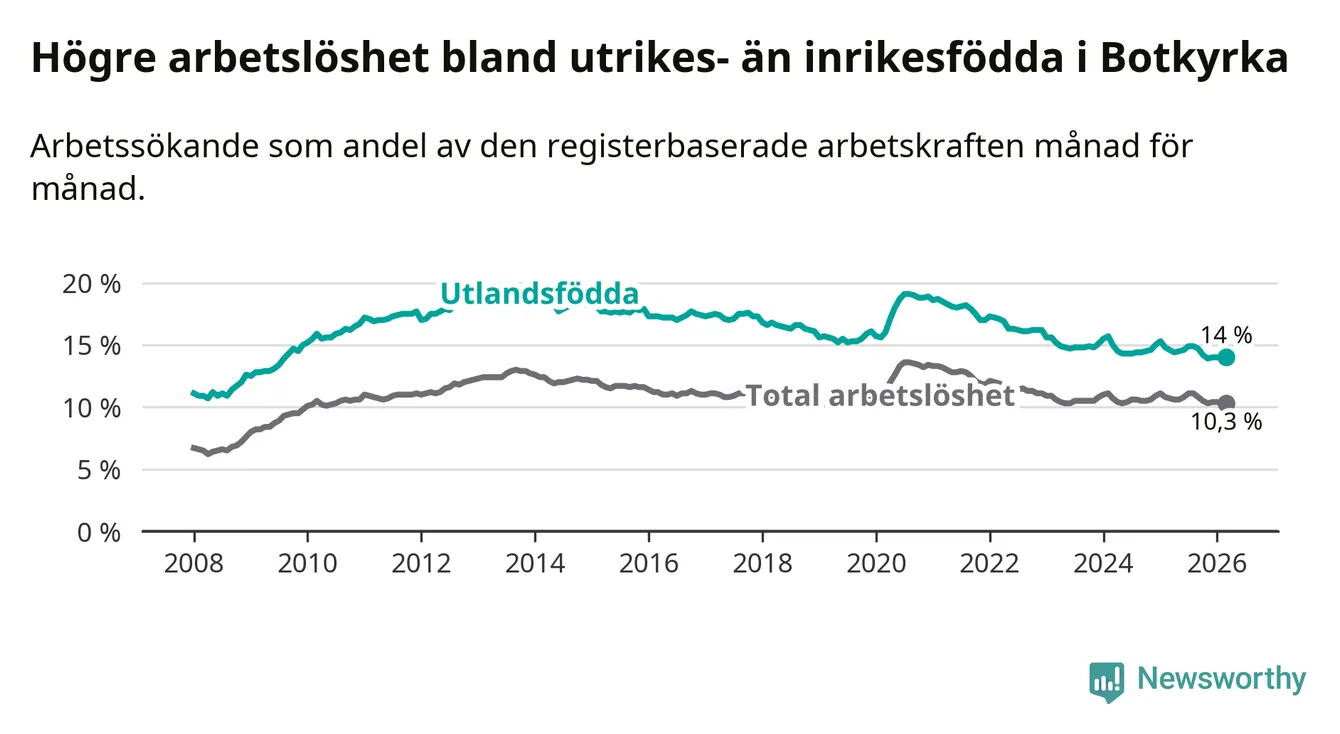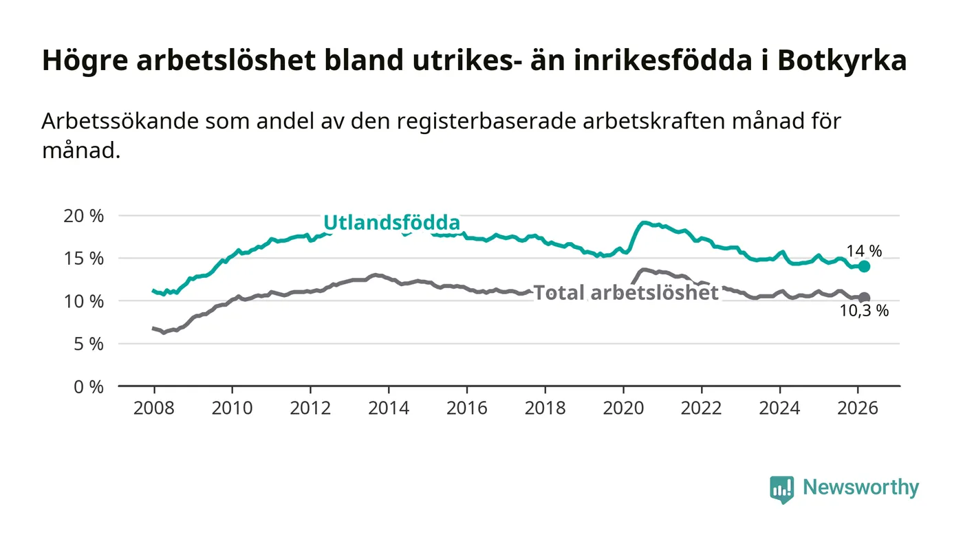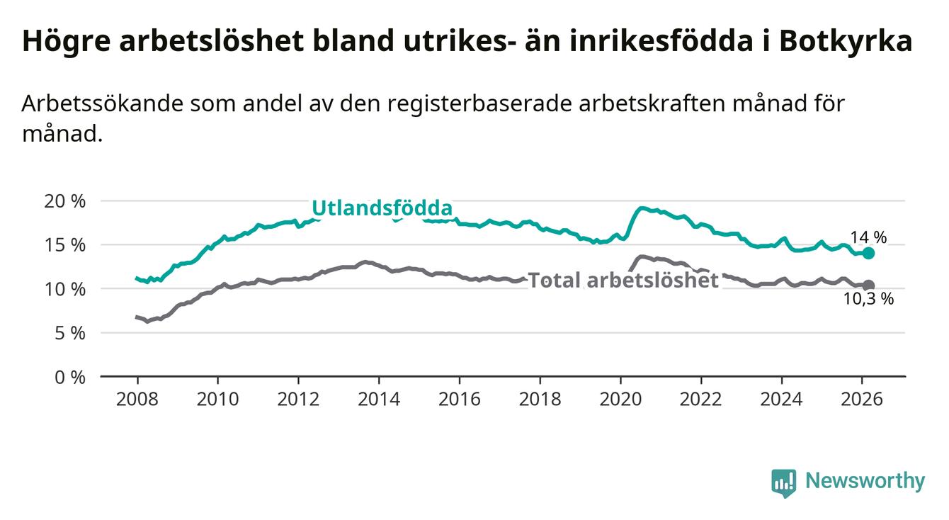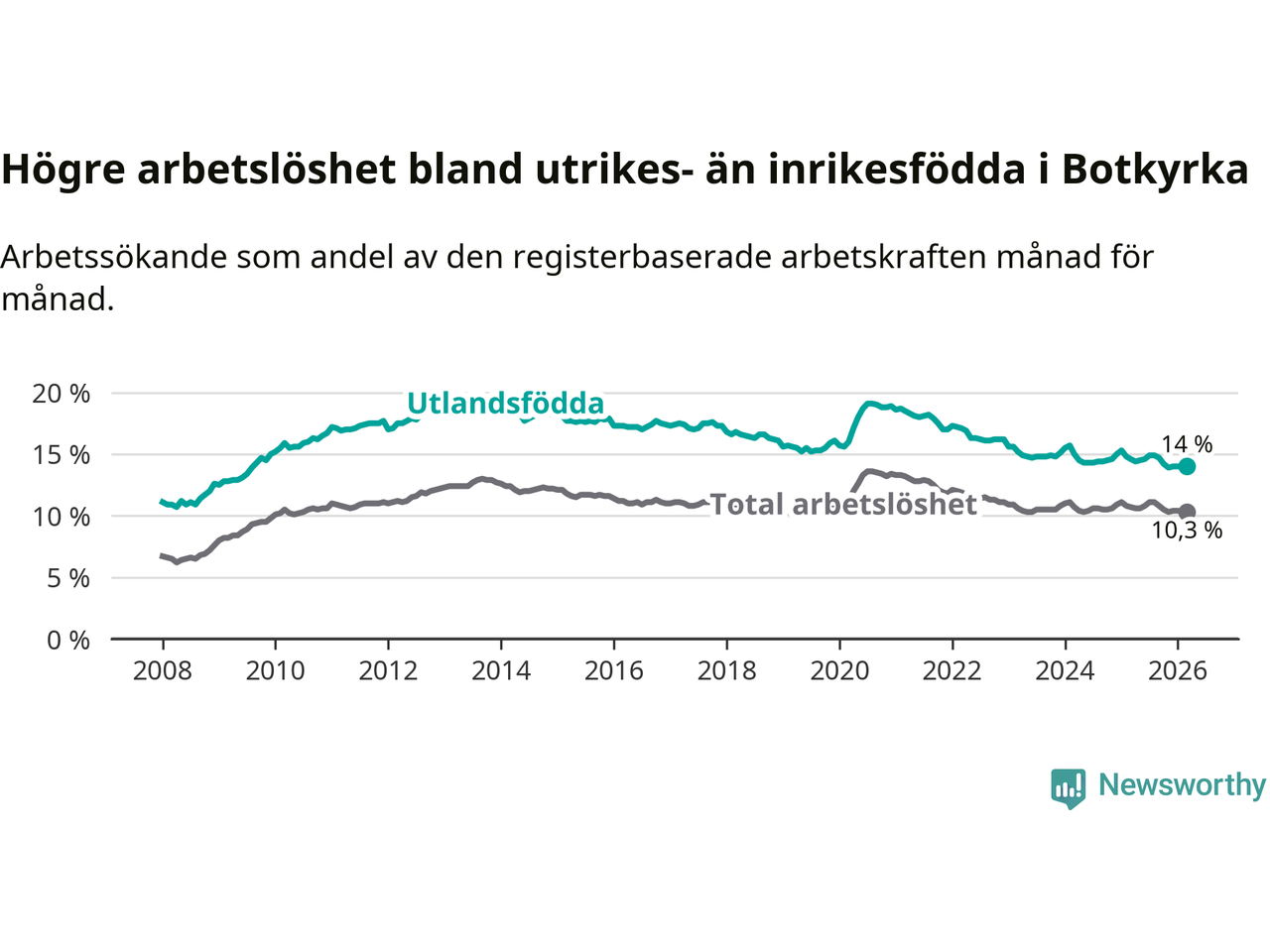 Arbetslösheten bland utlandsfödda var 14,0 procent i Botkyrka under mars månad, motsvarande 3 695 av 26 393 personer. Det är 0,6 procentenheter färre än vid samma tidpunkt i fjol (−115 om man räknar personer). Därmed är de utlandsföddas arbetslöshet lägre än vid samma tidpunkt i fjol för sjätte månaden i följd.