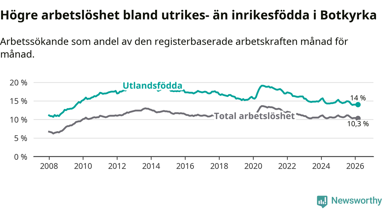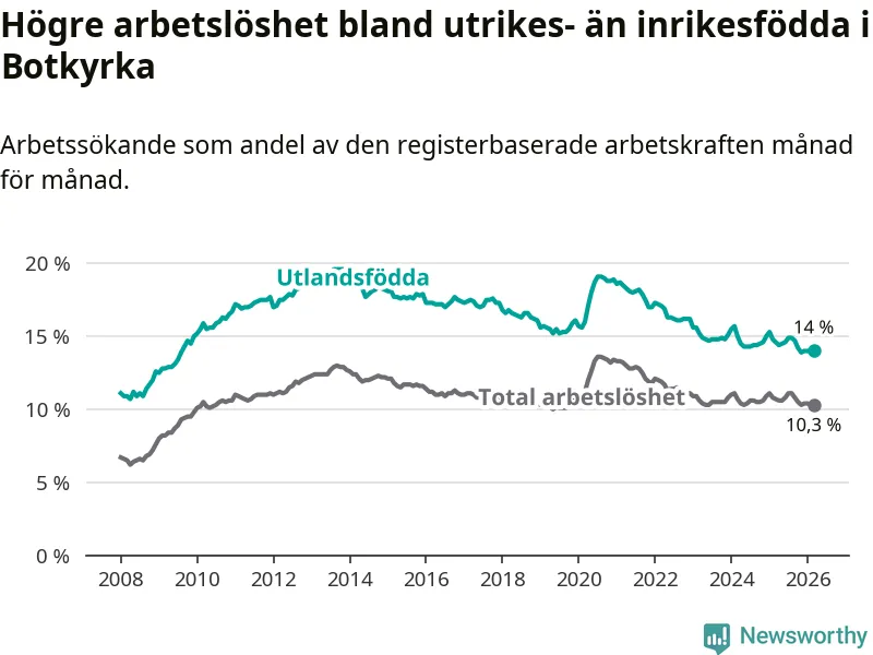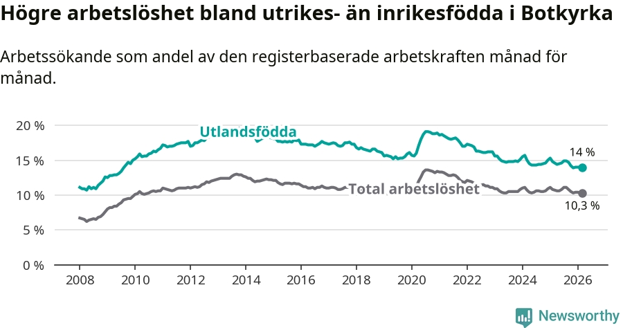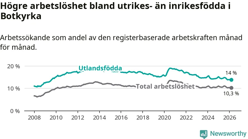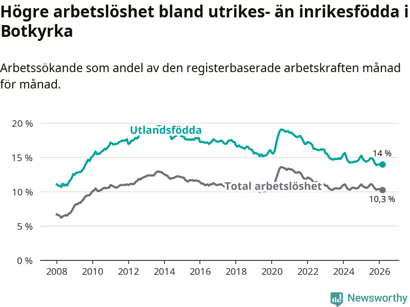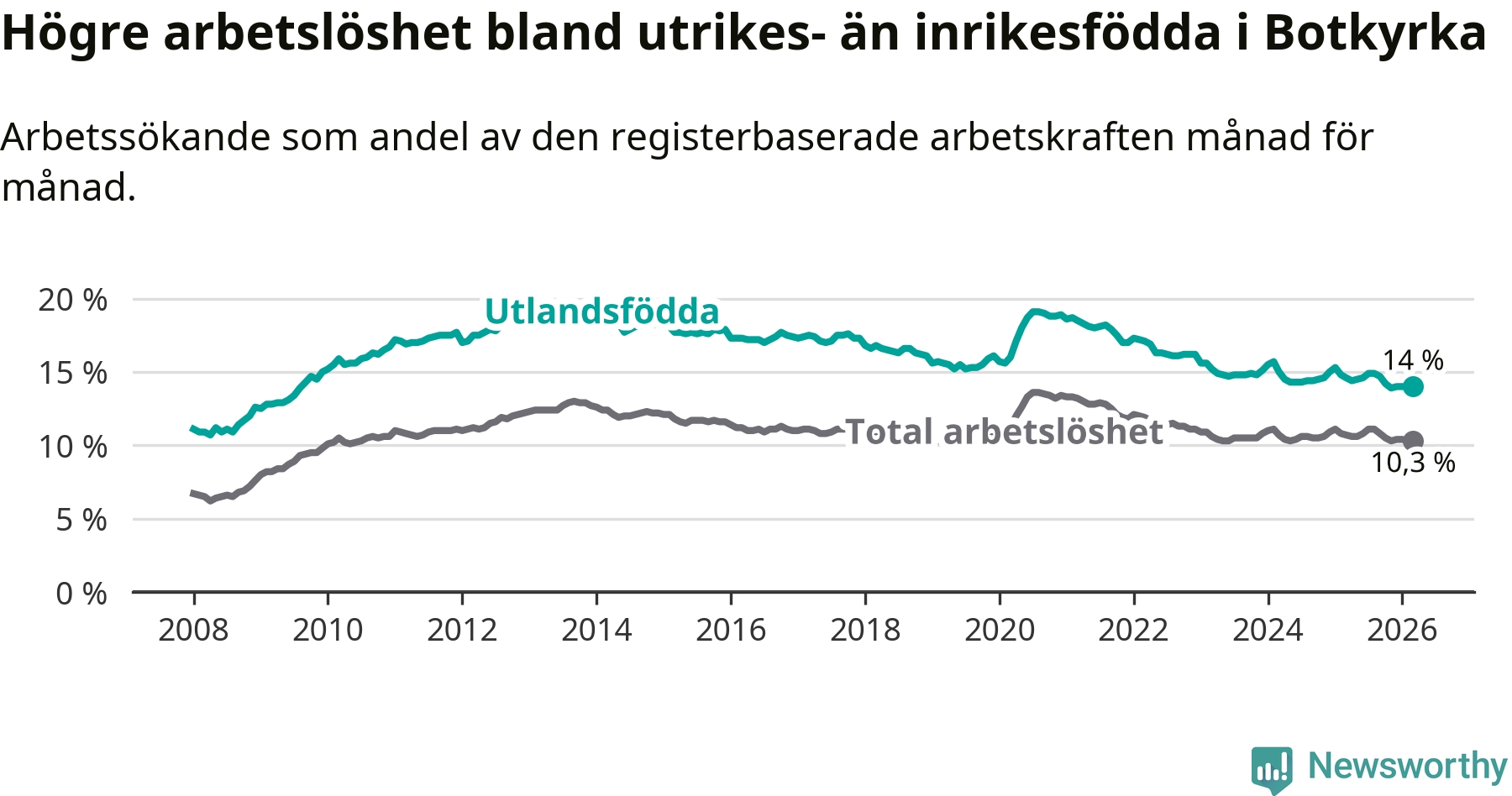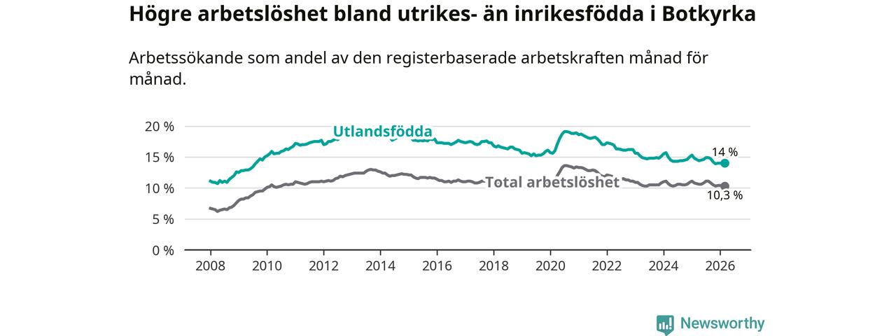 Arbetslösheten bland utlandsfödda var 14,0 procent i Botkyrka under mars månad, motsvarande 3 695 av 26 393 personer. Det är 0,6 procentenheter färre än vid samma tidpunkt i fjol (−115 om man räknar personer). Därmed är de utlandsföddas arbetslöshet lägre än vid samma tidpunkt i fjol för sjätte månaden i följd.