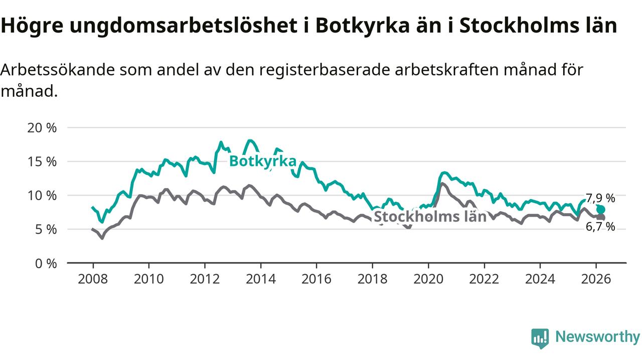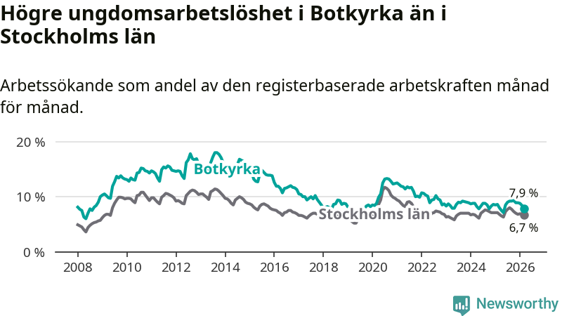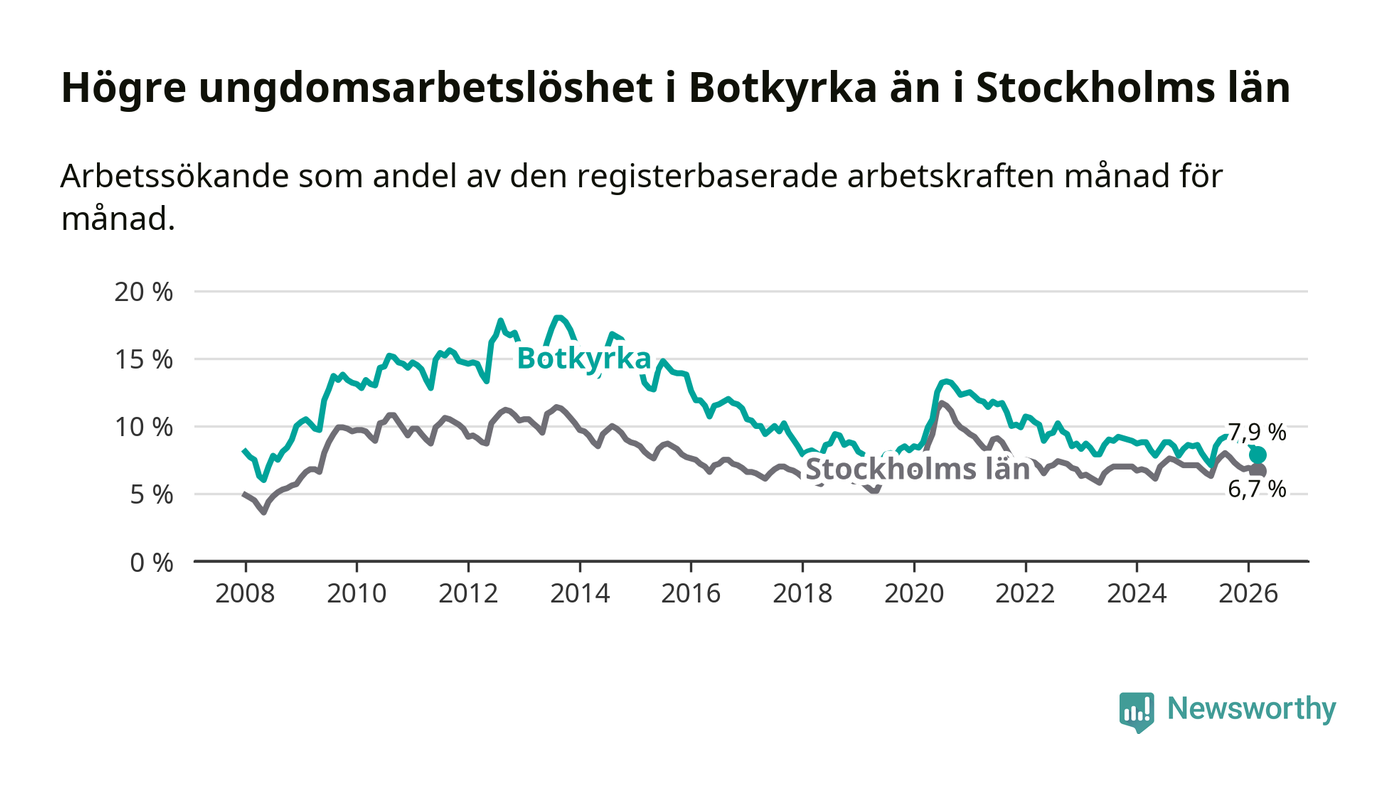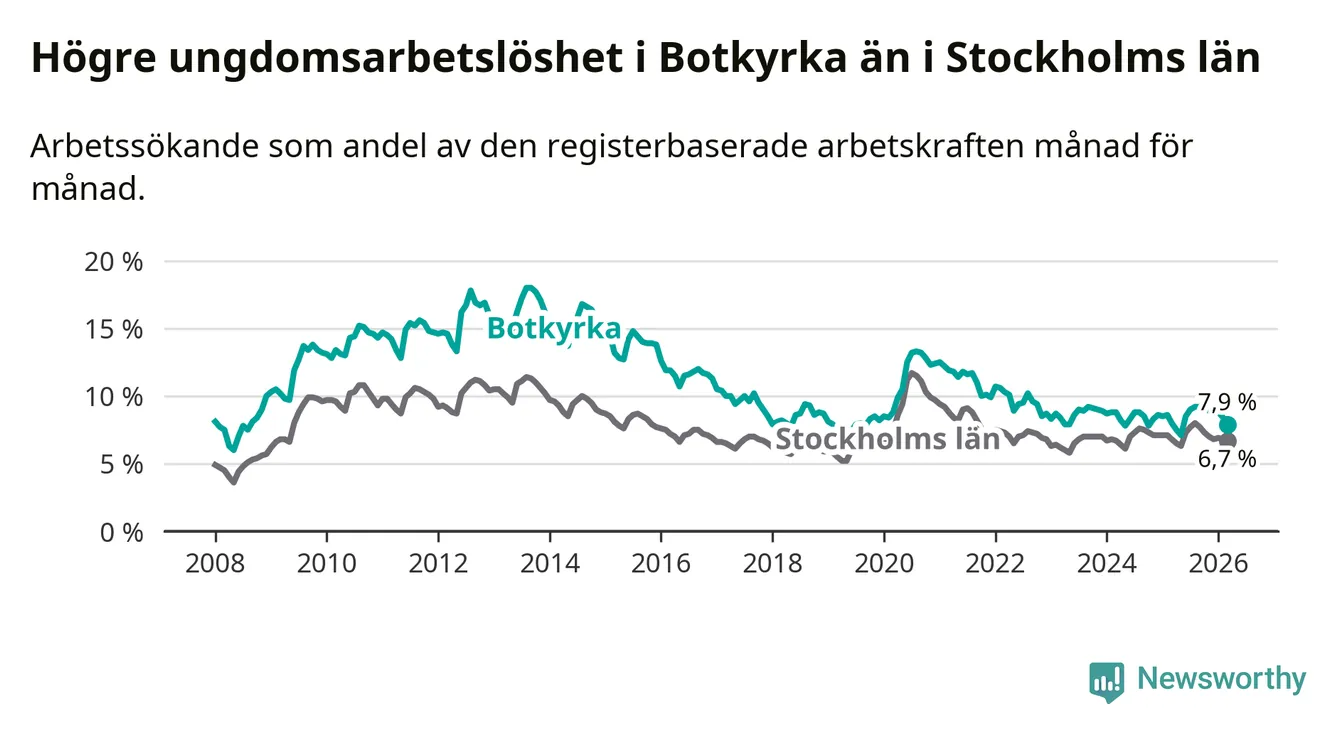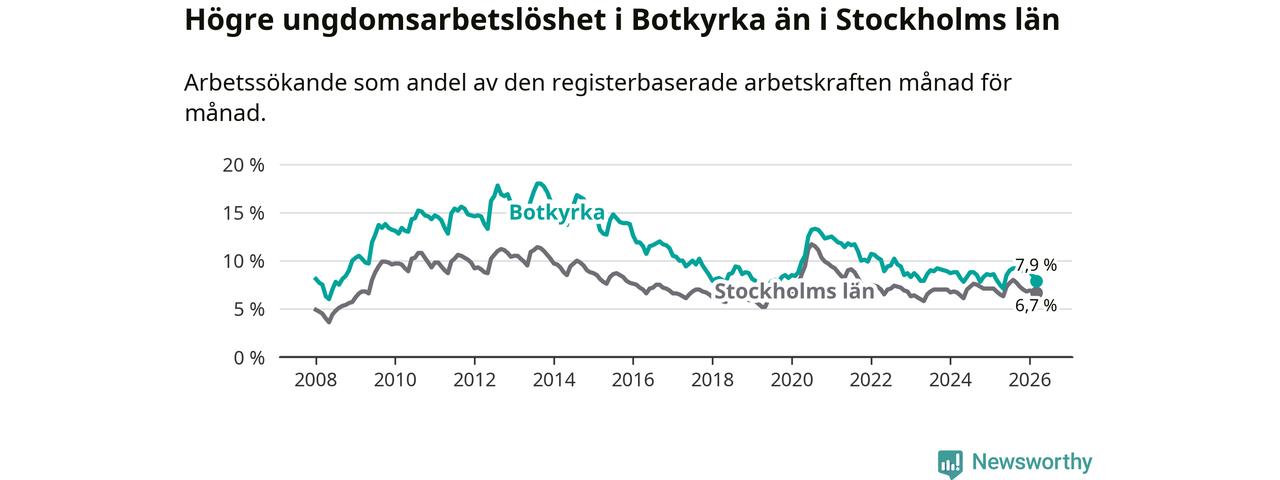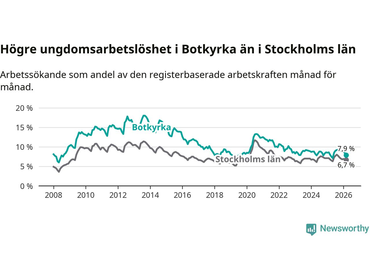 Precis som den totala arbetslösheten ligger ungdomsarbetslösheten i Botkyrka högre än i Stockholms län som helhet. Skillnaden mellan kommunen och länet är 1,2 procentenheter.
