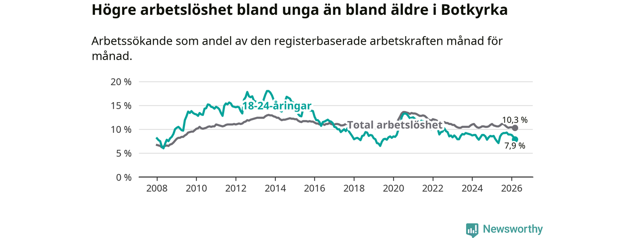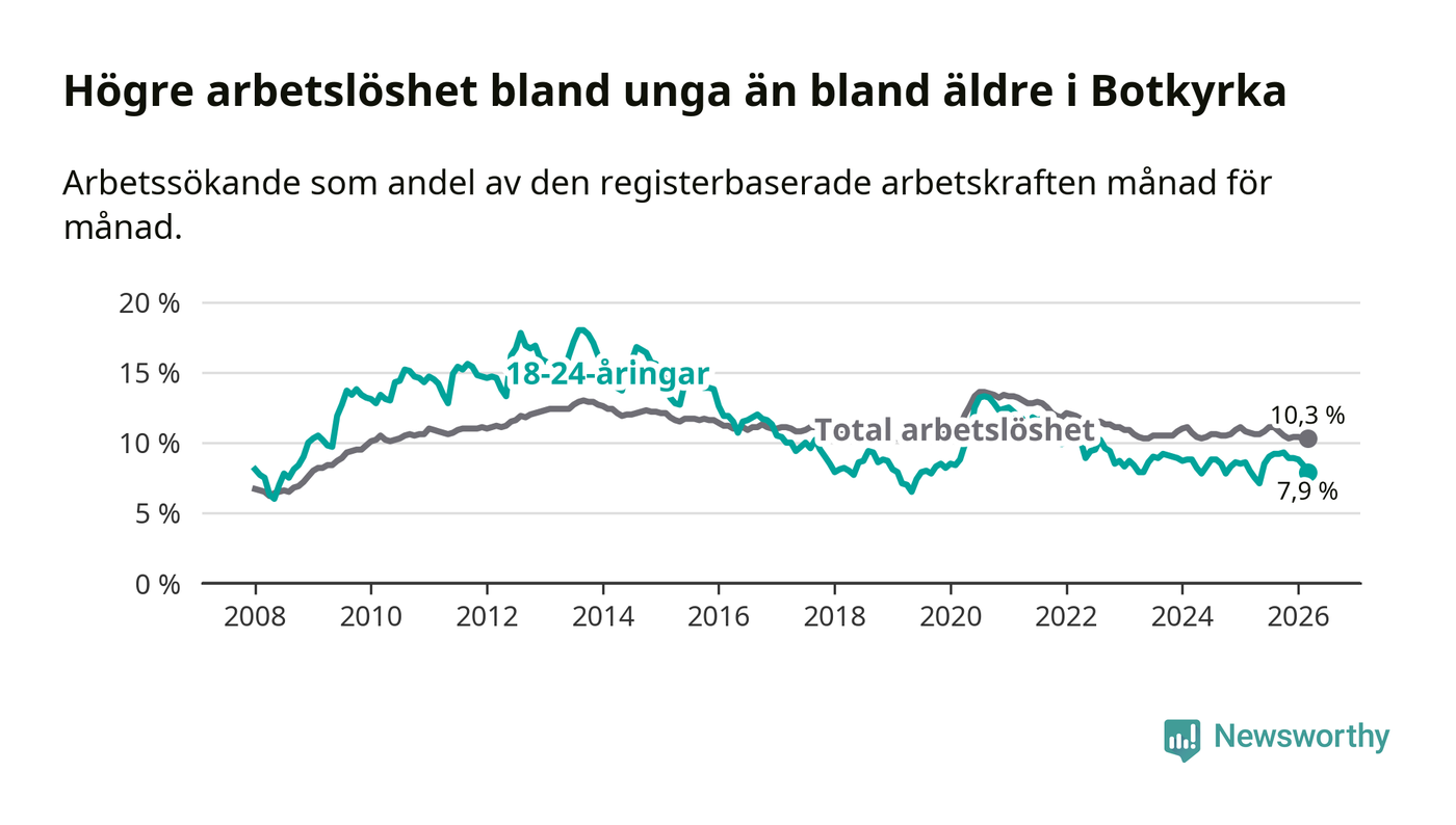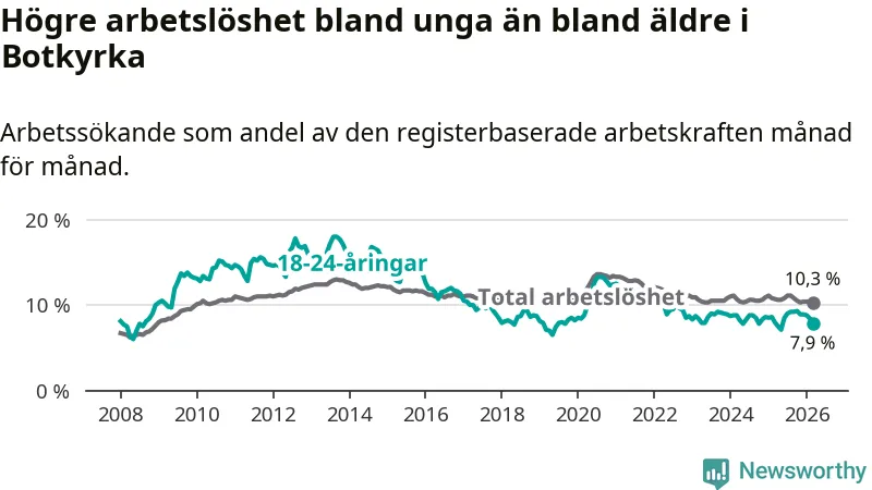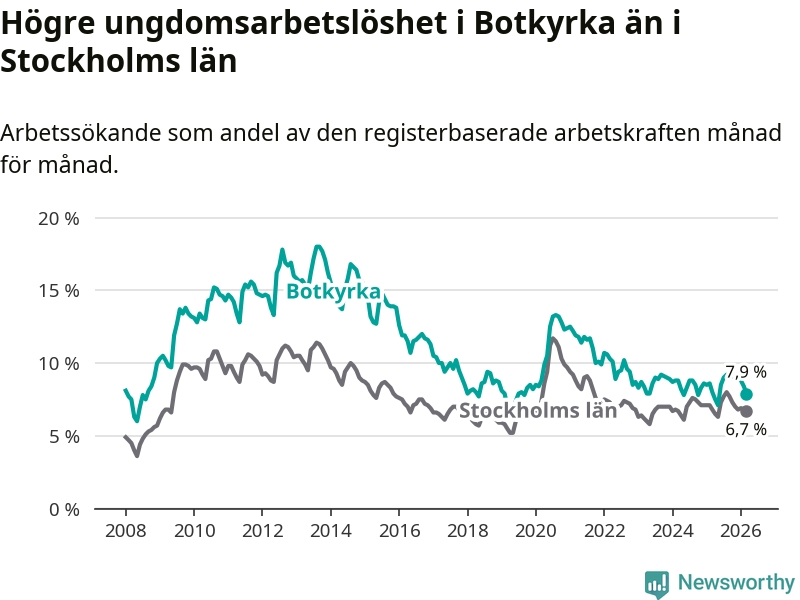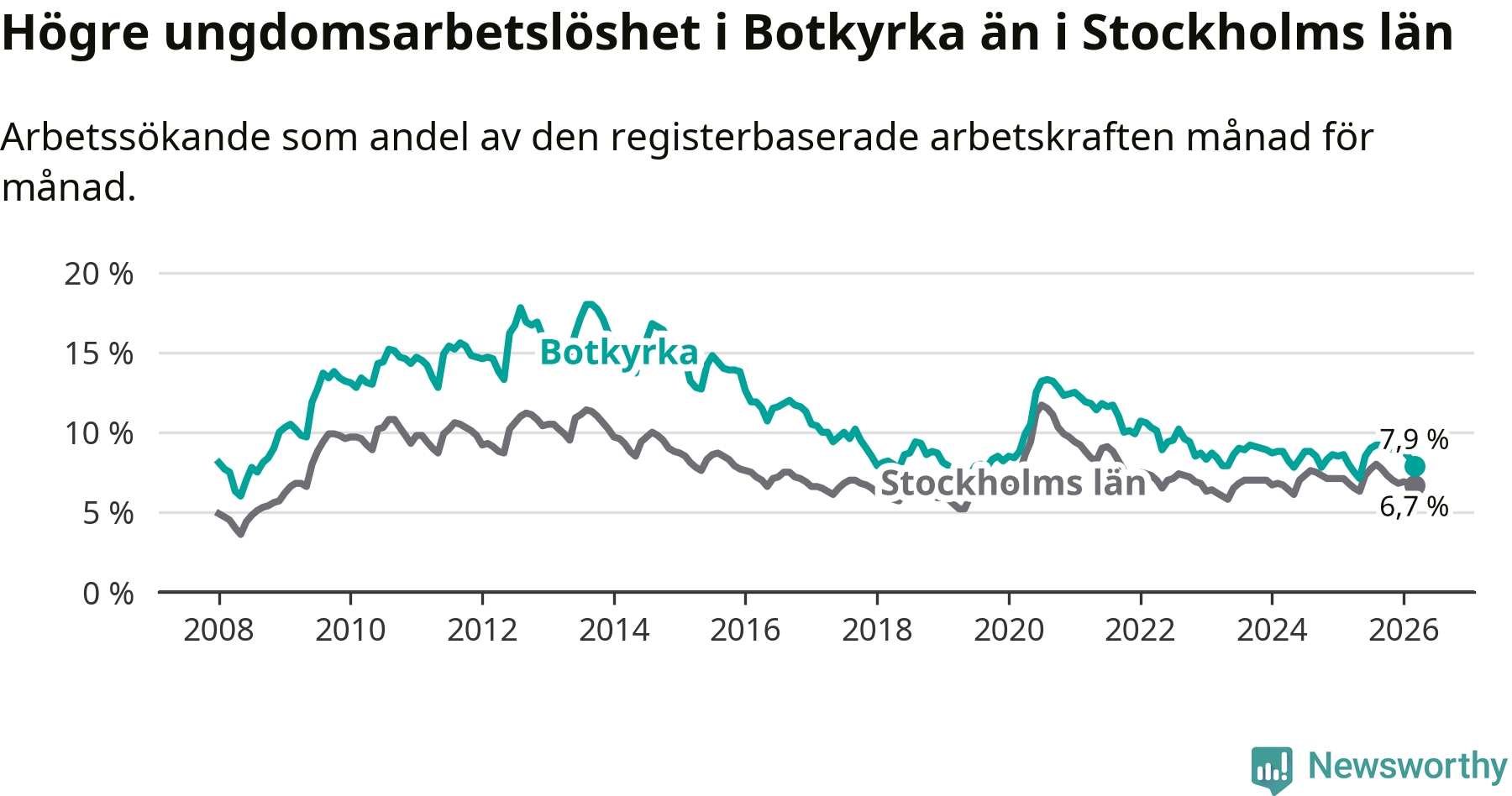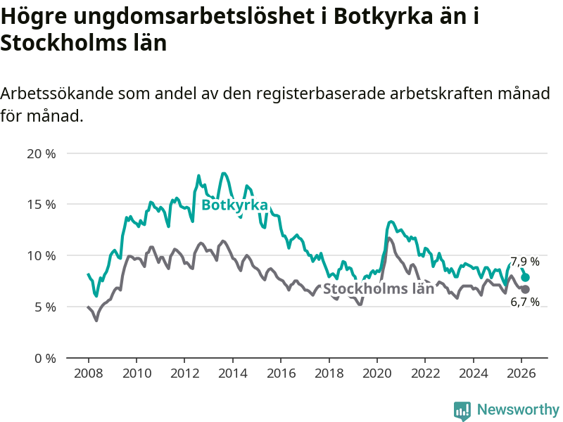 Precis som den totala arbetslösheten ligger ungdomsarbetslösheten i Botkyrka högre än i Stockholms län som helhet. Skillnaden mellan kommunen och länet är 1,2 procentenheter.