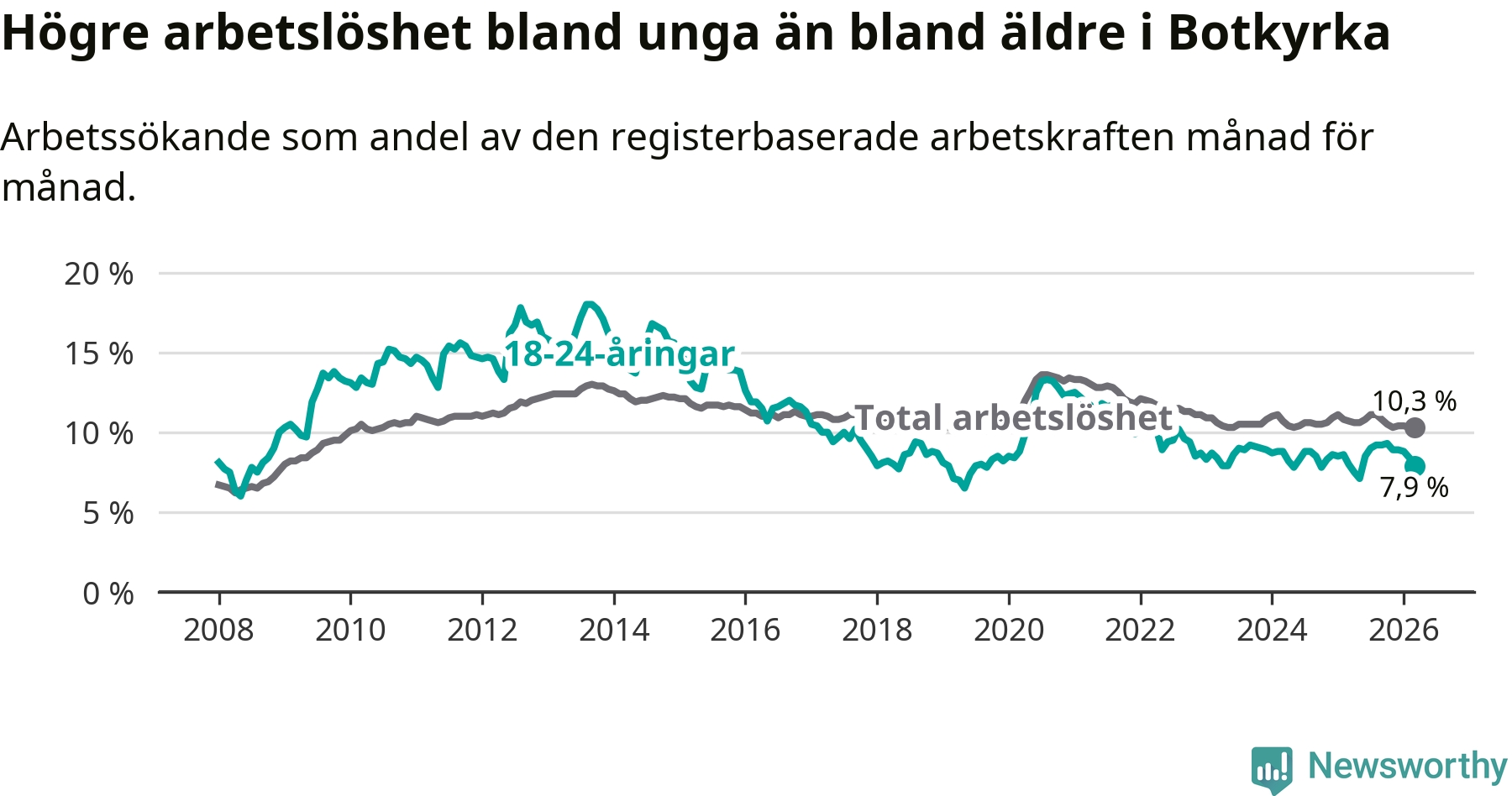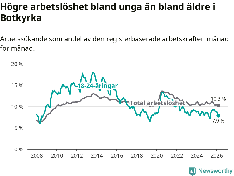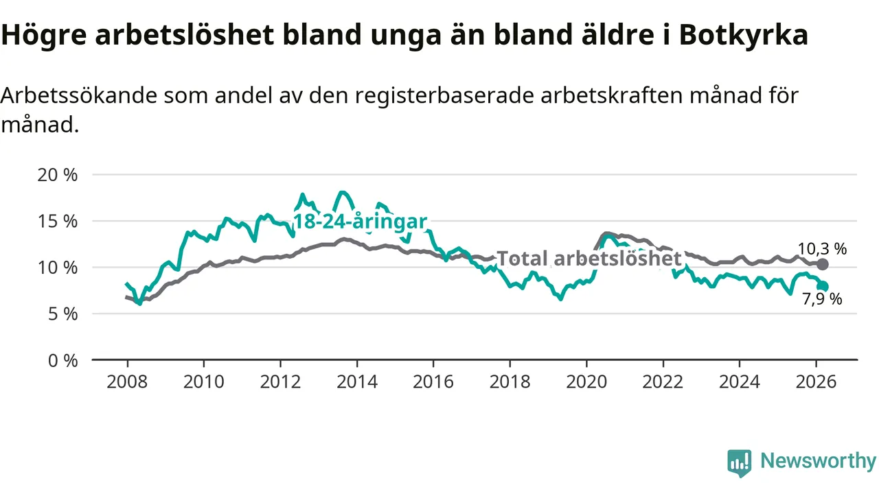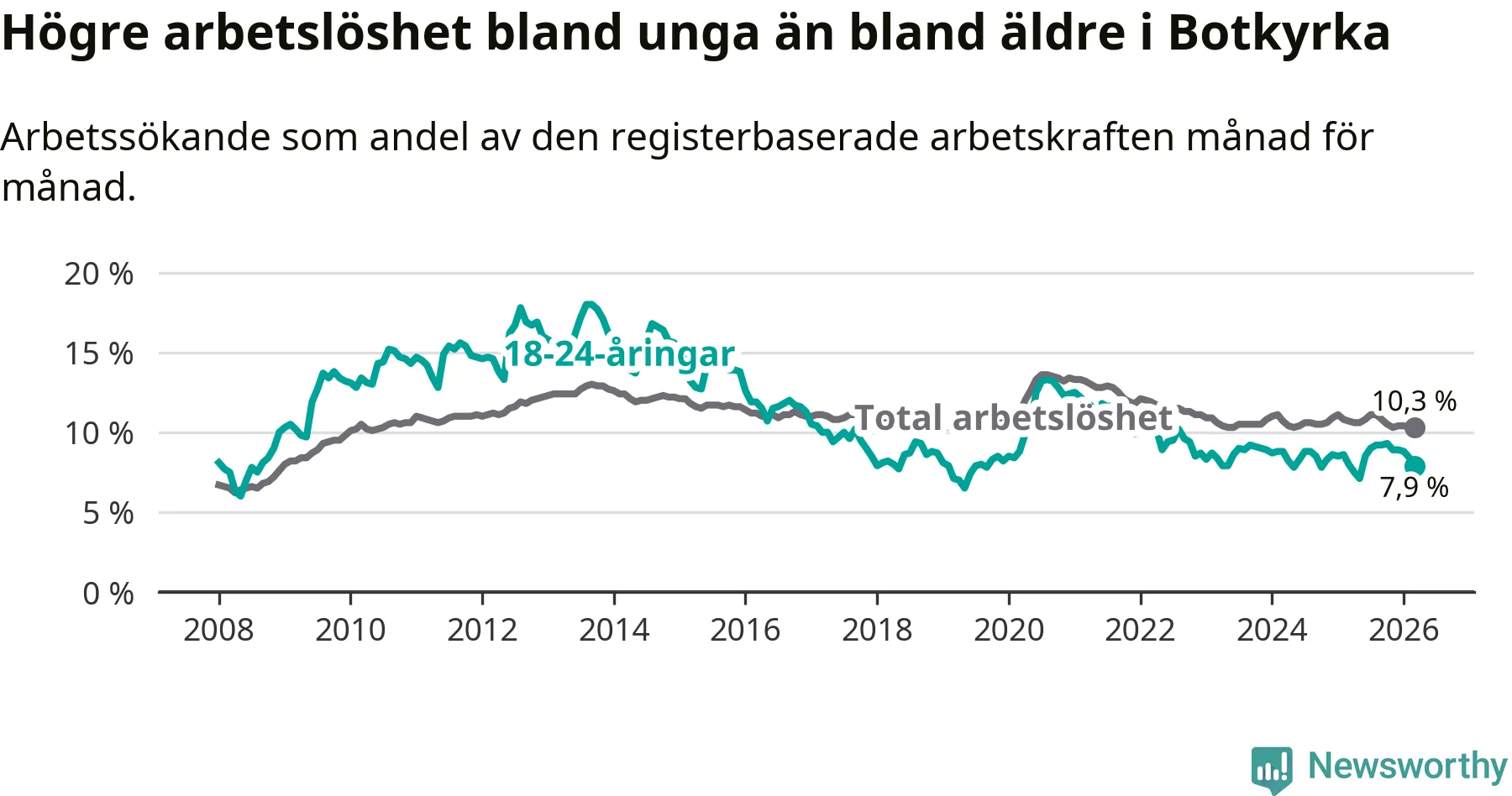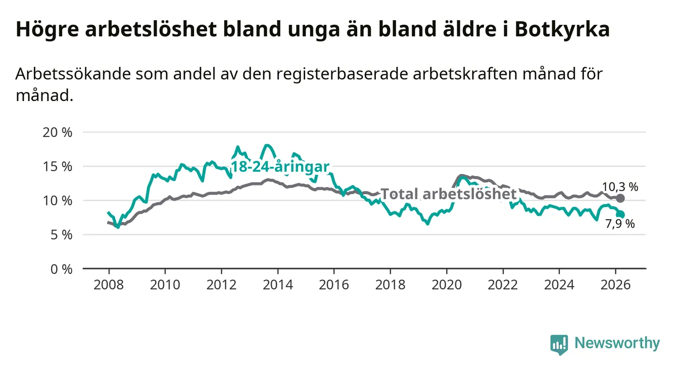 Precis som den totala arbetslösheten ligger ungdomsarbetslösheten i Botkyrka högre än i Stockholms län som helhet. Skillnaden mellan kommunen och länet är 1,2 procentenheter.