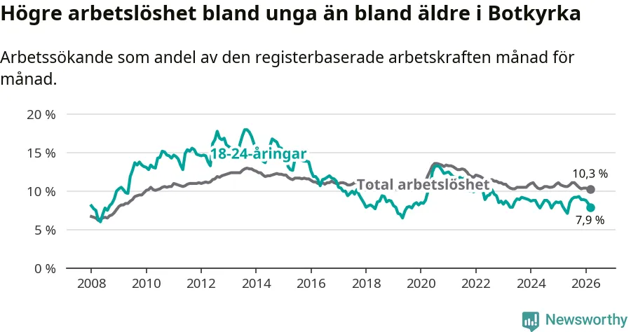 Precis som den totala arbetslösheten sjunker arbetslösheten bland unga (−0,1 procentenheter). I mars var 7,9 procent av 18–24-åringarna inskrivna som arbetssökande (motsvarande 412 personer). Mäter vi antalet inskrivna ser vi en minskning med tre personer på ett års sikt.