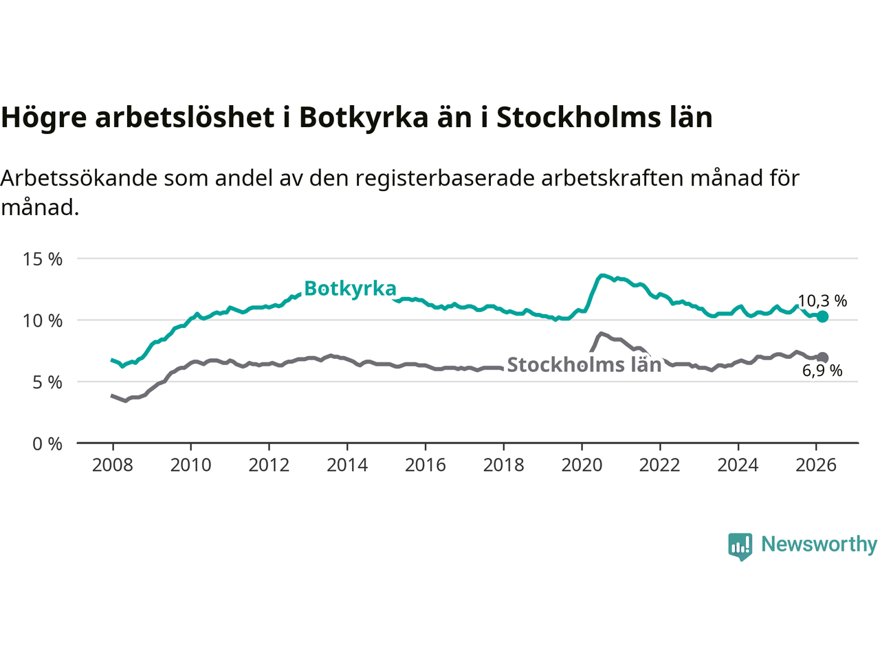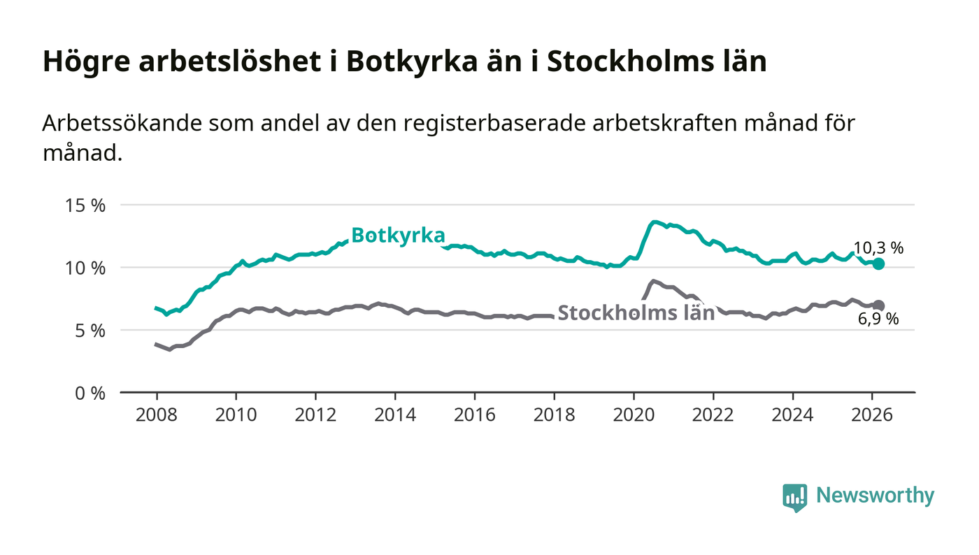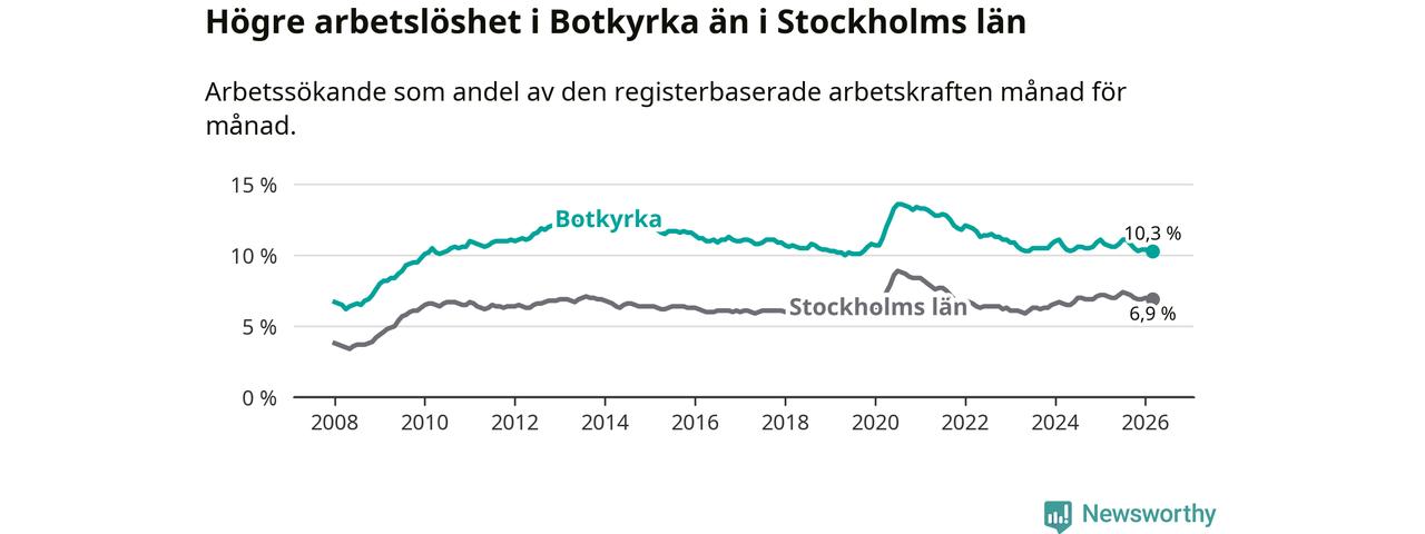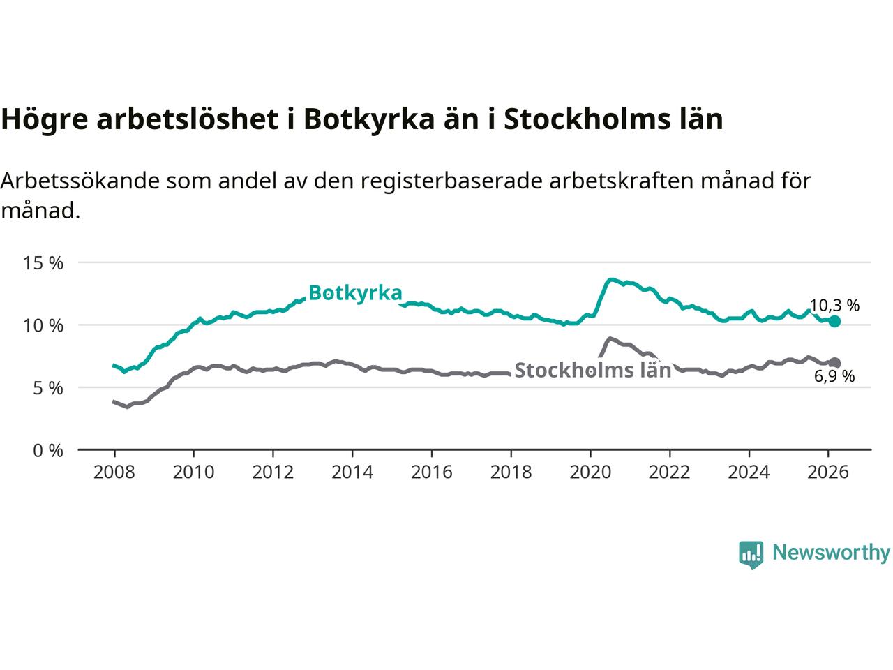 Under mars månad rapporterade Botkyrka kommun en total arbetslöshet på 10,3 procent. Det är en minskning jämfört med samma tidpunkt i fjol (−0,4 procentenheter). Även i Stockholms län sjunker arbetslösheten något.