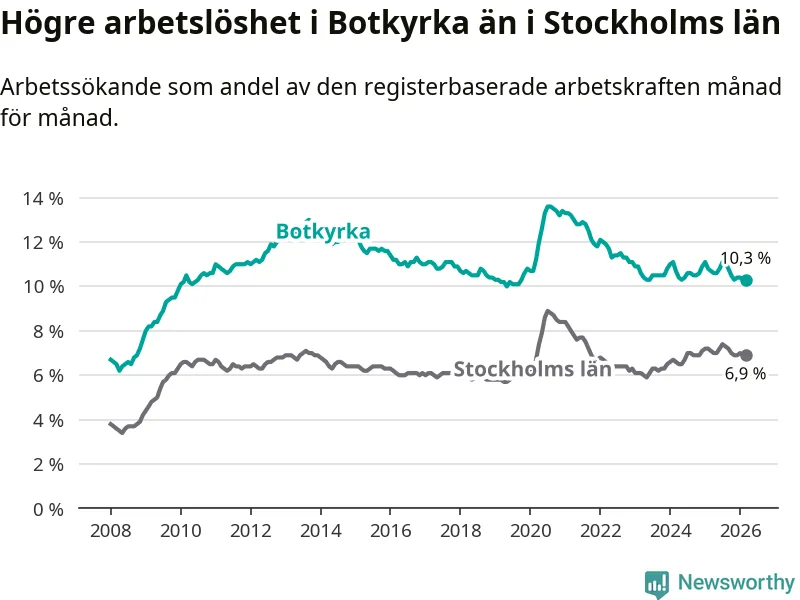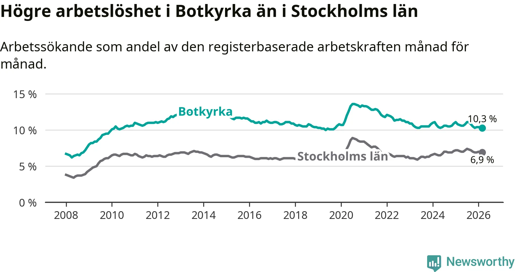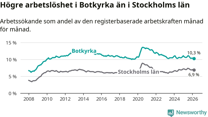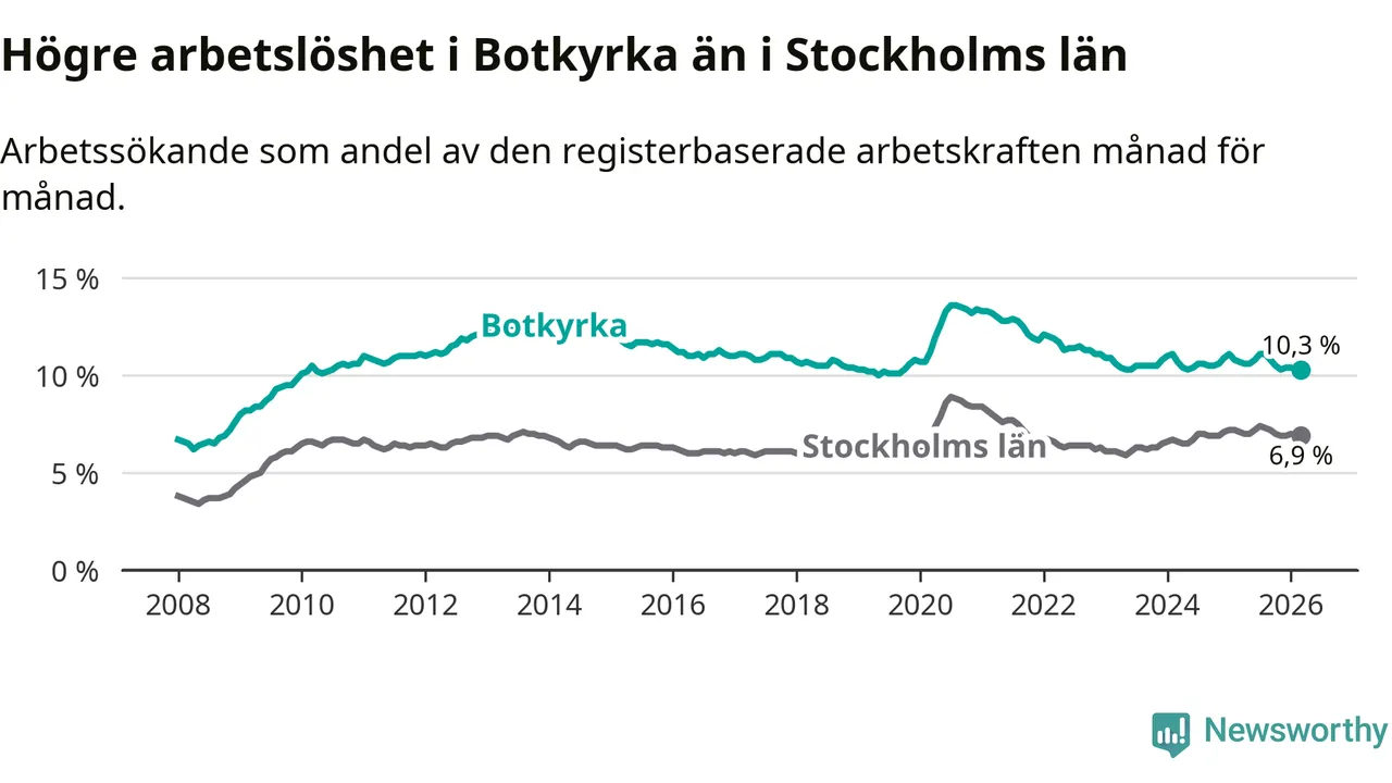 Under mars månad rapporterade Botkyrka kommun en total arbetslöshet på 10,3 procent. Det är en minskning jämfört med samma tidpunkt i fjol (−0,4 procentenheter). Även i Stockholms län sjunker arbetslösheten något.