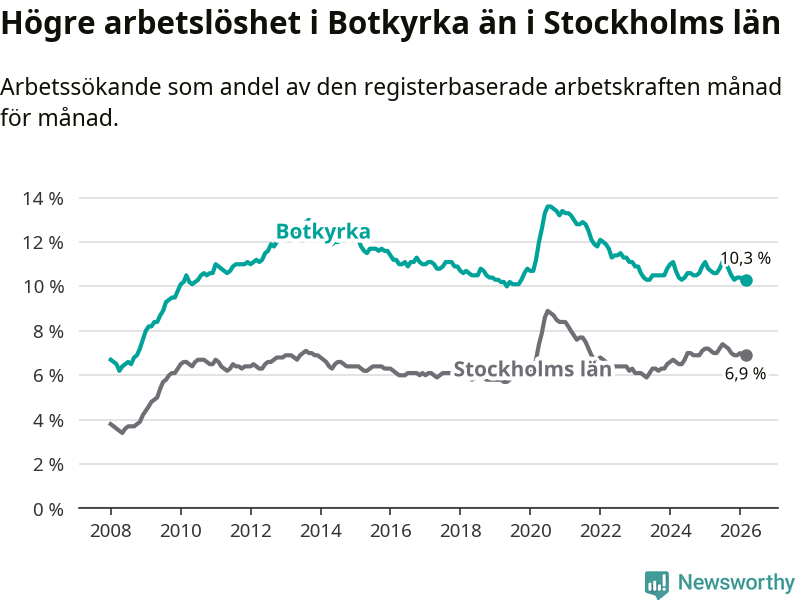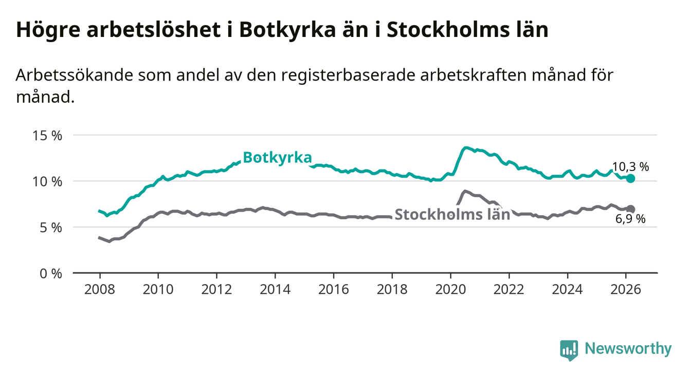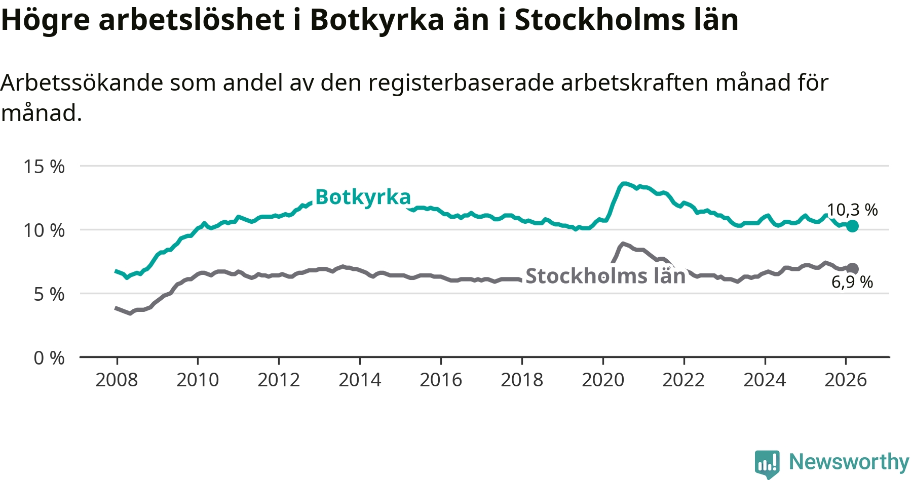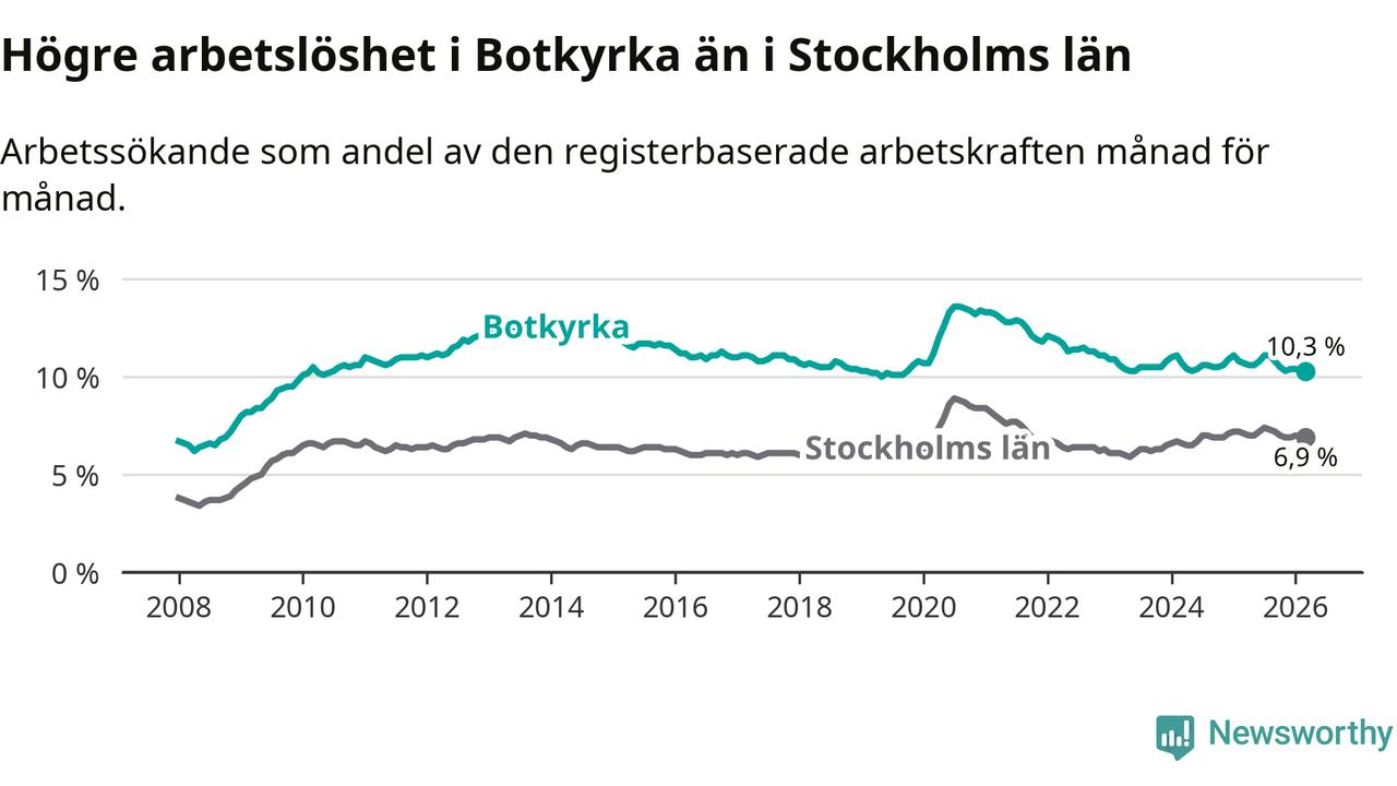 Även om arbetslösheten i Botkyrka alltså minskar, så ligger den fortfarande över snittet i hela Stockholms län (10,3 procent i kommunen, jämfört med 6,9 procent i hela länet). Ekerö har den lägsta arbetslösheten i länet (3,6 procent), medan Södertälje har den högsta (10,8 procent). För att Botkyrka skulle komma ner i samma arbetslöshetsnivå som Ekerö skulle 3 306 personer behöva sysselsättas.