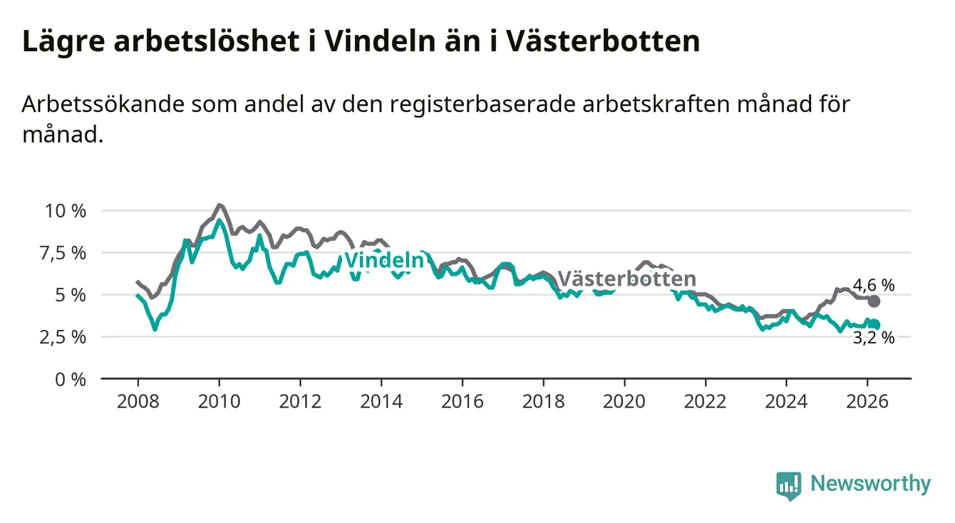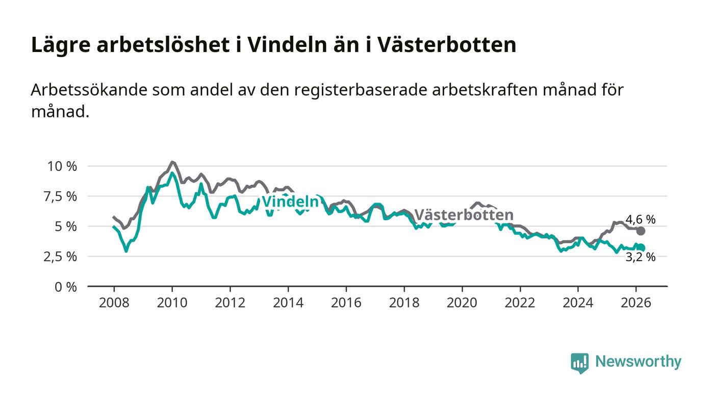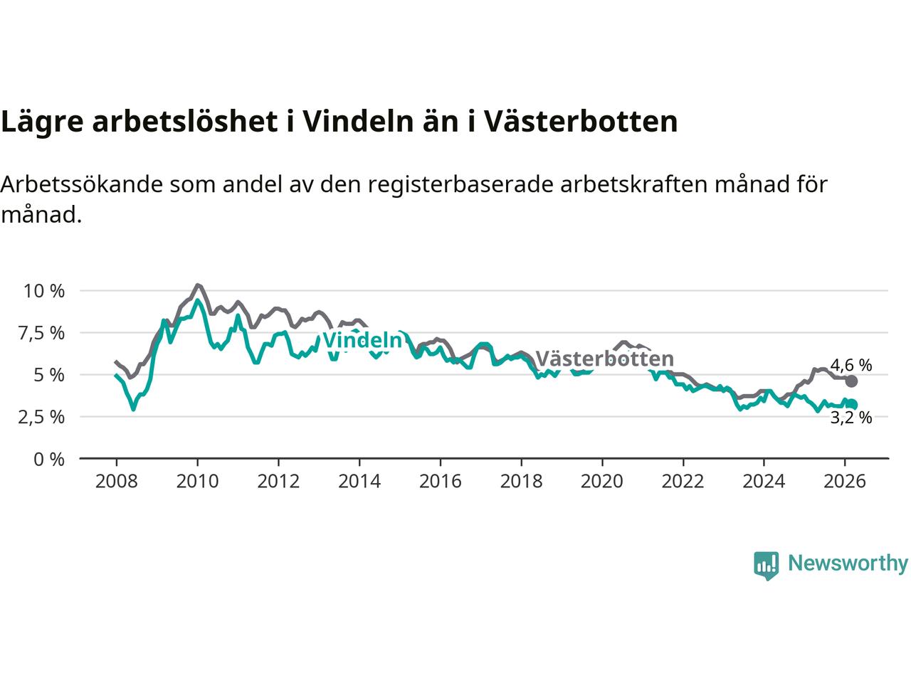 Under mars månad rapporterade Vindelns kommun en total arbetslöshet på 3,2 procent. Det är en minskning jämfört med samma tidpunkt i fjol (−0,1 procentenheter). Även i Västerbottens län sjunker arbetslösheten något.