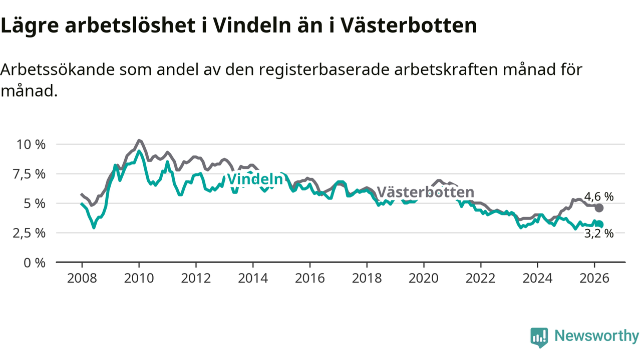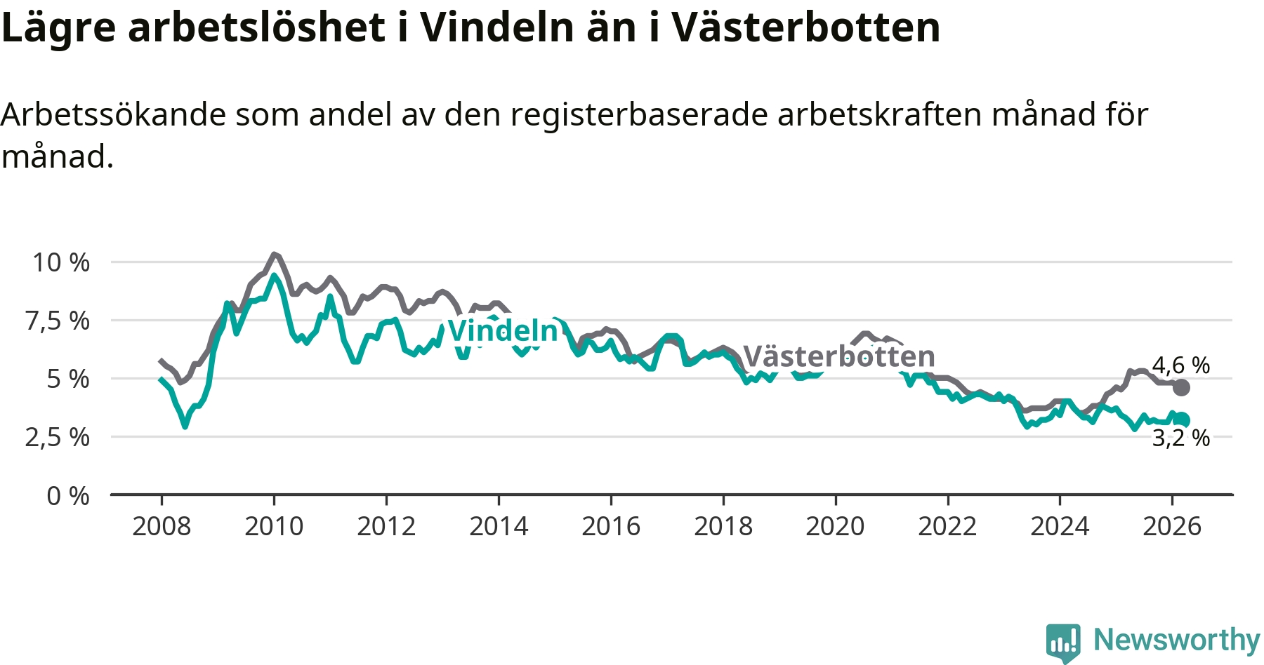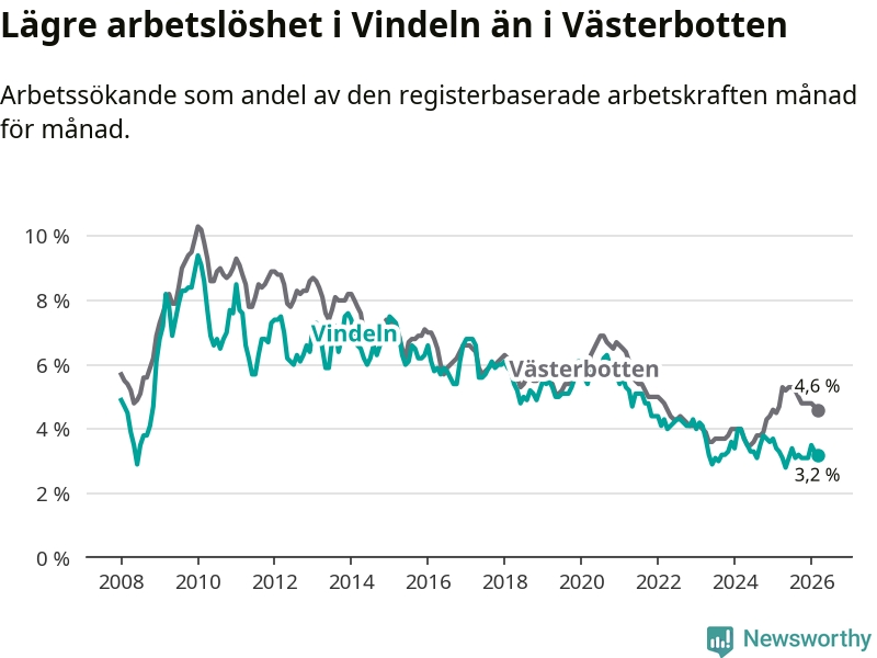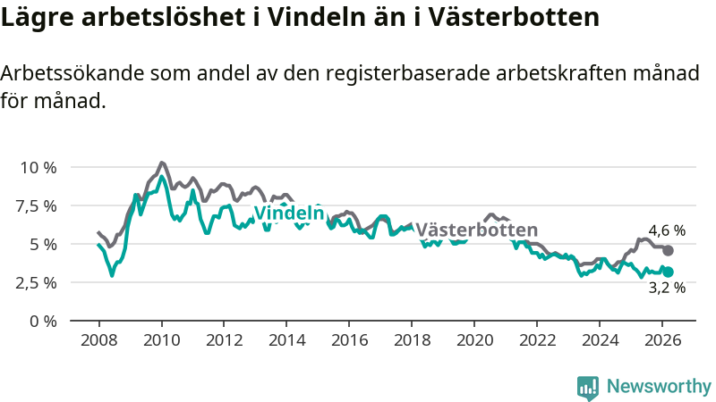 Under mars månad rapporterade Vindelns kommun en total arbetslöshet på 3,2 procent. Det är en minskning jämfört med samma tidpunkt i fjol (−0,1 procentenheter). Även i Västerbottens län sjunker arbetslösheten något.