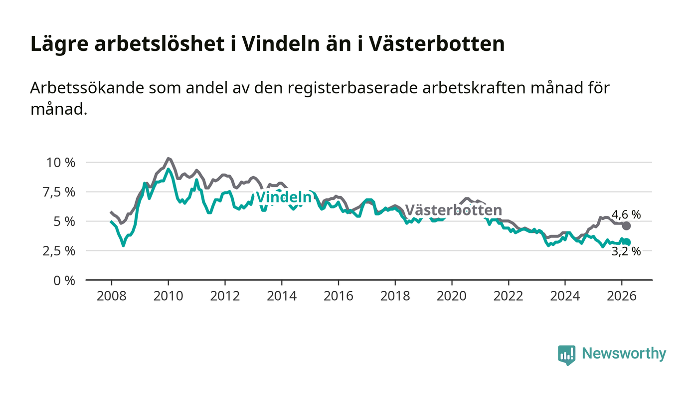 Vindeln hade redan tidigare lägre arbetslöshet än snittet i hela Västerbottens län och nu växer klyftan (3,2 procent i kommunen, jämfört med 4,6 procent i hela länet). Sorsele har den lägsta arbetslösheten i länet (2,7 procent), medan Skellefteå har den högsta (5,9 procent). För att Vindeln skulle komma ner i samma arbetslöshetsnivå som Sorsele skulle 13 personer behöva sysselsättas.