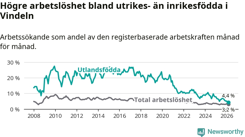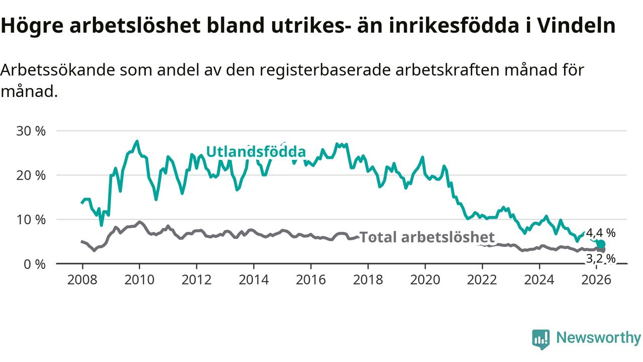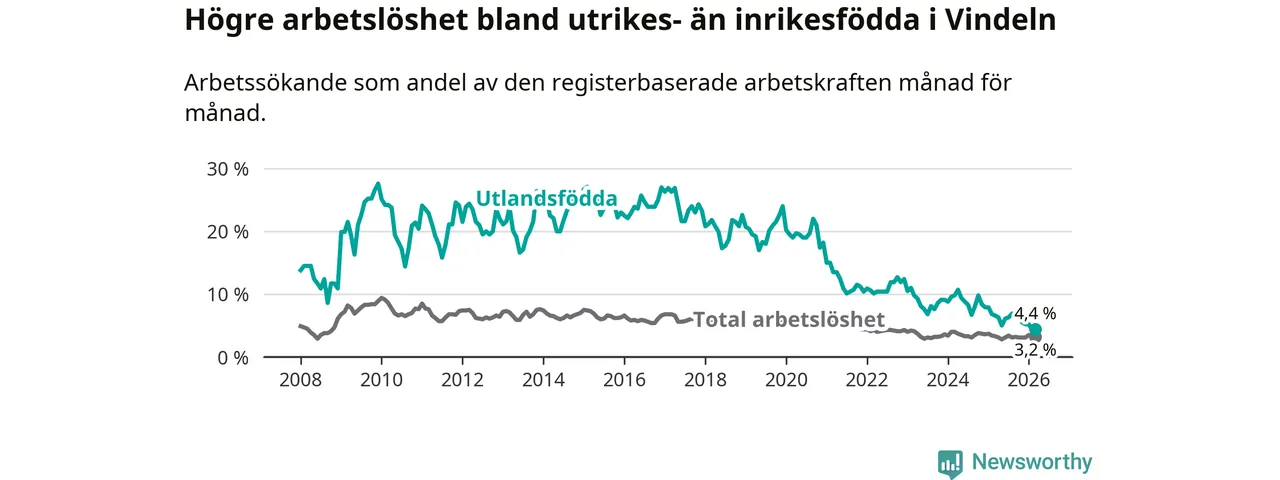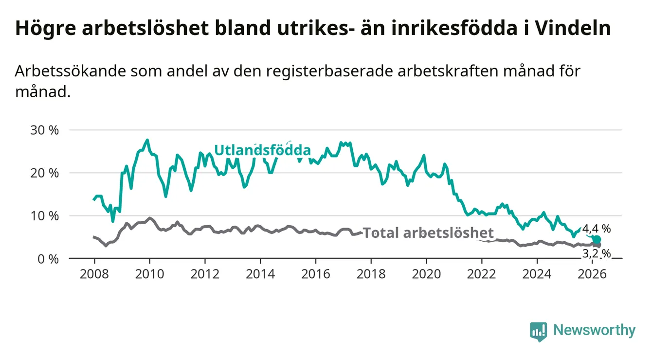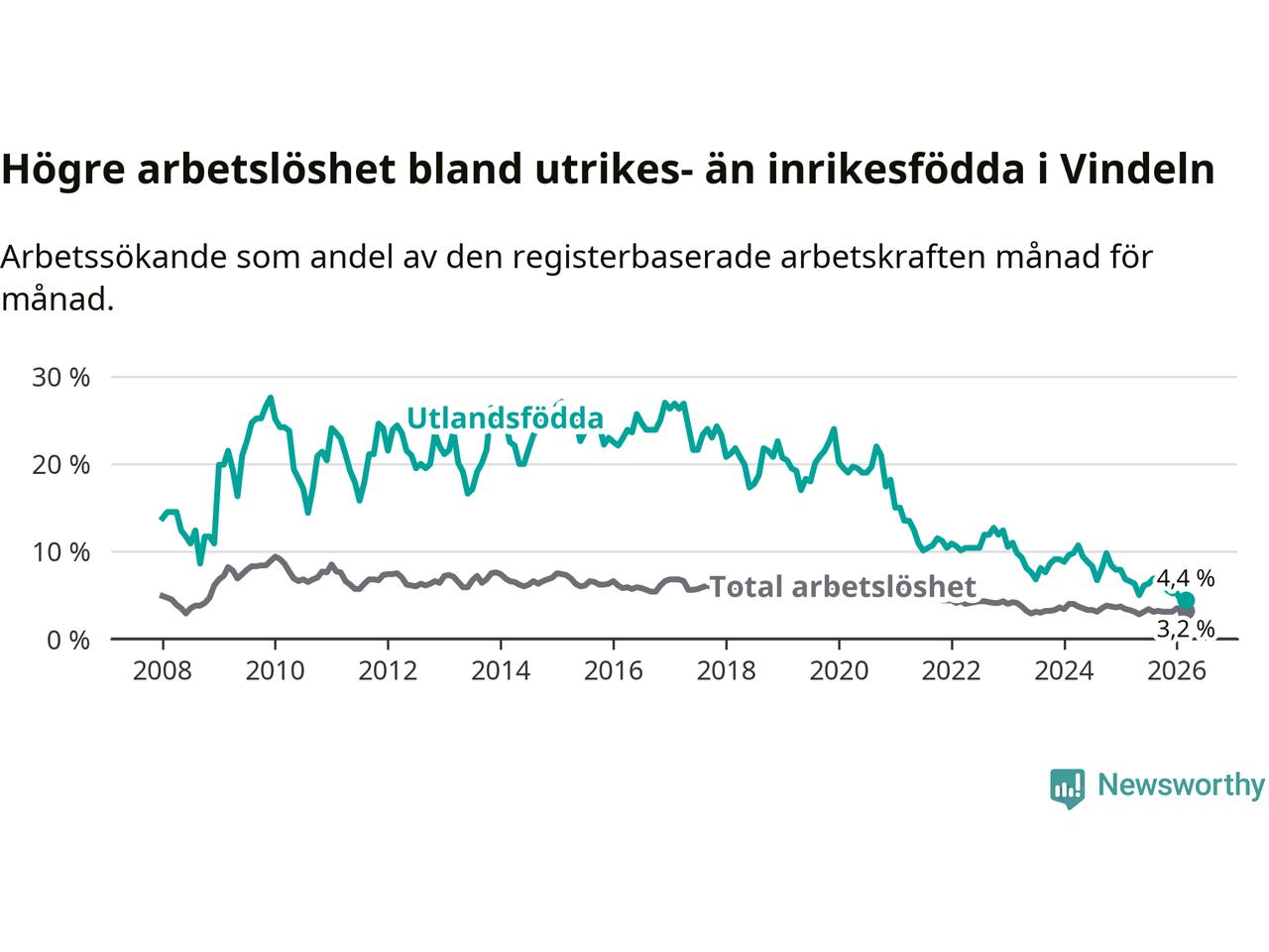 Arbetslösheten bland utlandsfödda var 4,4 procent i Vindeln under mars månad, motsvarande 16 av 364 personer. Det är 2,2 procentenheter färre än vid samma tidpunkt i fjol (−8 om man räknar personer). Därmed är de utlandsföddas arbetslöshet lägre än vid samma tidpunkt i fjol för sjunde månaden i följd. Sedan augusti 2025 har arbetslösheten bland utlandsfödda minskat från 6,9 till 4,4 procent.