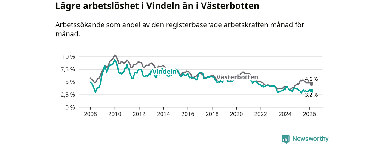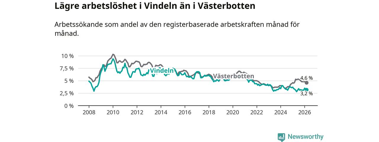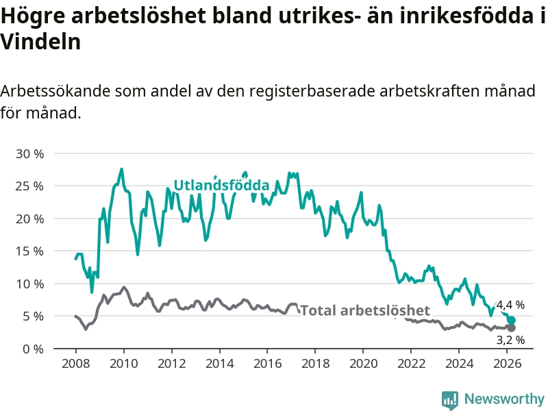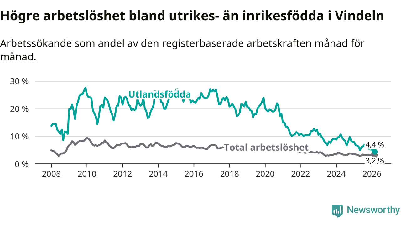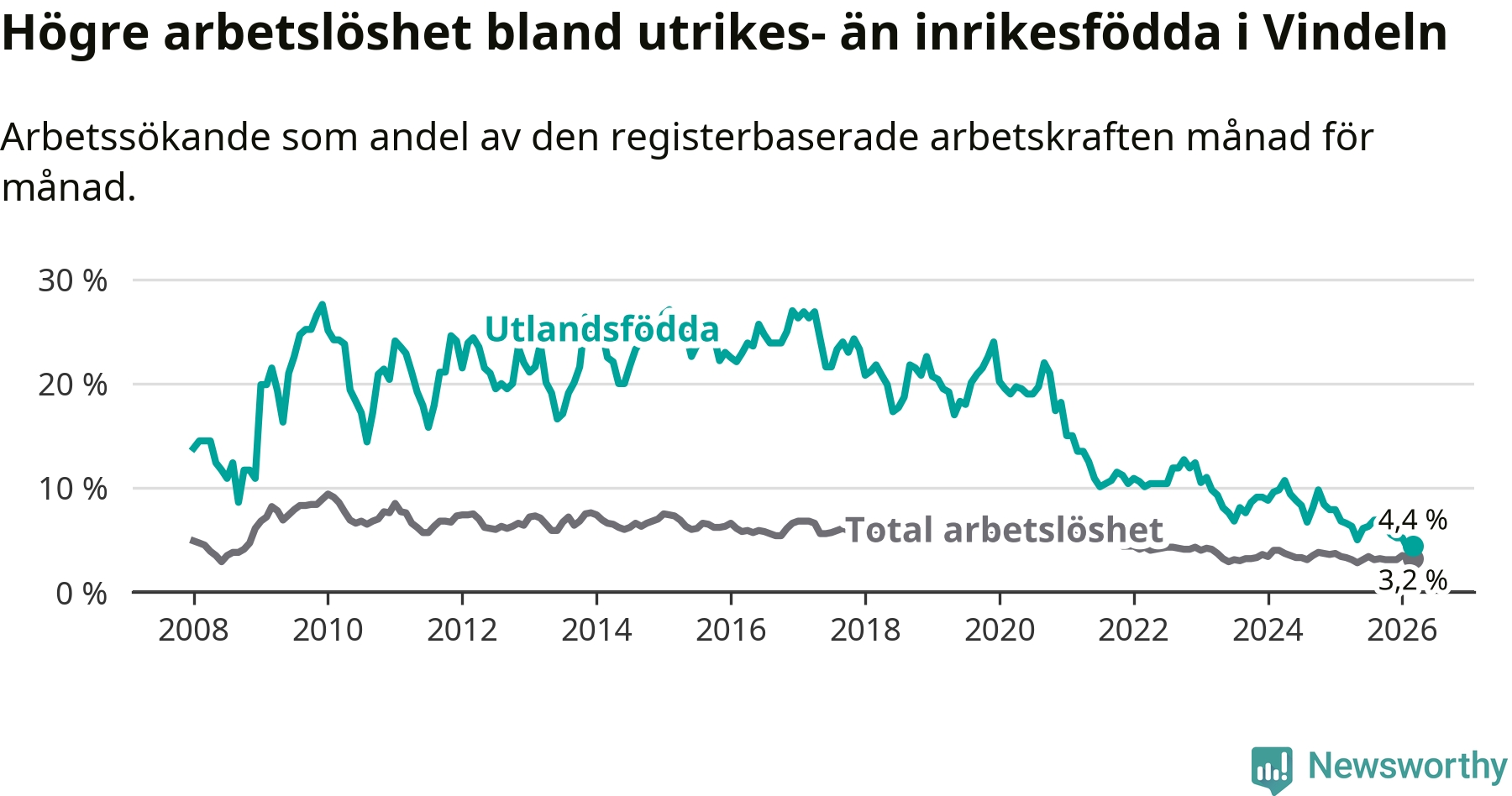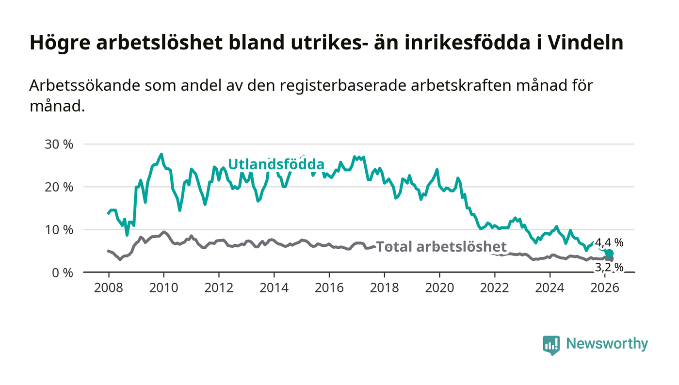 Arbetslösheten bland utlandsfödda var 4,4 procent i Vindeln under mars månad, motsvarande 16 av 364 personer. Det är 2,2 procentenheter färre än vid samma tidpunkt i fjol (−8 om man räknar personer). Därmed är de utlandsföddas arbetslöshet lägre än vid samma tidpunkt i fjol för sjunde månaden i följd. Sedan augusti 2025 har arbetslösheten bland utlandsfödda minskat från 6,9 till 4,4 procent.