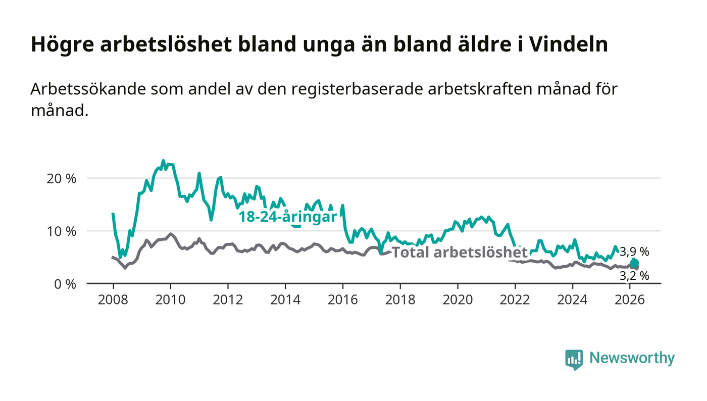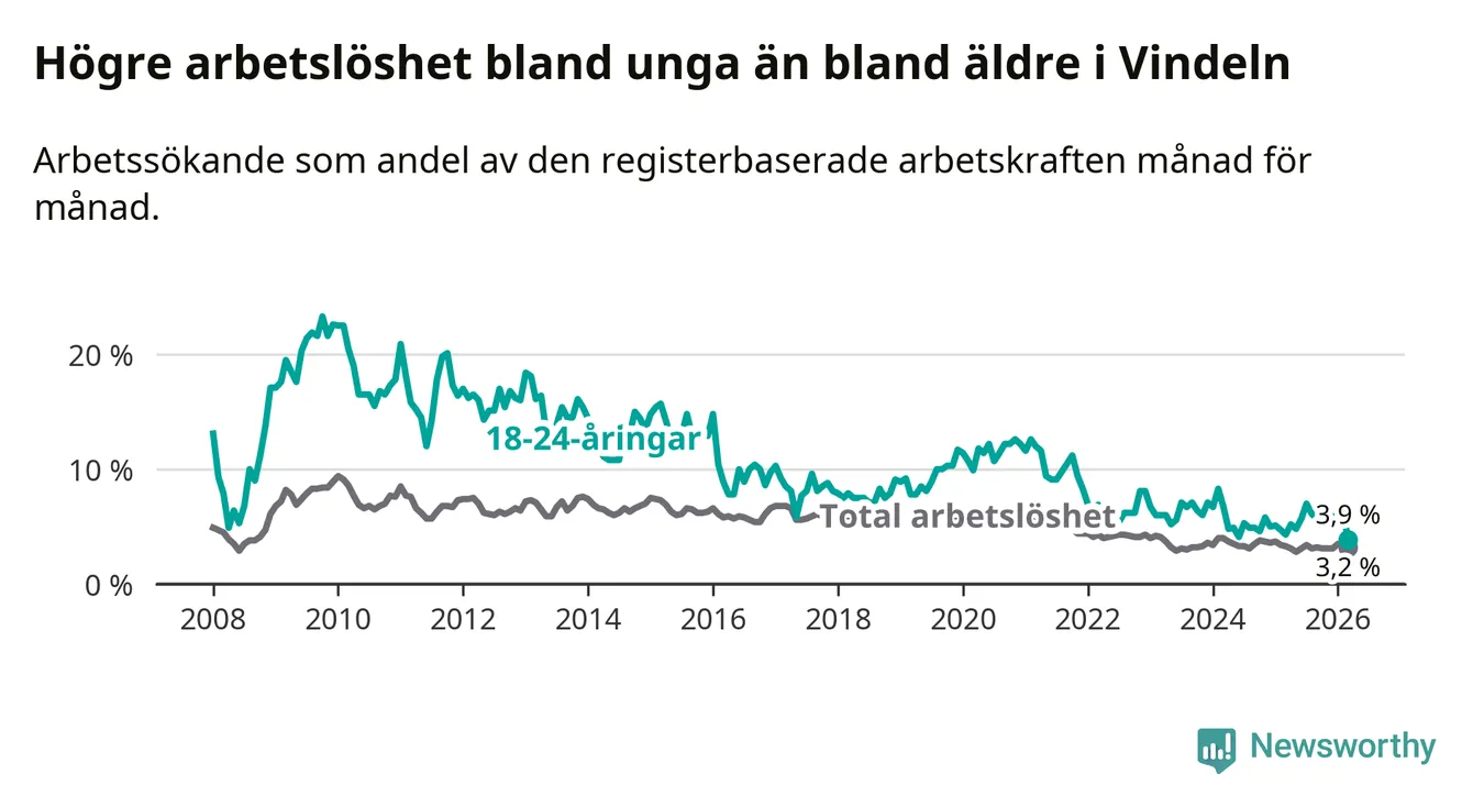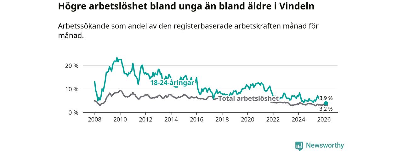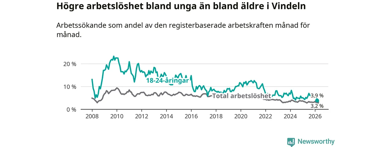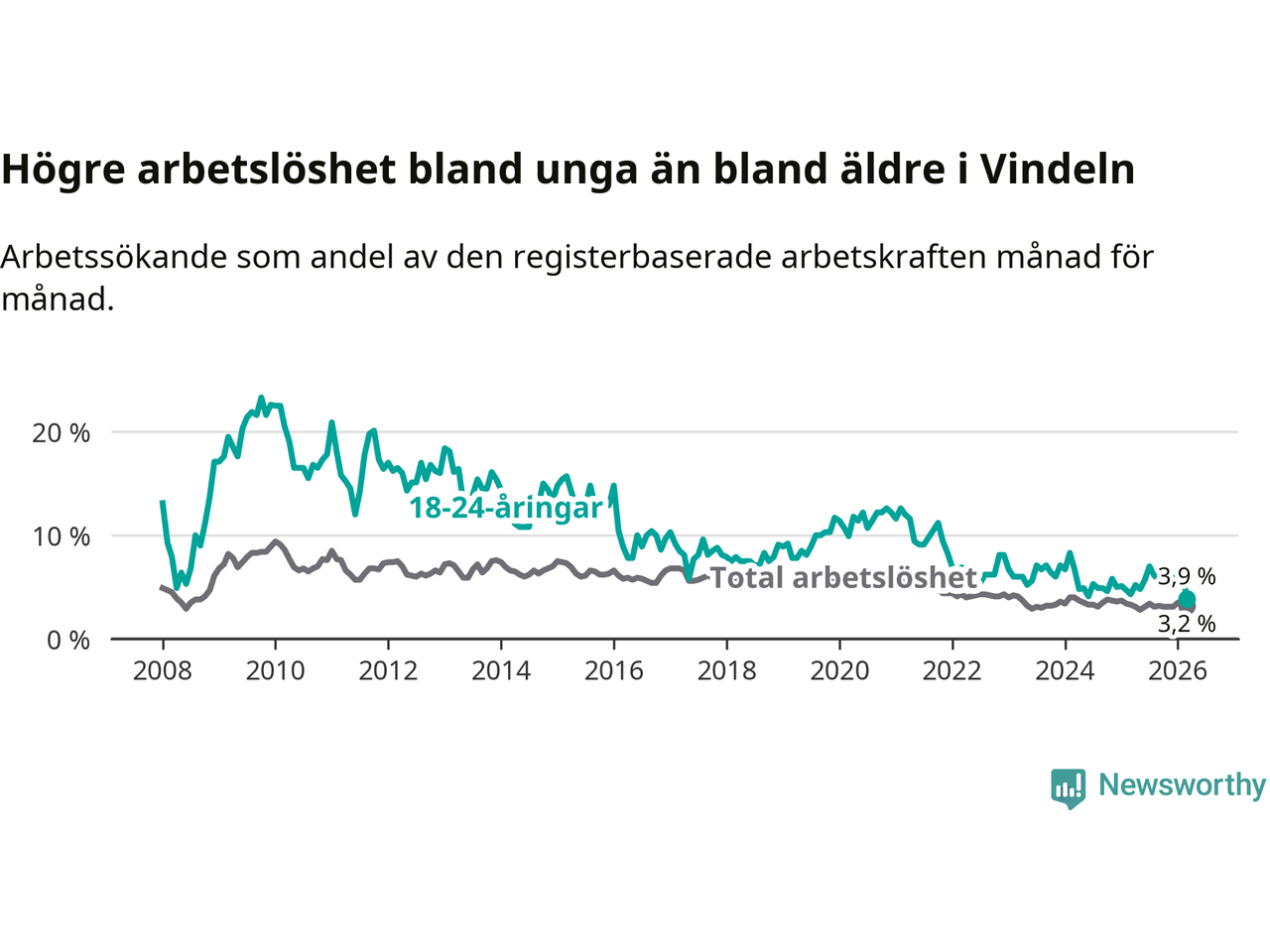 Den senaste månadsstatistiken från Arbetsförmedlingen visar på en nedgång i ungdoms­arbetslöshet i Vindelns kommun med 0,4 procentenheter. Arbetslösheten bland personer i åldern 18–24 år låg i mars på 3,9 procent.