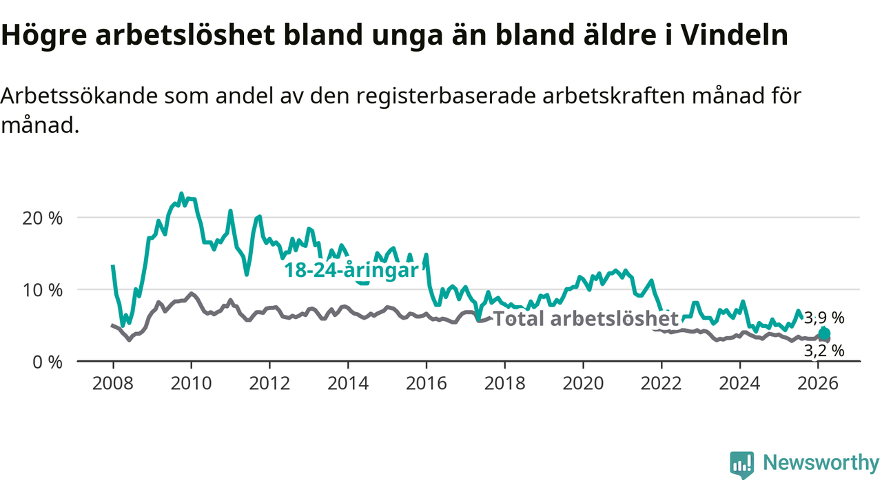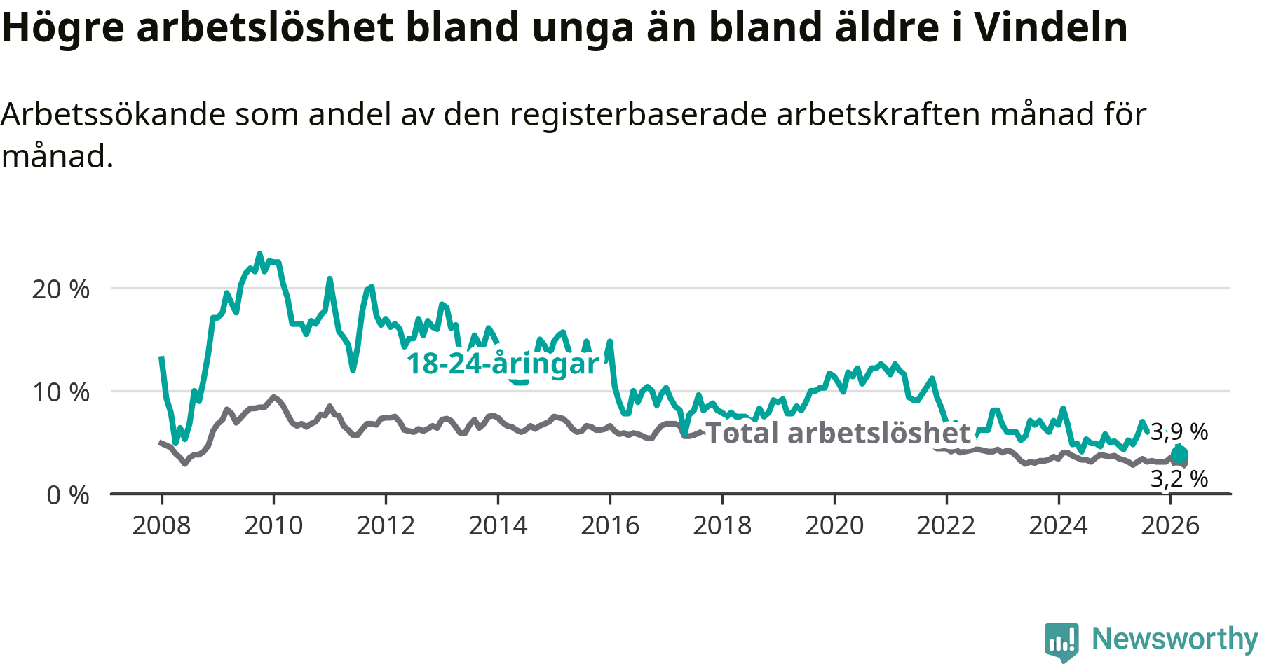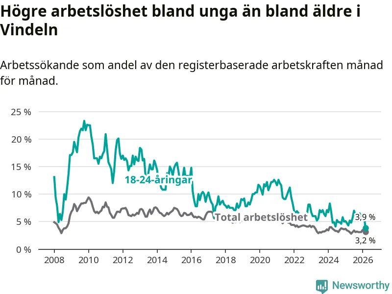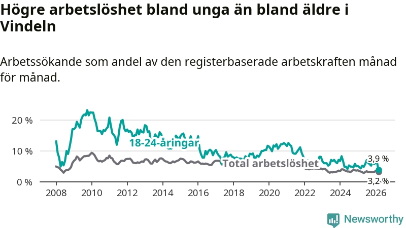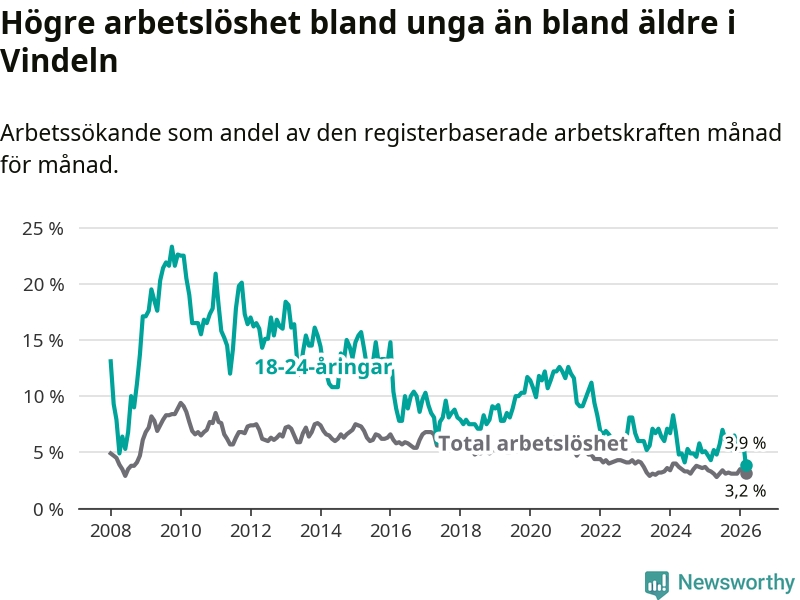 Den senaste månadsstatistiken från Arbetsförmedlingen visar på en nedgång i ungdoms­arbetslöshet i Vindelns kommun med 0,4 procentenheter. Arbetslösheten bland personer i åldern 18–24 år låg i mars på 3,9 procent.