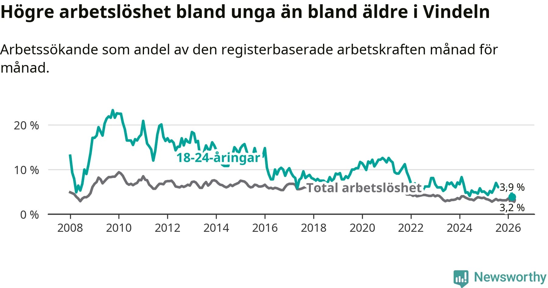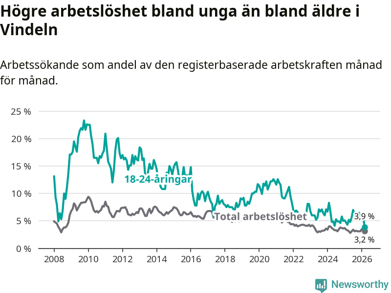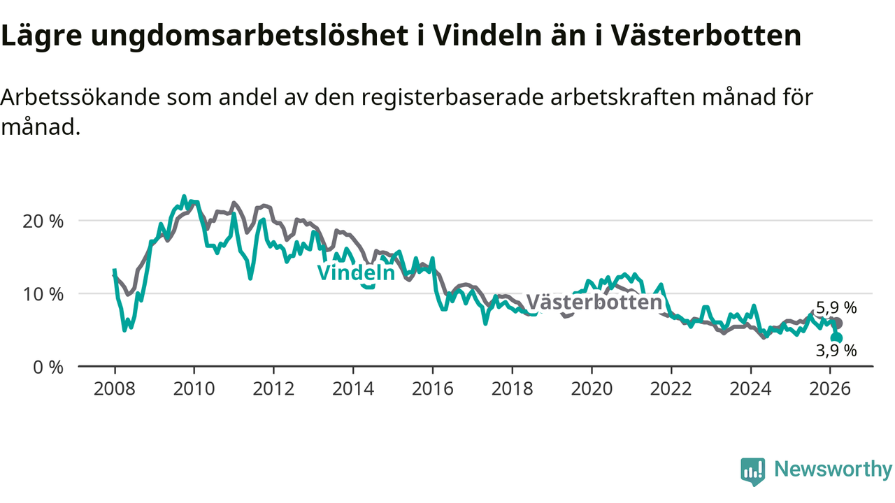 Graf: Arbetslöshet bland unga i Vindelns kommun och Västerbottens län