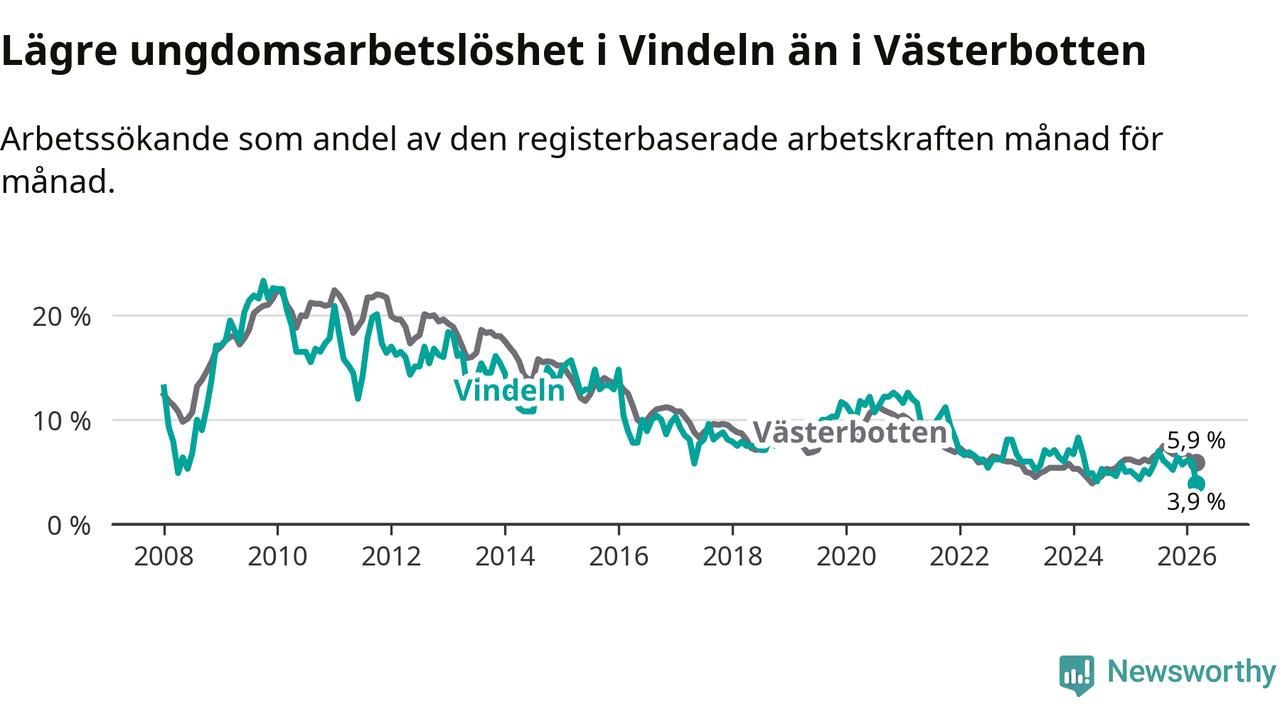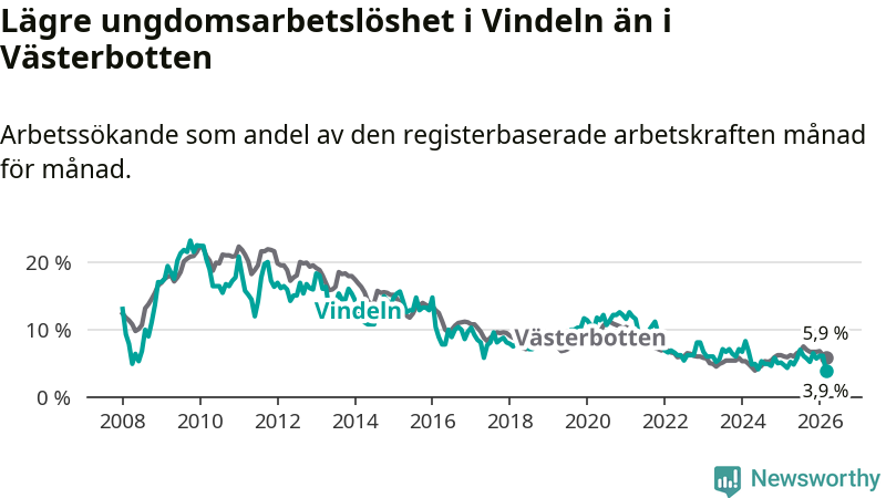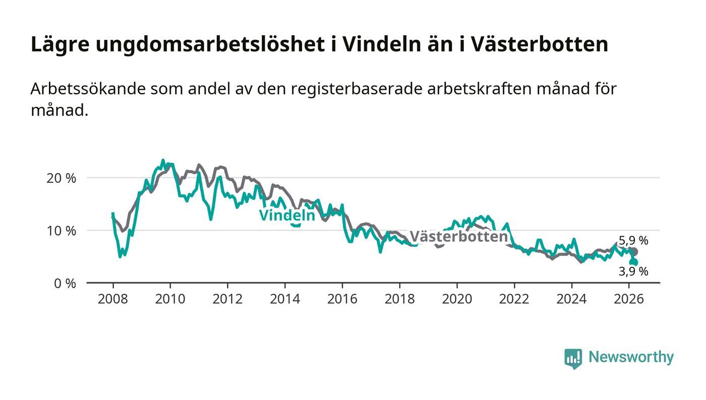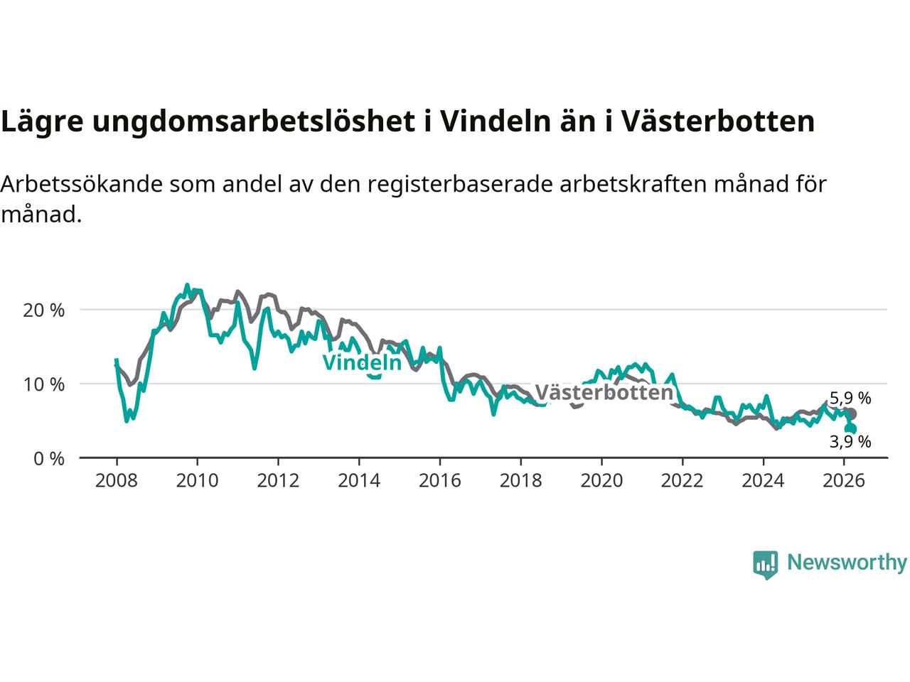 Precis som den totala arbetslösheten ligger ungdomsarbetslösheten i Vindeln lägre än i Västerbotten som helhet. Skillnaden mellan kommunen och länet är 2,0 procentenheter.