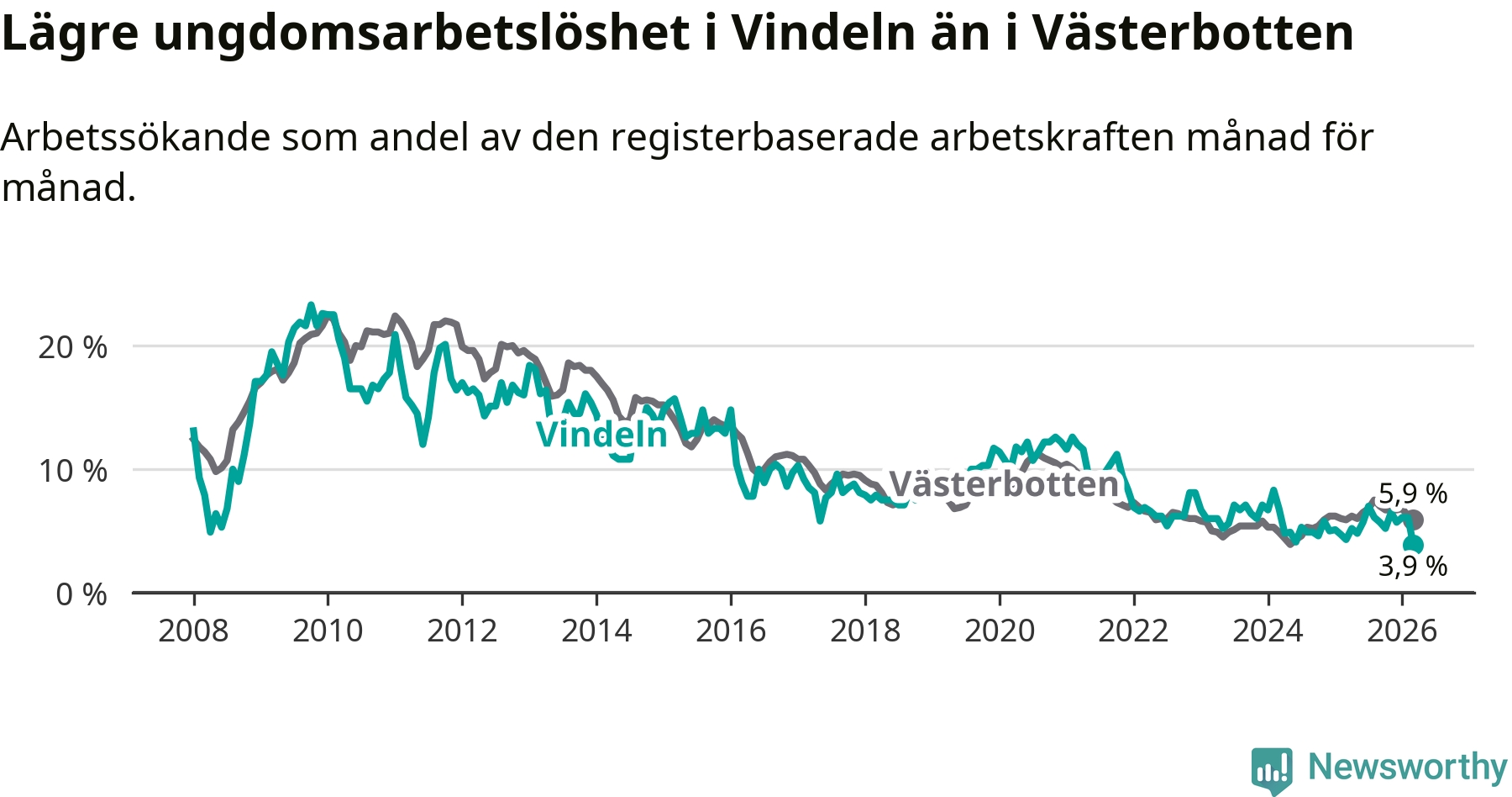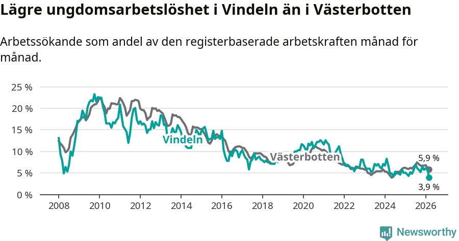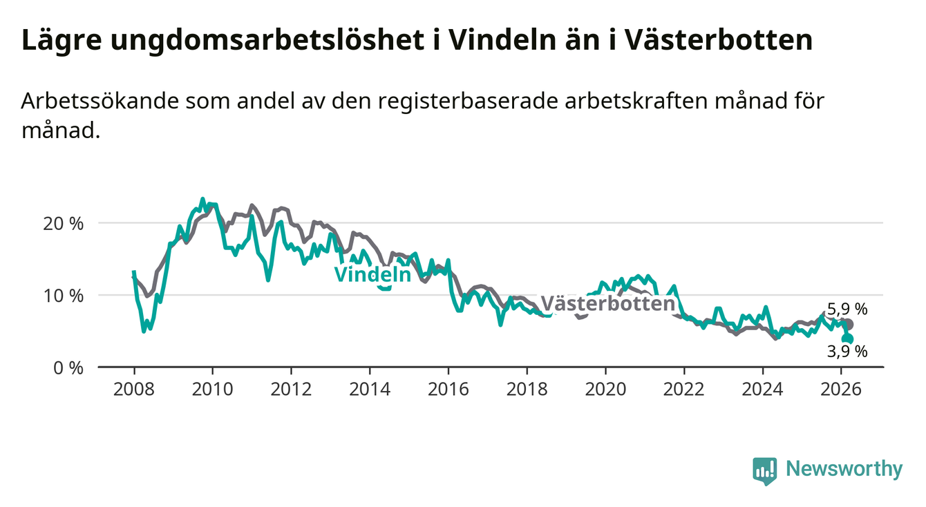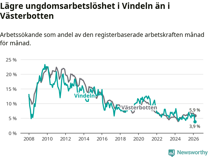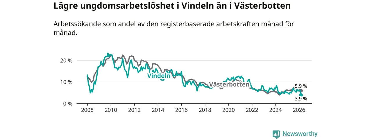 Precis som den totala arbetslösheten ligger ungdomsarbetslösheten i Vindeln lägre än i Västerbotten som helhet. Skillnaden mellan kommunen och länet är 2,0 procentenheter.