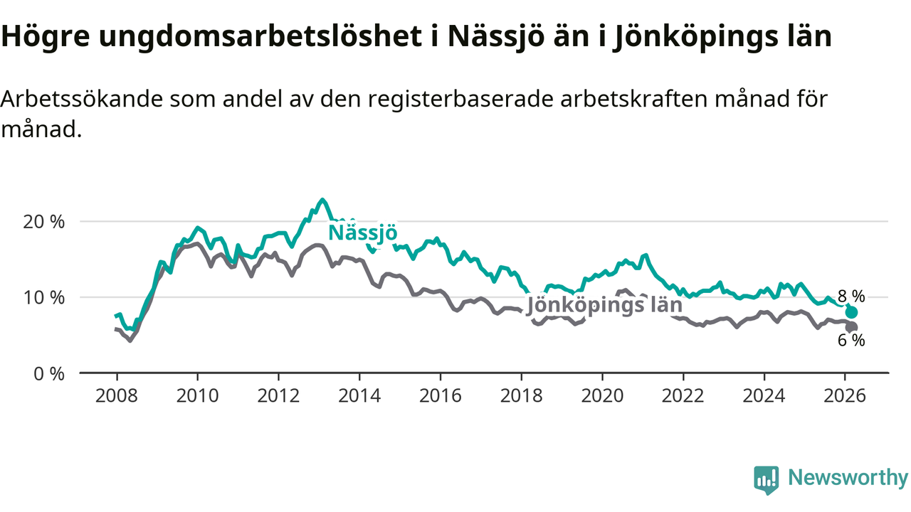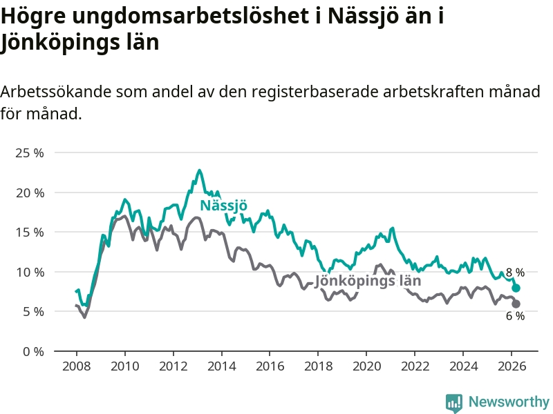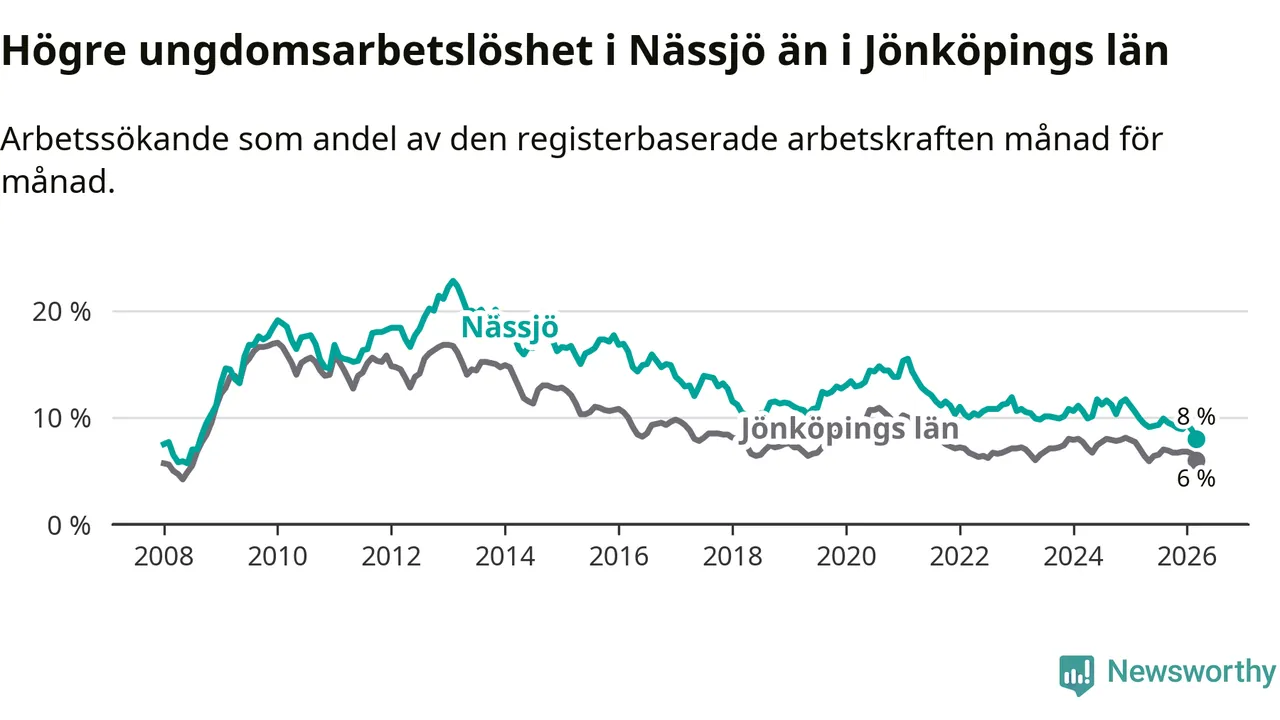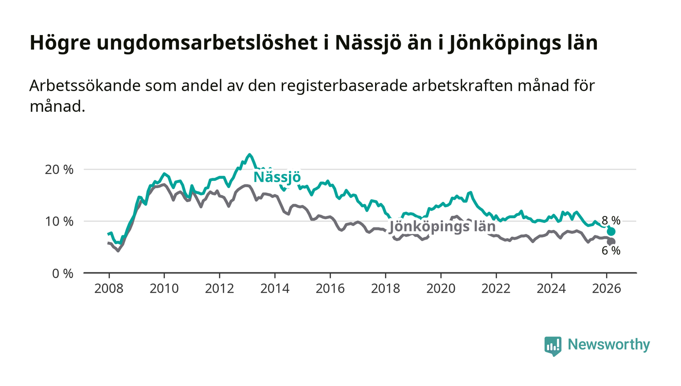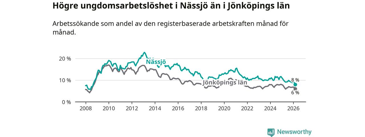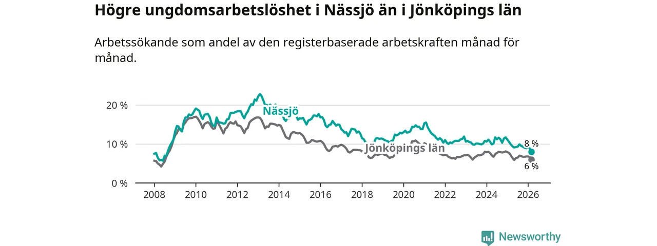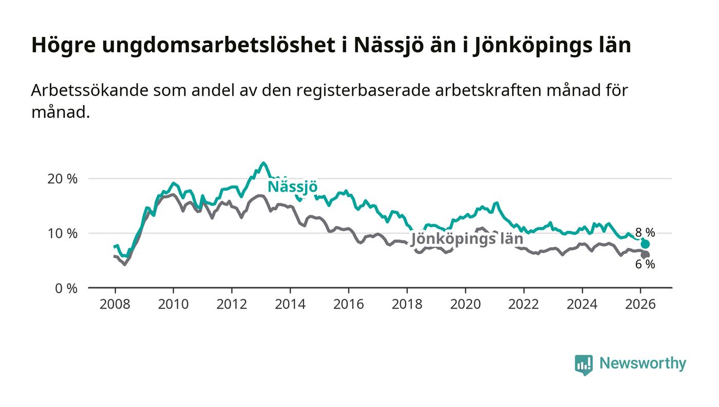I och med den senaste månadens nedgång har de ungas arbetslöshet i Nässjö sjunkit 14 månader i följd (ner från 11,1 procent i januari 2025 till 8,0 procent nu). Den nuvarande arbetslöshetsnivån är den lägsta sedan augusti 2008.
