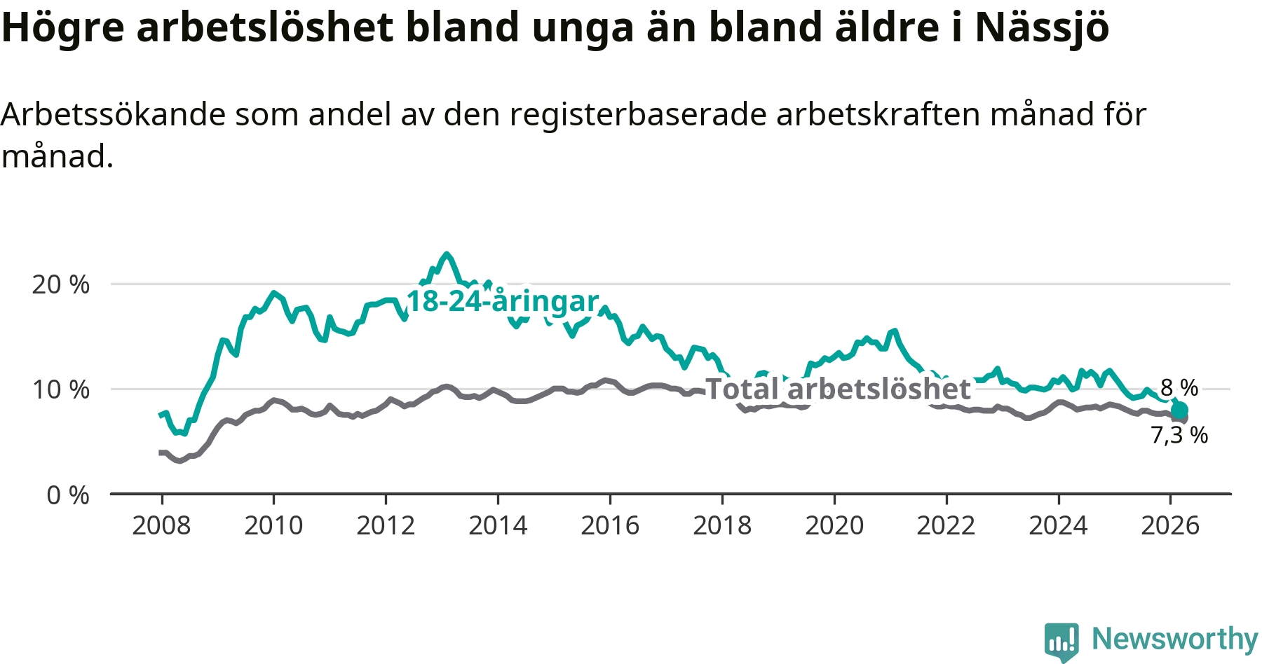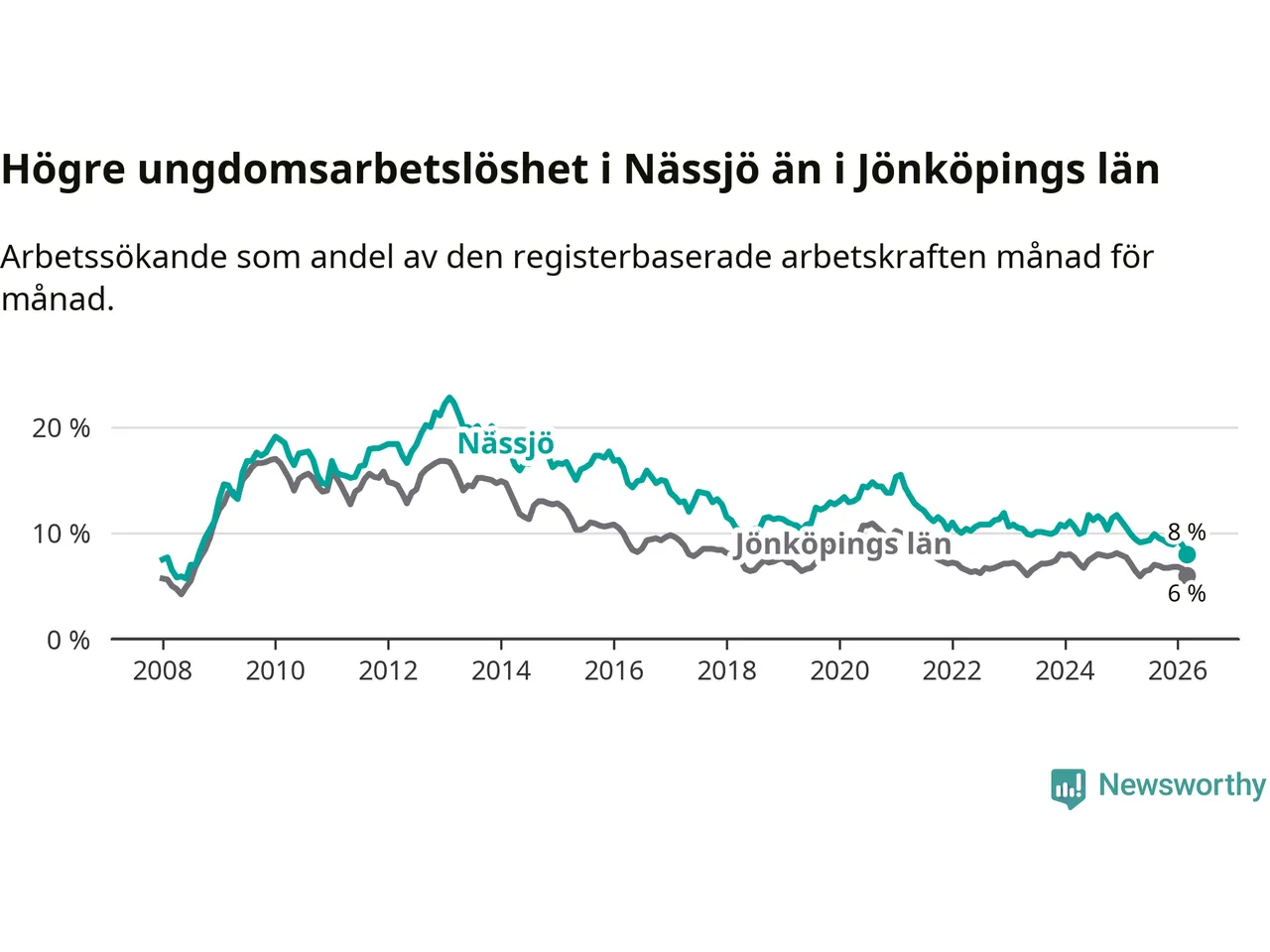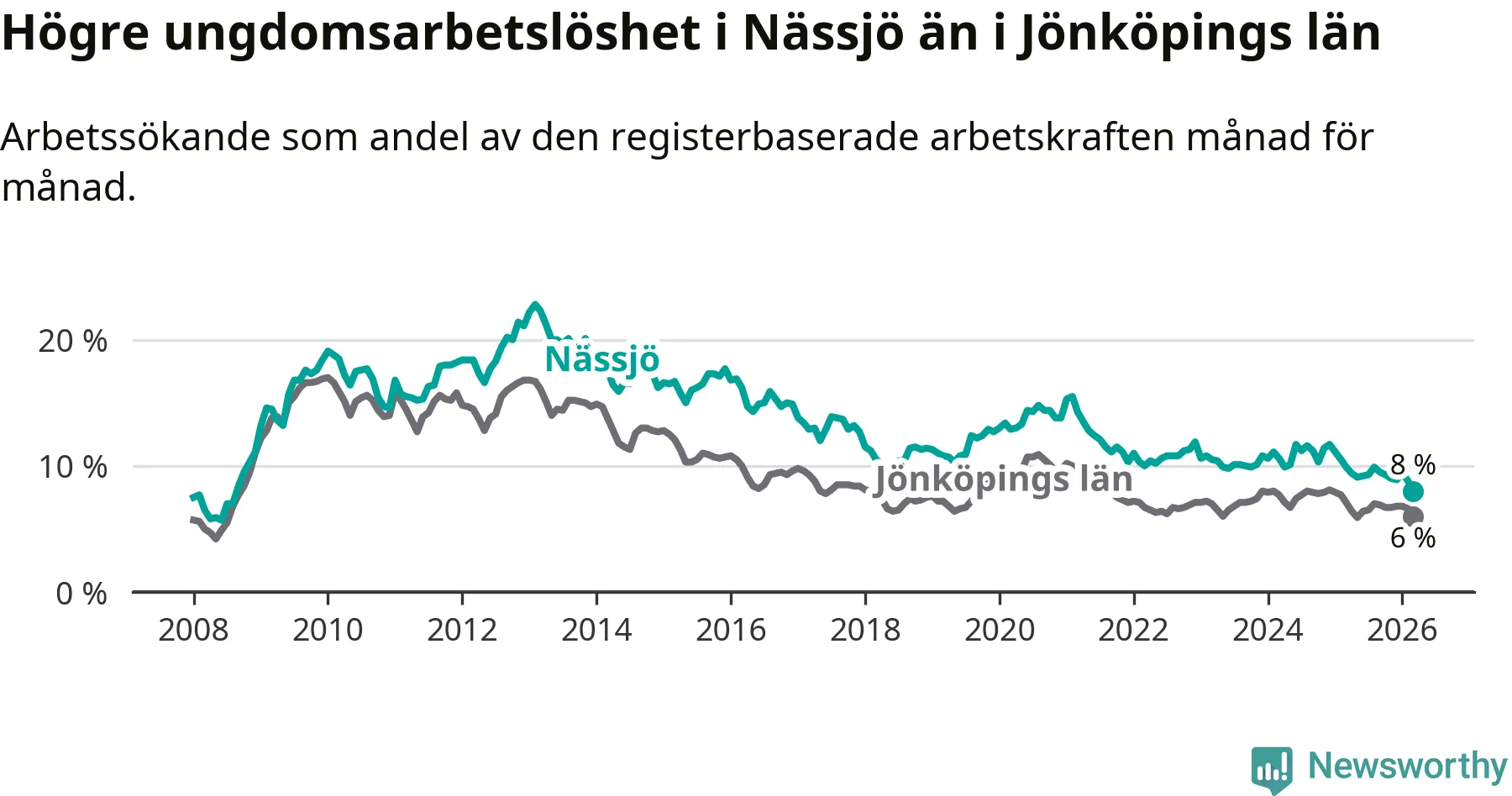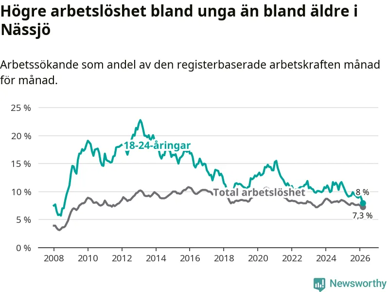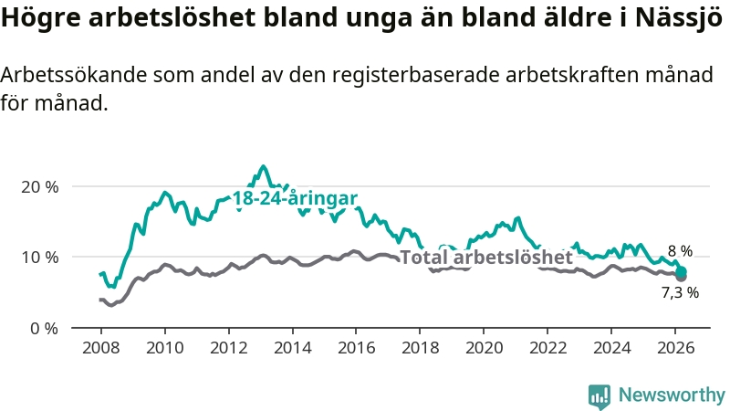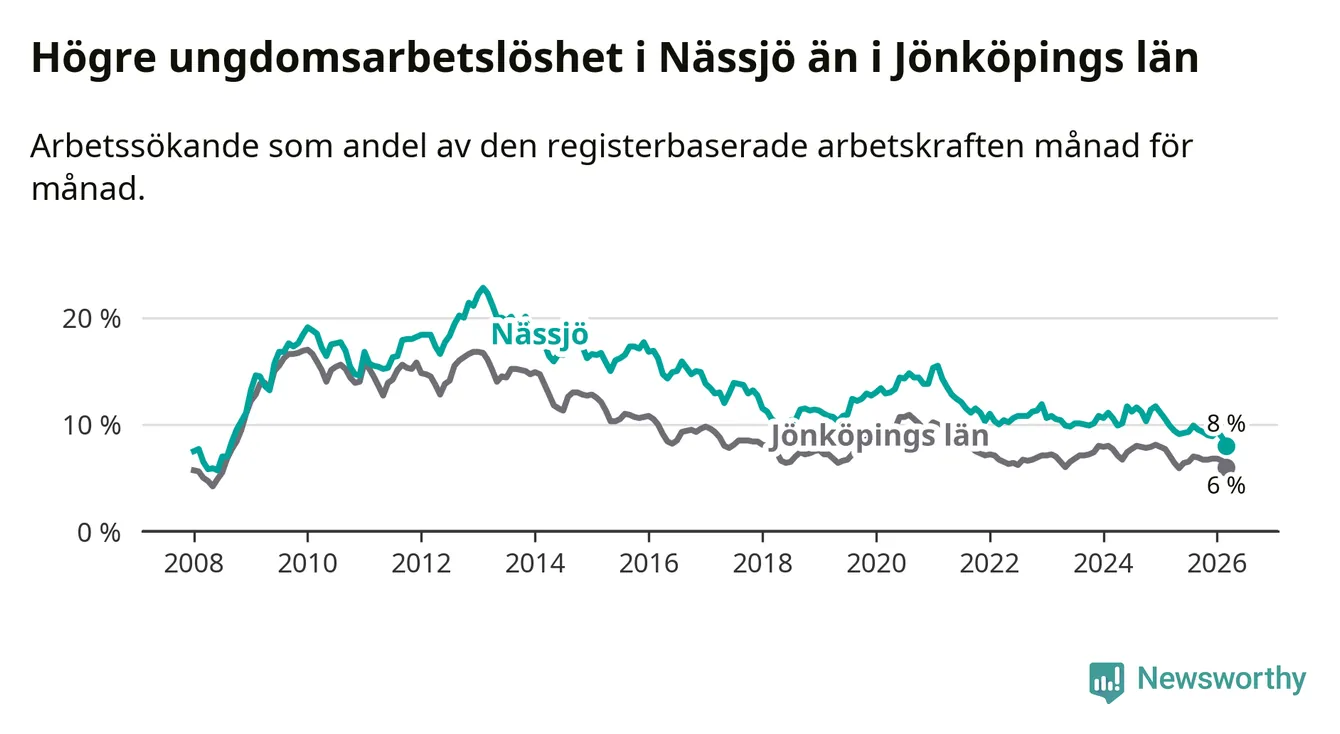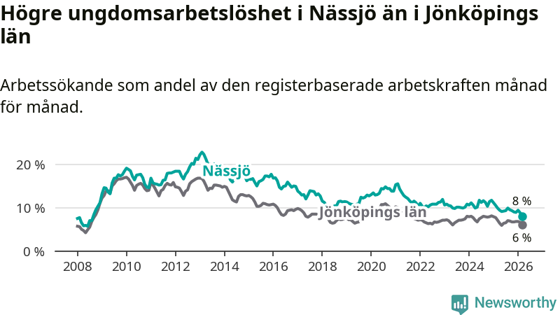 I och med den senaste månadens nedgång har de ungas arbetslöshet i Nässjö sjunkit 14 månader i följd (ner från 11,1 procent i januari 2025 till 8,0 procent nu). Den nuvarande arbetslöshetsnivån är den lägsta sedan augusti 2008.