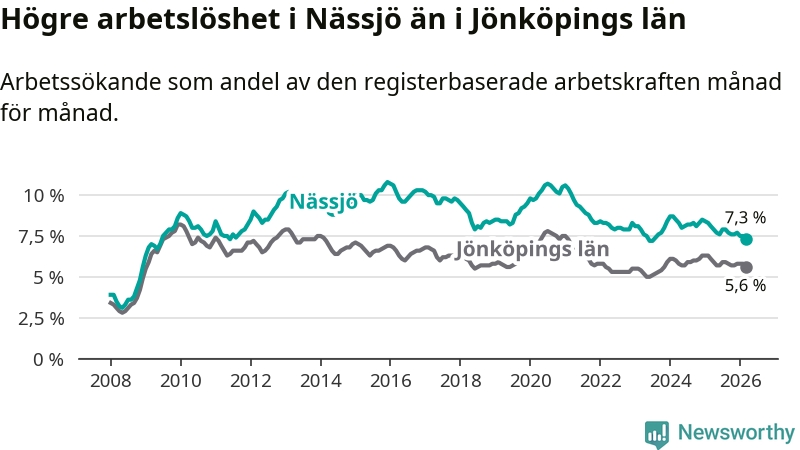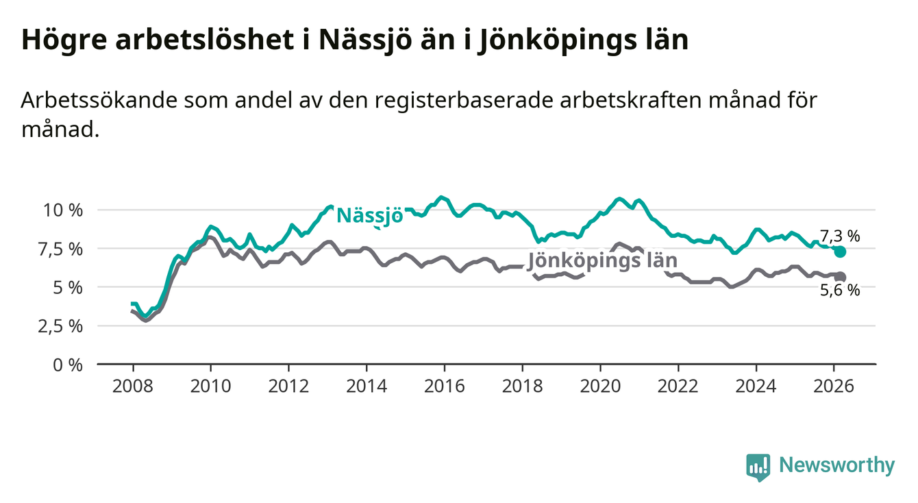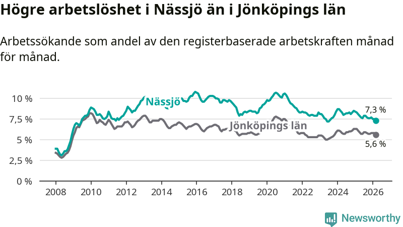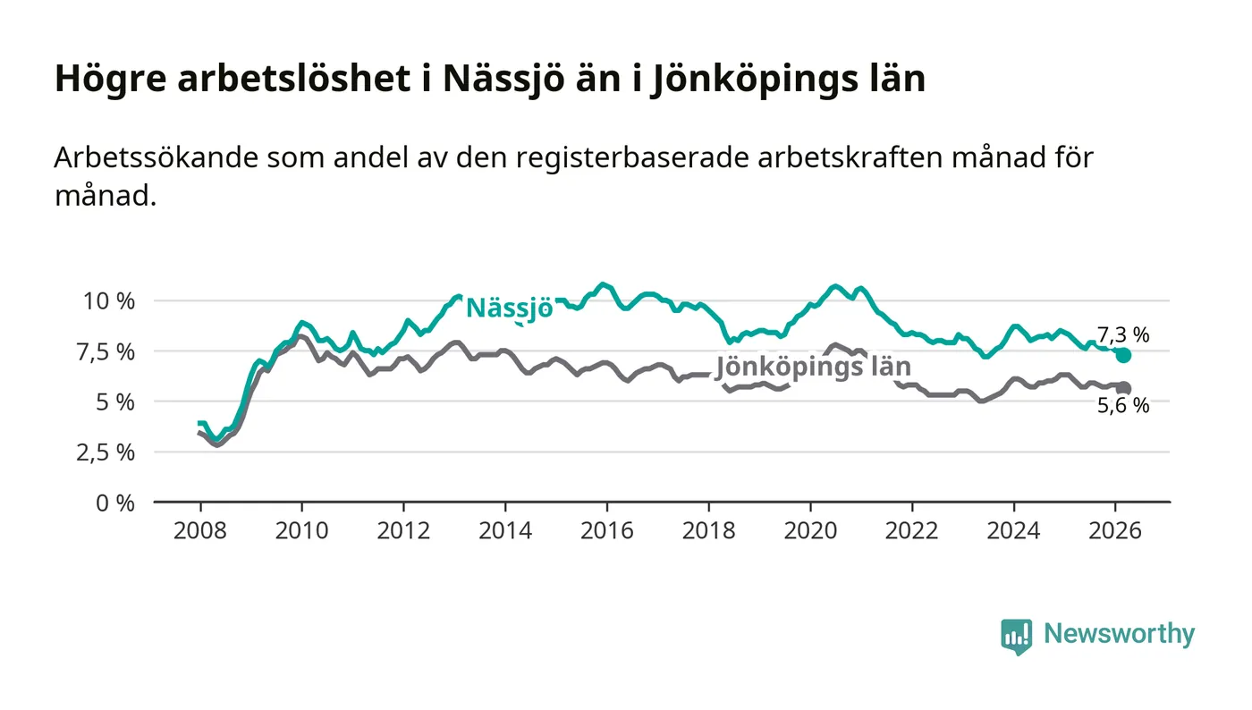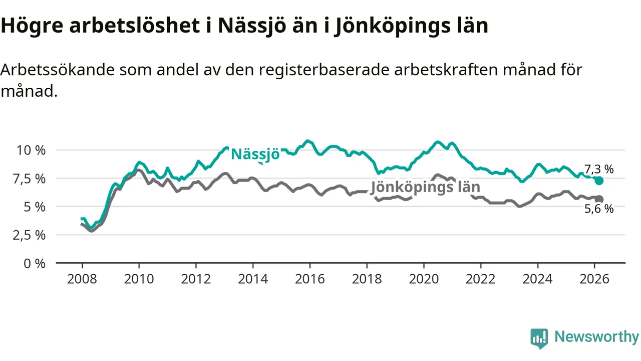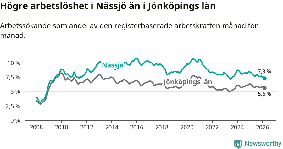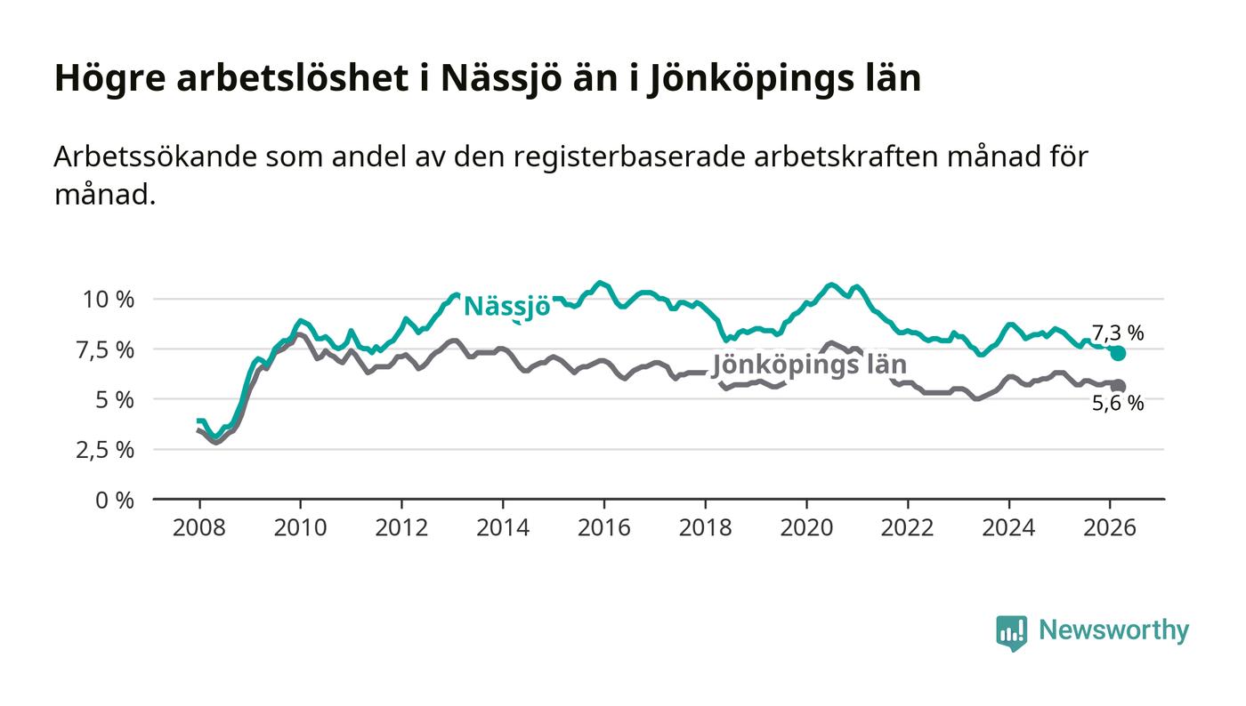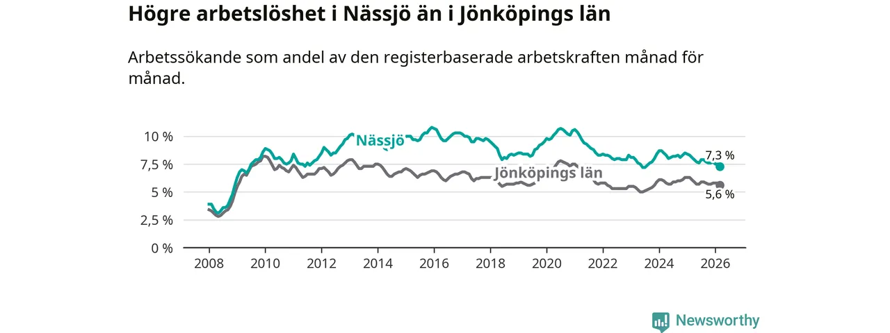 Under mars månad rapporterade Nässjö kommun en total arbetslöshet på 7,3 procent. Det är en minskning jämfört med samma tidpunkt i fjol (−0,8 procentenheter). Även i Jönköpings län sjunker arbetslösheten .