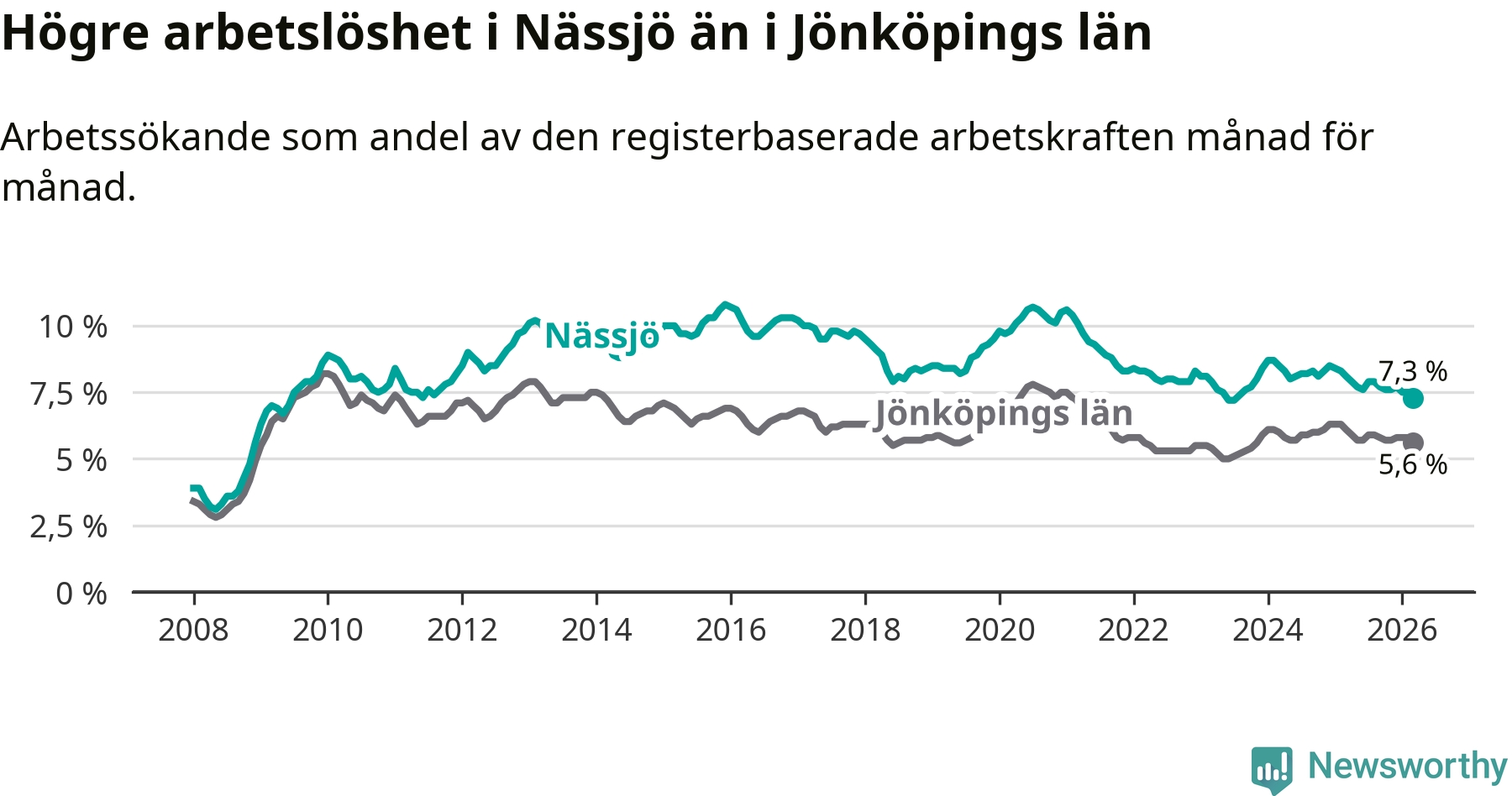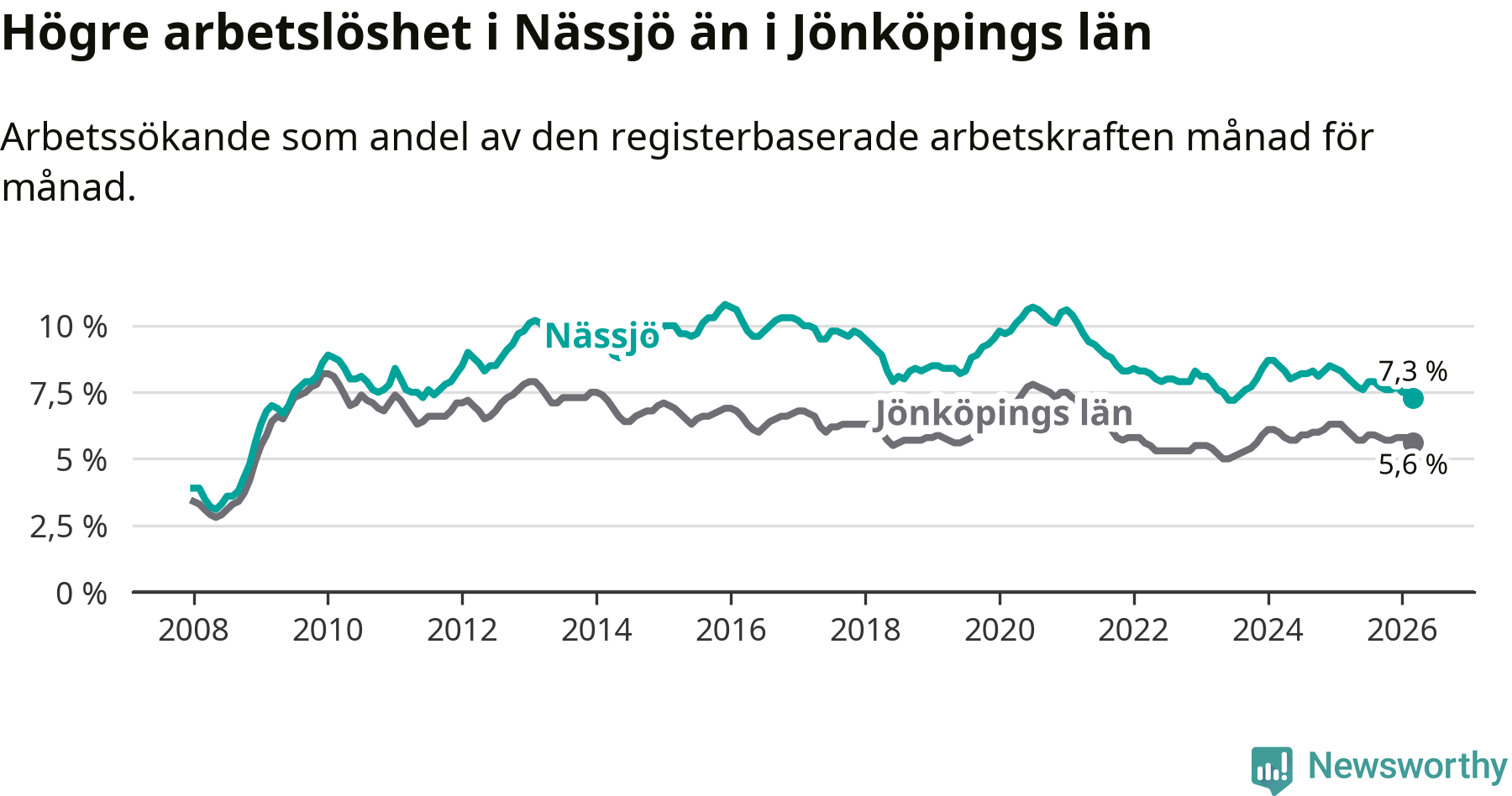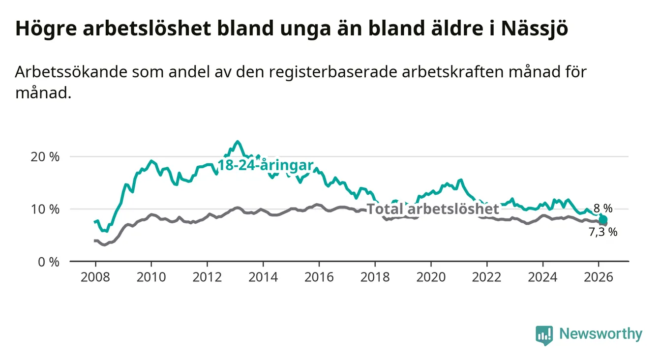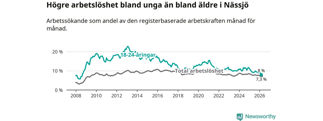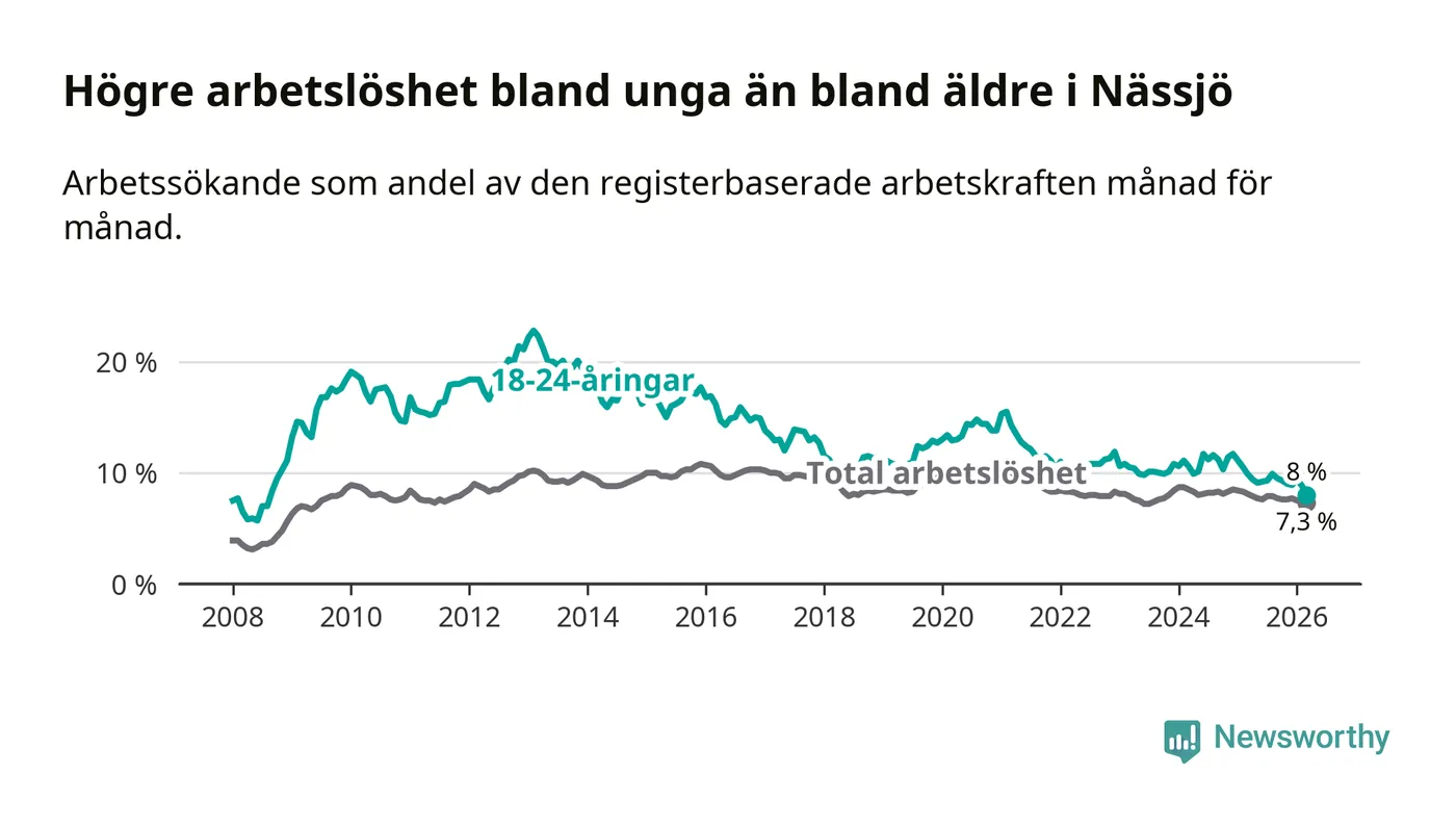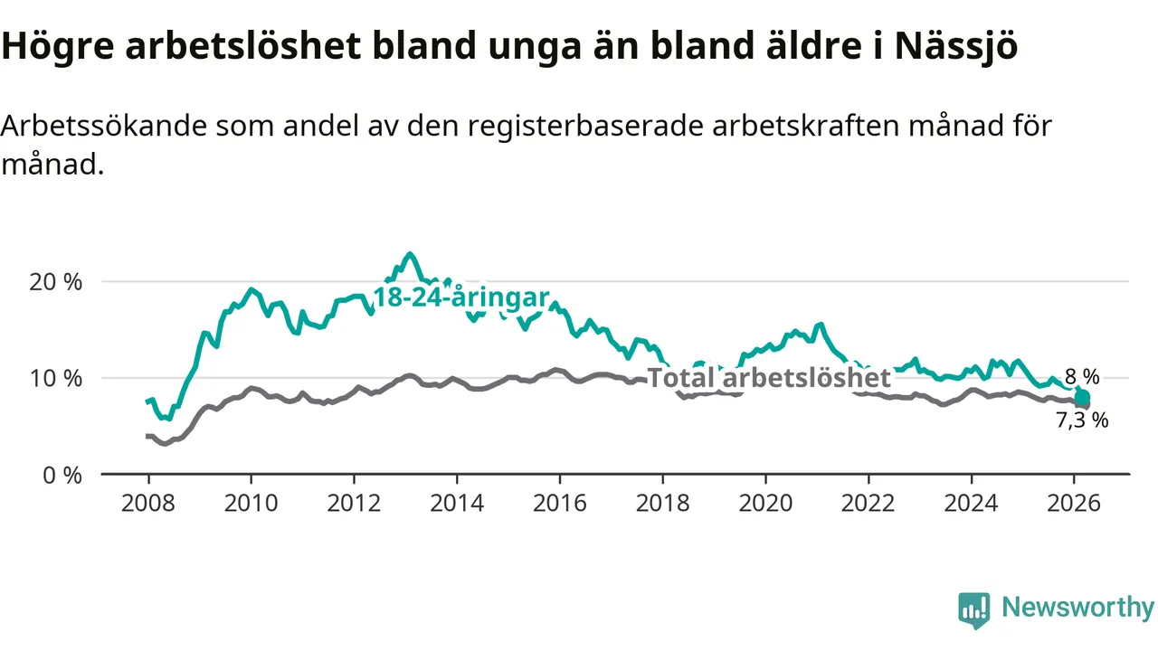 Under mars månad rapporterade Nässjö kommun en total arbetslöshet på 7,3 procent. Det är en minskning jämfört med samma tidpunkt i fjol (−0,8 procentenheter). Även i Jönköpings län sjunker arbetslösheten .