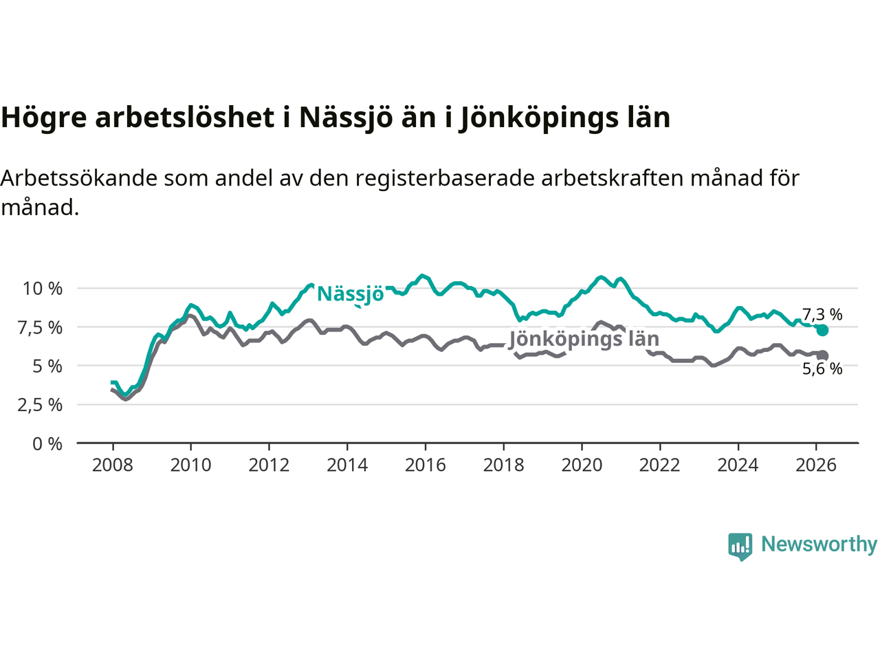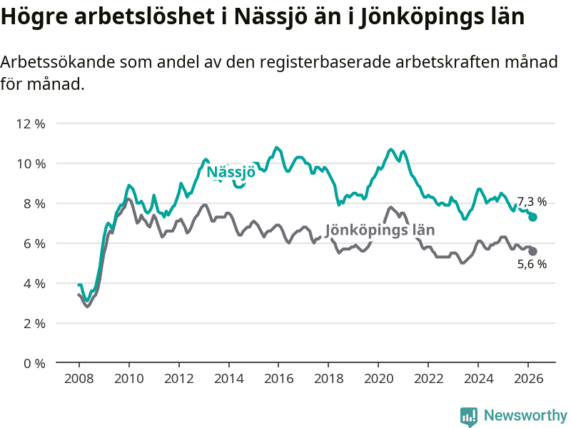 Det är 15:e månaden i följd som arbetslösheten i Nässjö är lägre än den var under samma tidpunkt året innan. Sedan december 2024 har arbetslösheten gått ner från 8,5 till 7,3 procent. Den nuvarande arbetslöshetsnivån är därmed den lägsta sedan juli 2023.