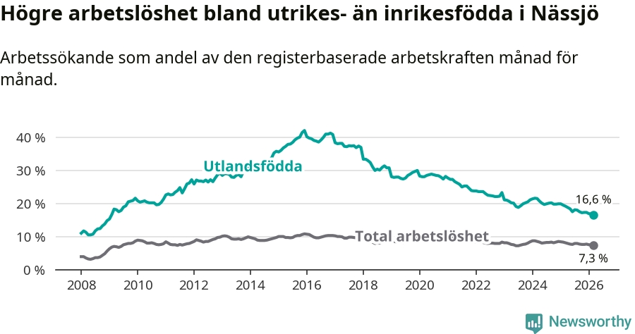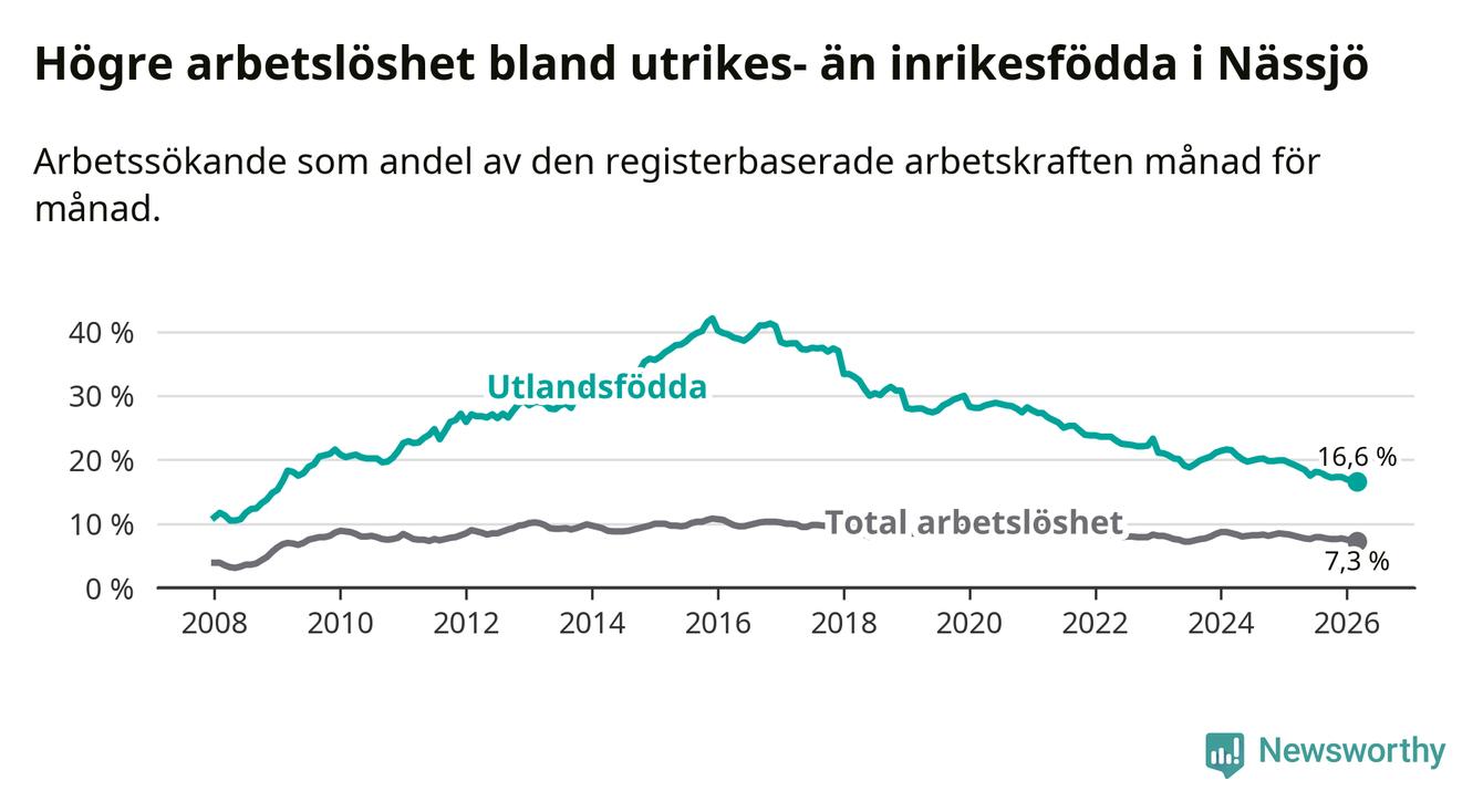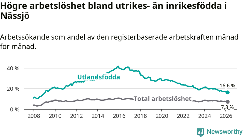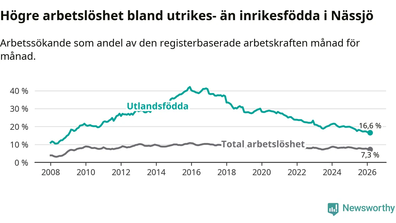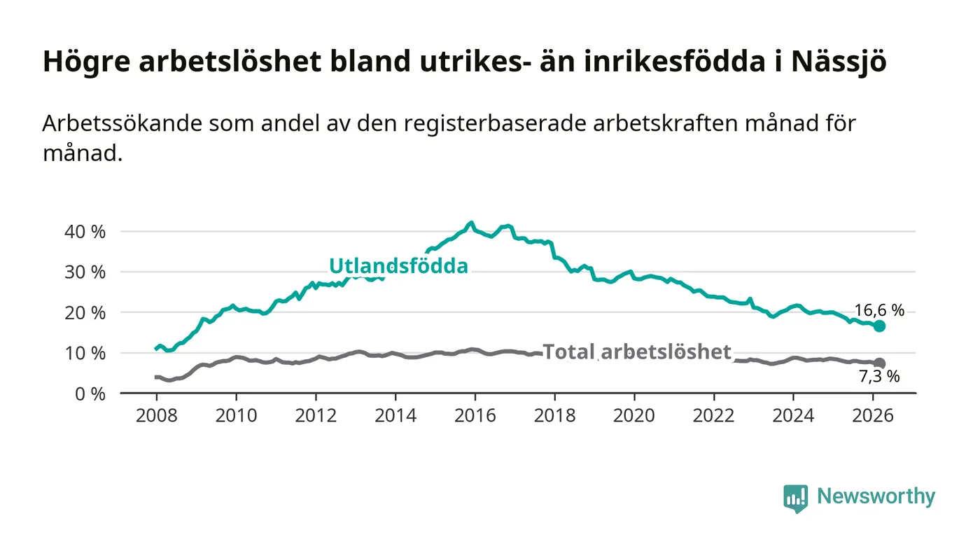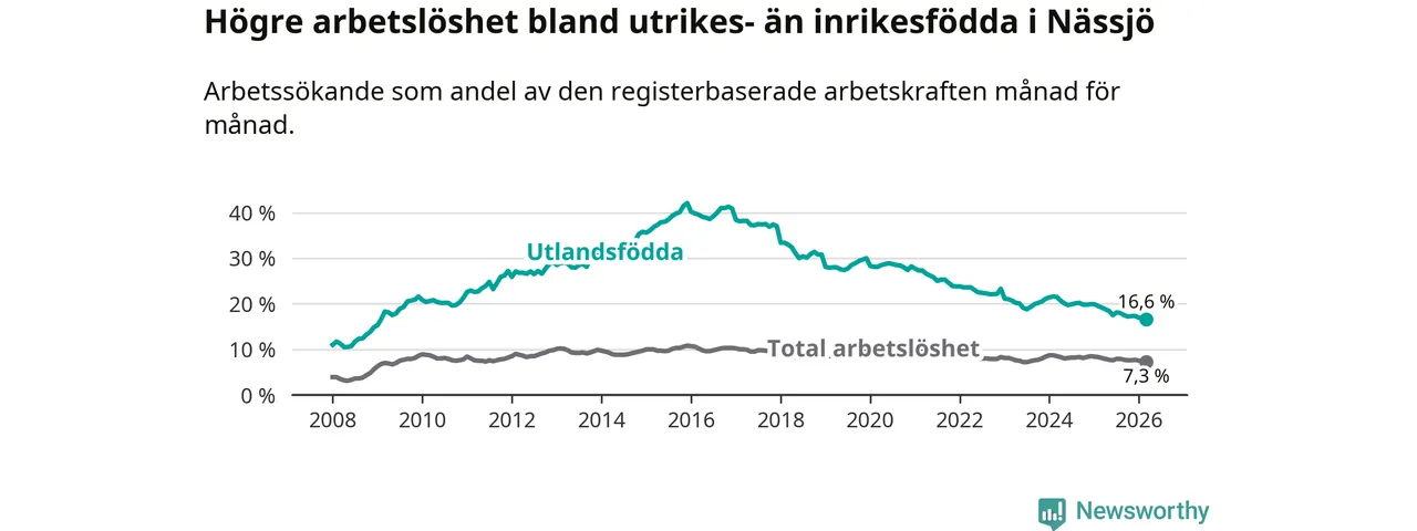 Arbetslösheten bland utlandsfödda var 16,6 procent i Nässjö under mars månad, motsvarande 661 av 3 982 personer. Det är 2,6 procentenheter färre än vid samma tidpunkt i fjol (−100 om man räknar personer). Därmed är de utlandsföddas arbetslöshet lägre än vid samma tidpunkt i fjol för 18:e månaden i följd. Sedan september 2024 har arbetslösheten bland utlandsfödda minskat från 20,2 till 16,6 procent. Den nuvarande arbetslöshetsnivån är den lägsta sedan januari 2009.