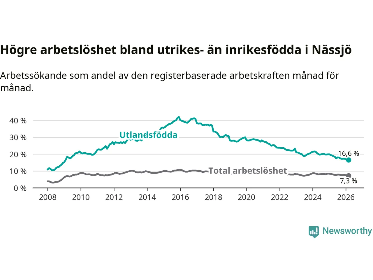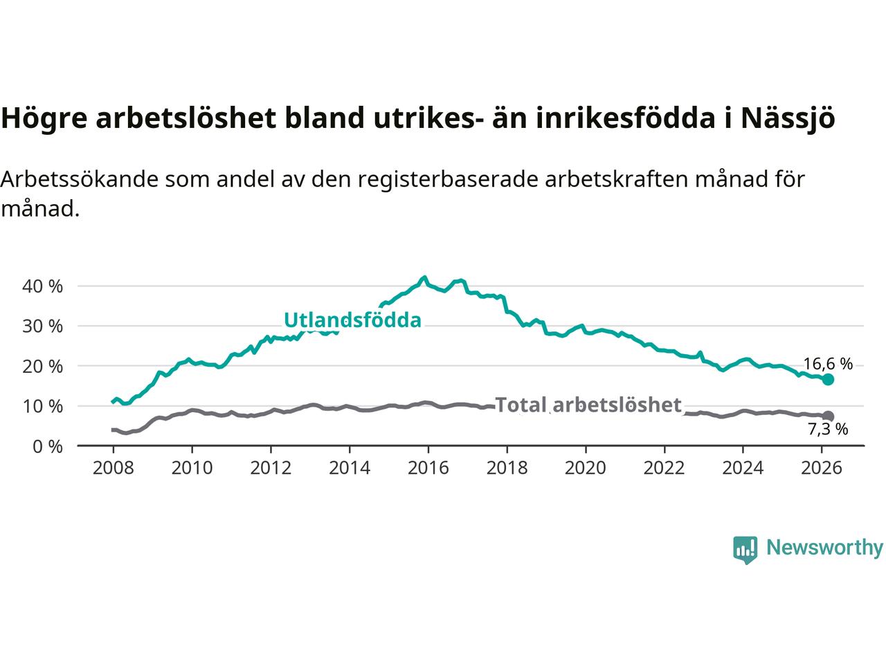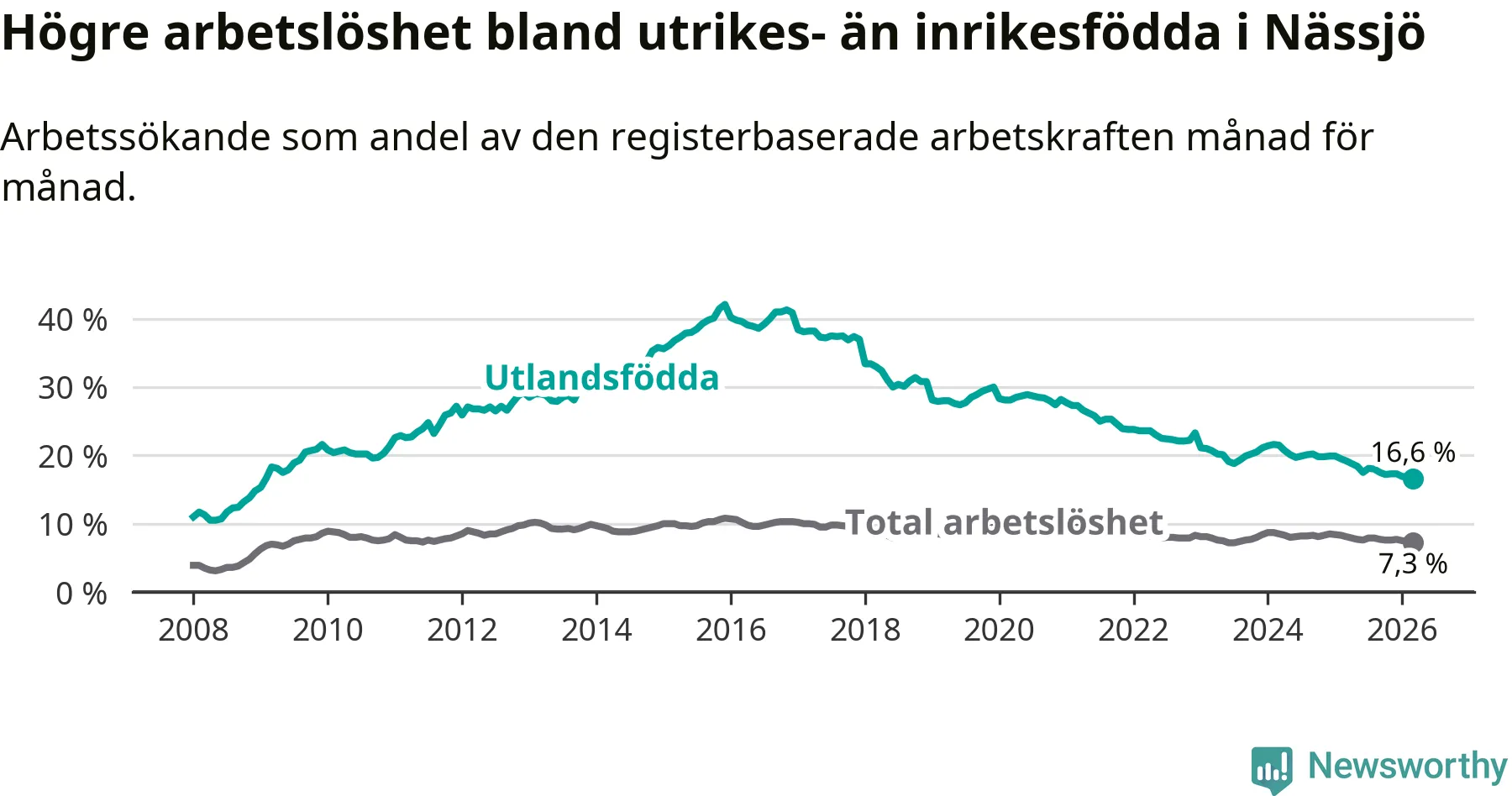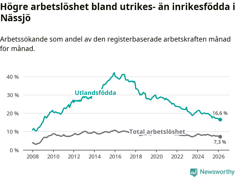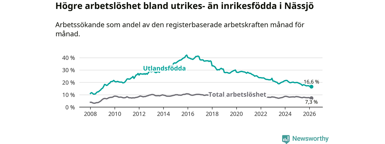 Arbetslösheten bland utlandsfödda var 16,6 procent i Nässjö under mars månad, motsvarande 661 av 3 982 personer. Det är 2,6 procentenheter färre än vid samma tidpunkt i fjol (−100 om man räknar personer). Därmed är de utlandsföddas arbetslöshet lägre än vid samma tidpunkt i fjol för 18:e månaden i följd. Sedan september 2024 har arbetslösheten bland utlandsfödda minskat från 20,2 till 16,6 procent. Den nuvarande arbetslöshetsnivån är den lägsta sedan januari 2009.