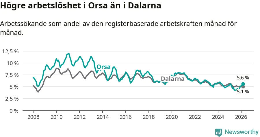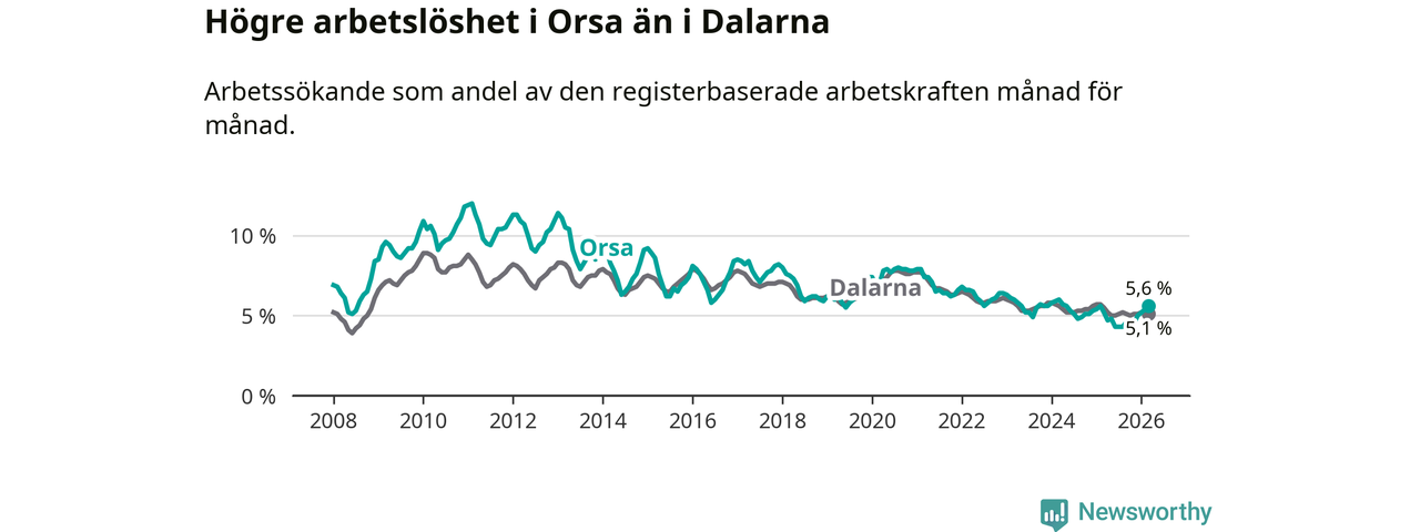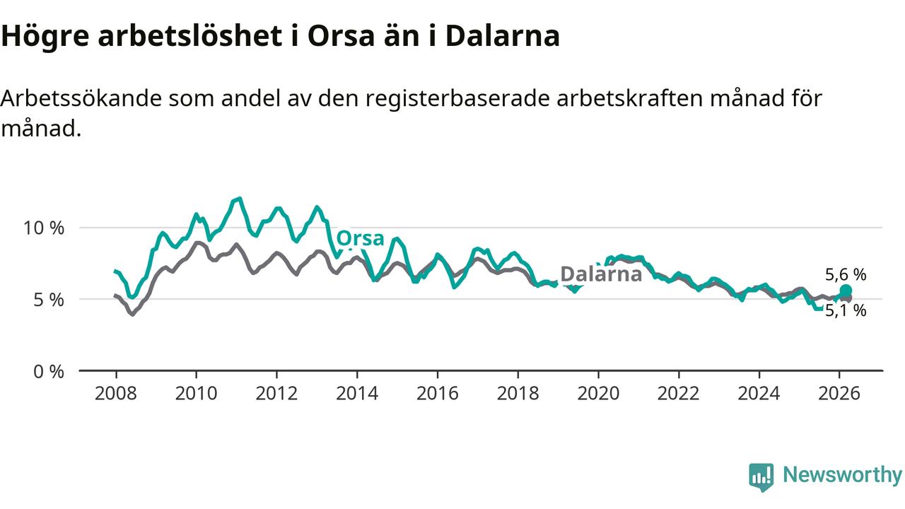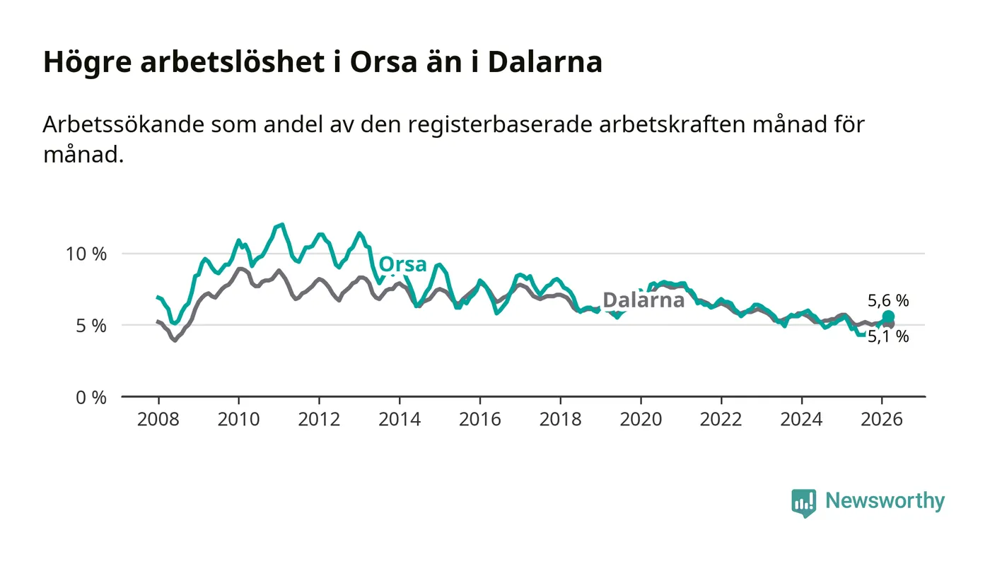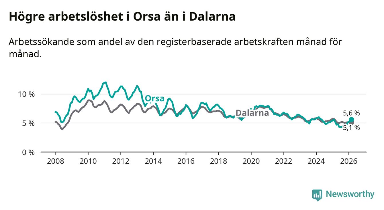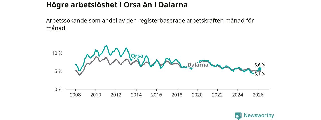 Under mars månad rapporterade Orsa kommun en total arbetslöshet på 5,6 procent. Det är en ökning jämfört med samma tidpunkt i fjol (+0,4 procentenheter). I Dalarnas län däremot sjunker arbetslösheten .