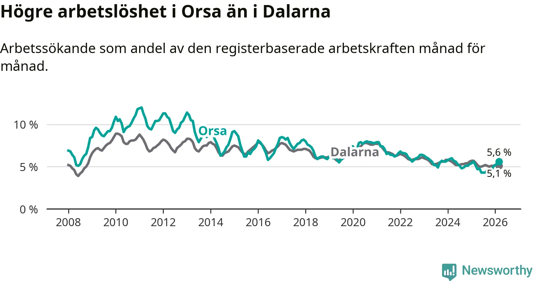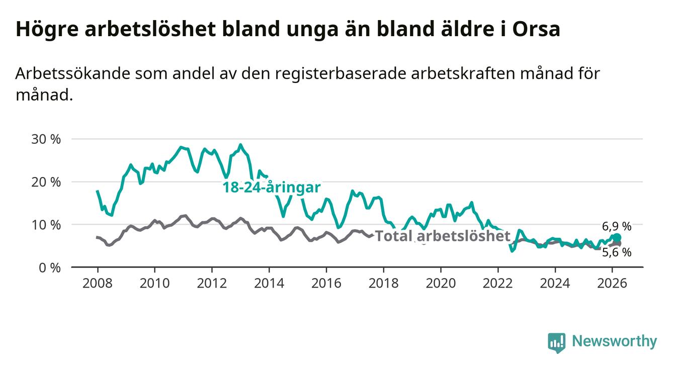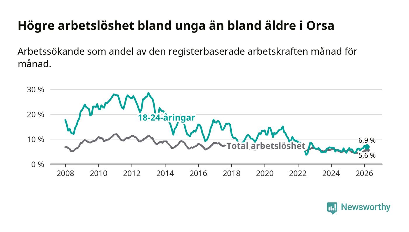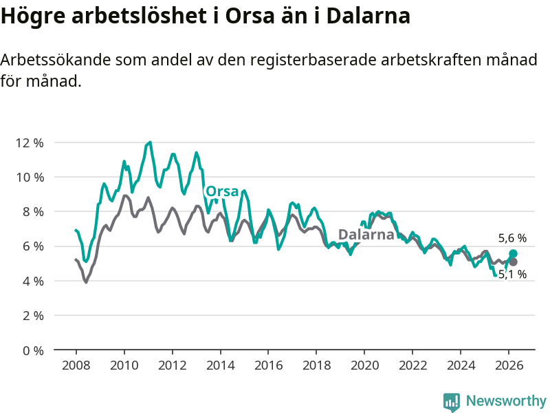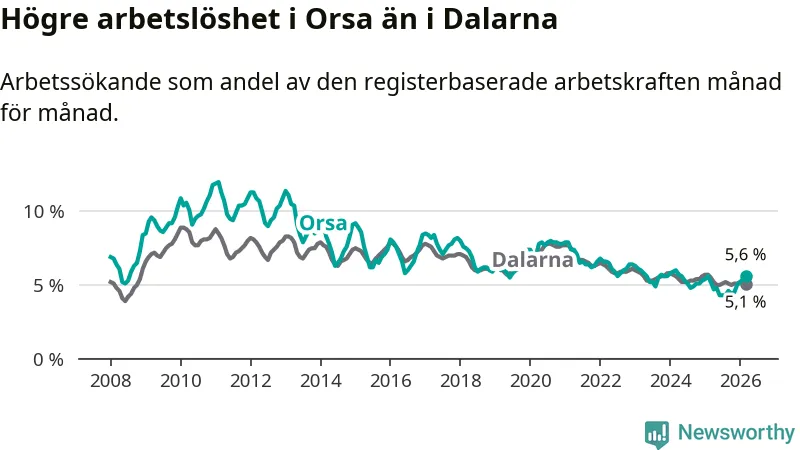 Under mars månad rapporterade Orsa kommun en total arbetslöshet på 5,6 procent. Det är en ökning jämfört med samma tidpunkt i fjol (+0,4 procentenheter). I Dalarnas län däremot sjunker arbetslösheten .