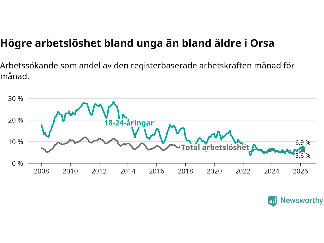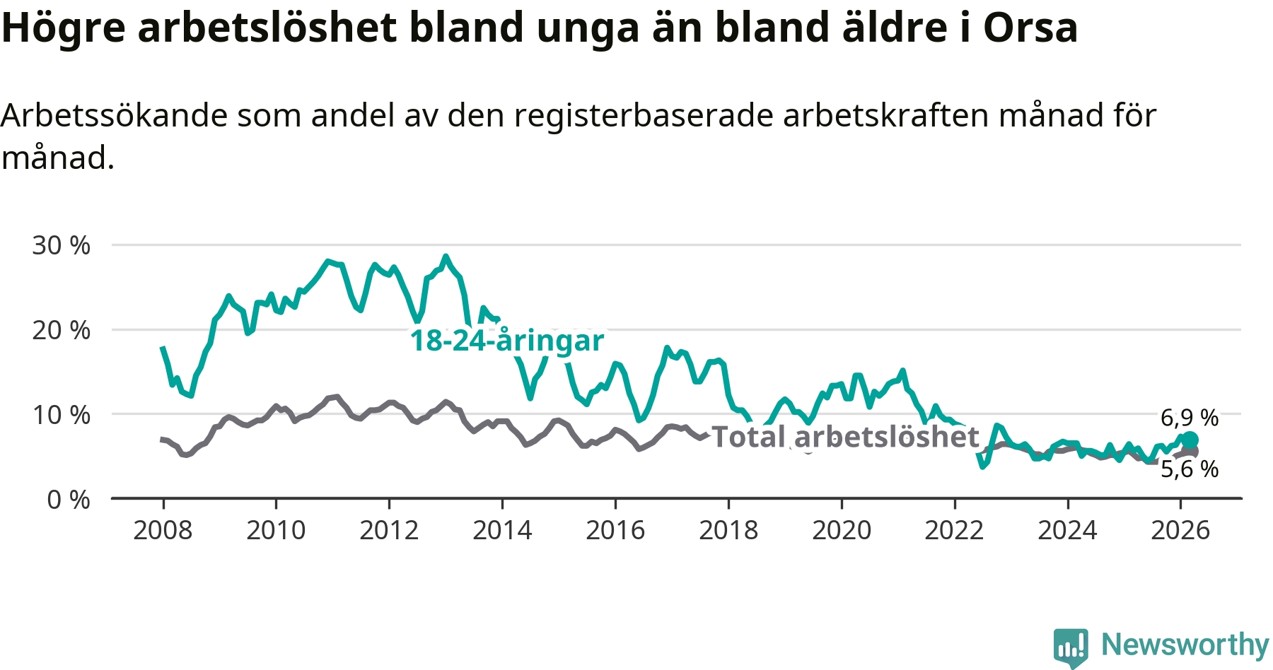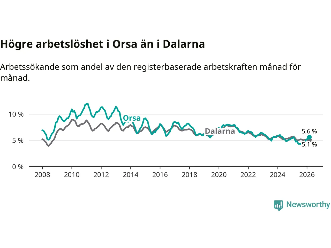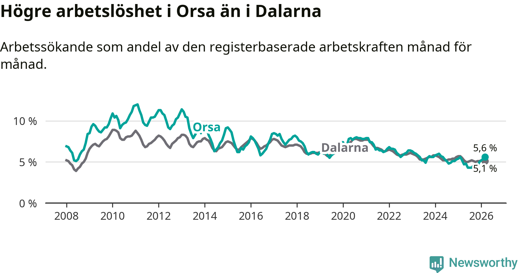 Under mars månad rapporterade Orsa kommun en total arbetslöshet på 5,6 procent. Det är en ökning jämfört med samma tidpunkt i fjol (+0,4 procentenheter). I Dalarnas län däremot sjunker arbetslösheten .