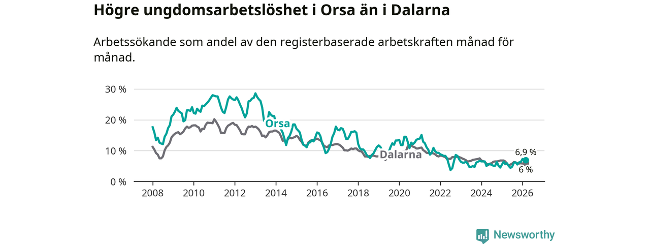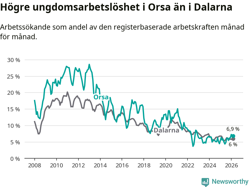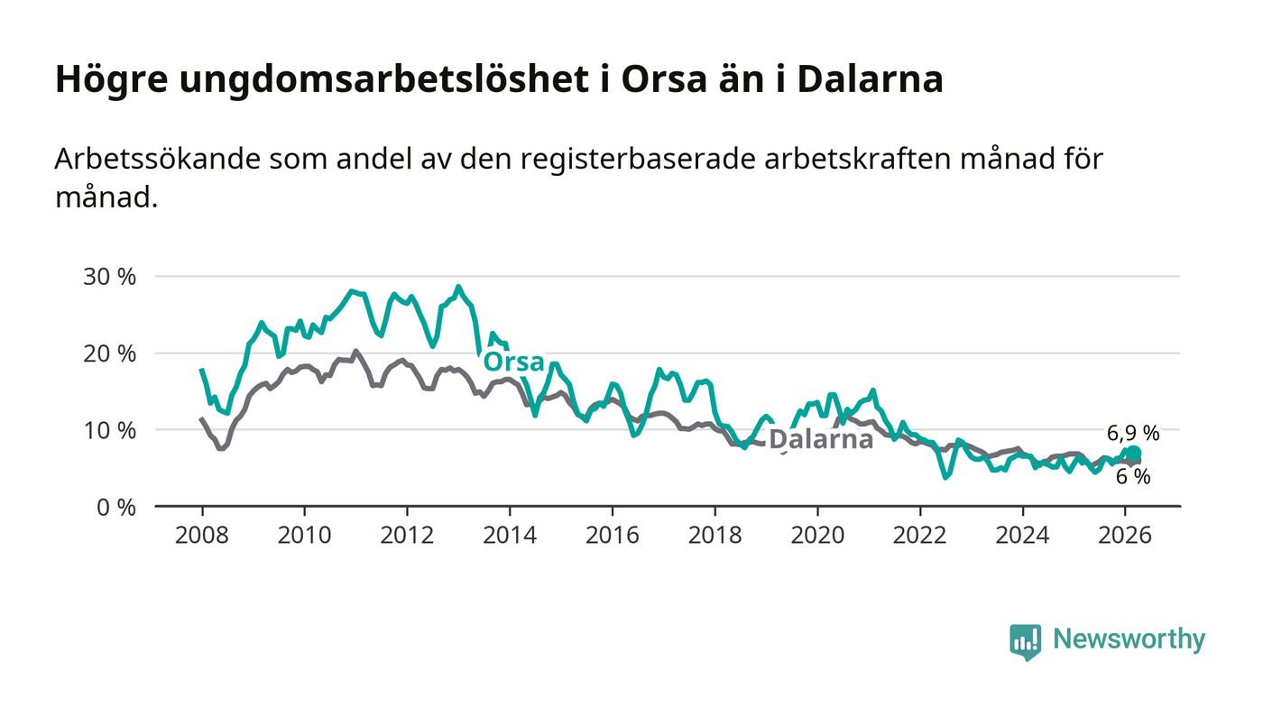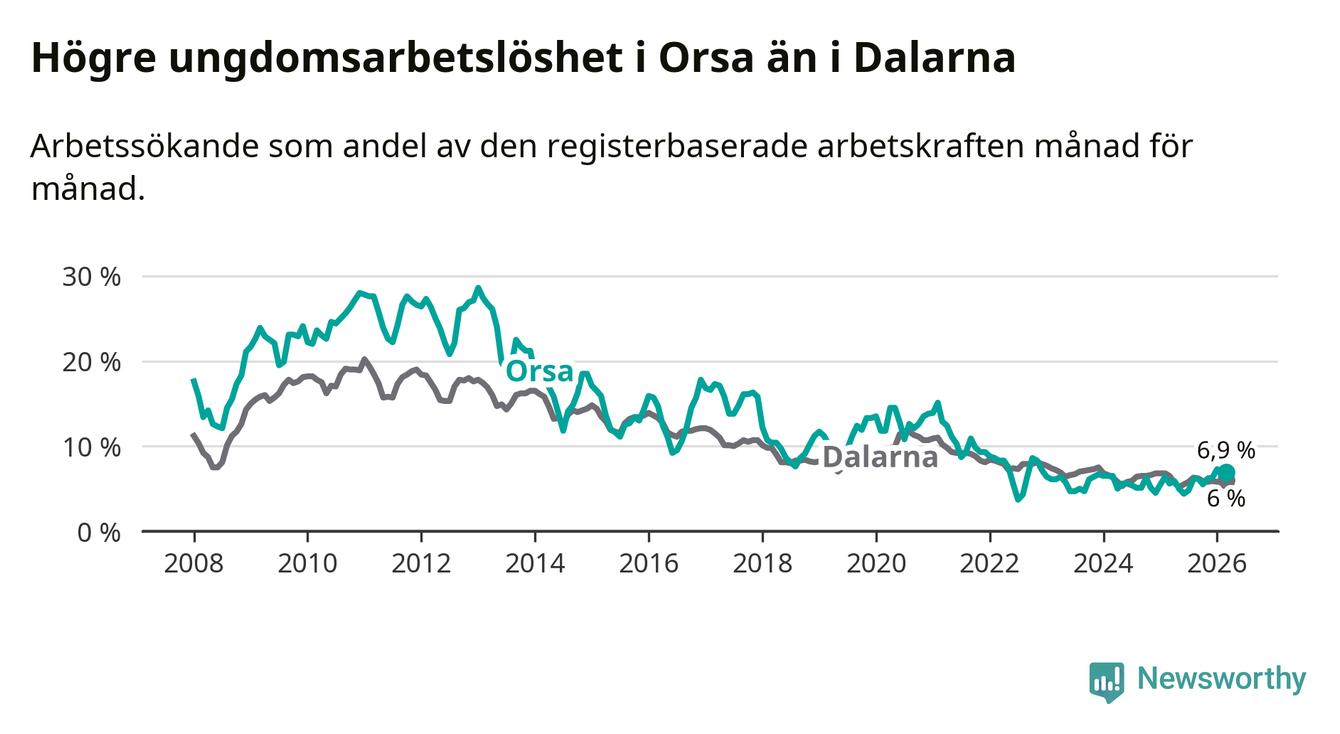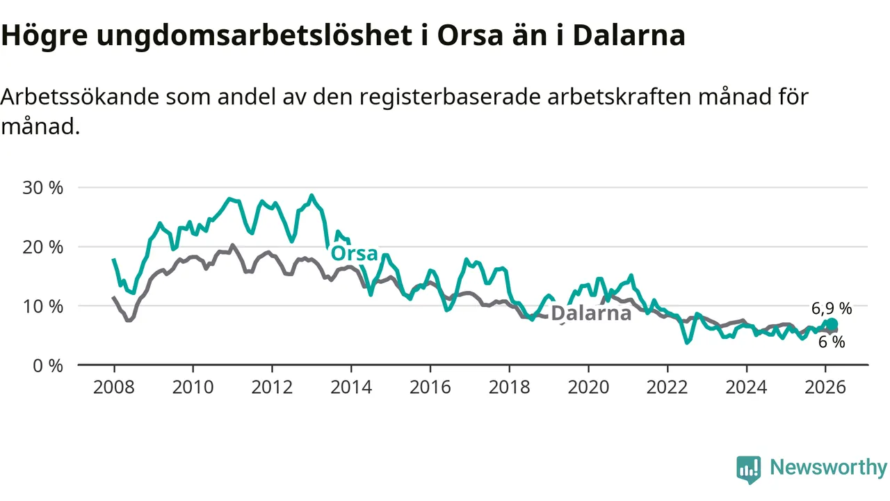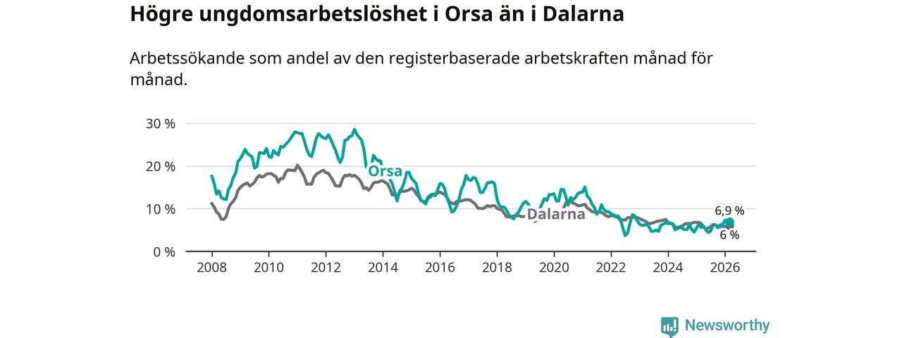Precis som den totala arbetslösheten ligger ungdomsarbetslösheten i Orsa högre än i Dalarna som helhet. Skillnaden mellan kommunen och länet är 0,9 procentenheter.