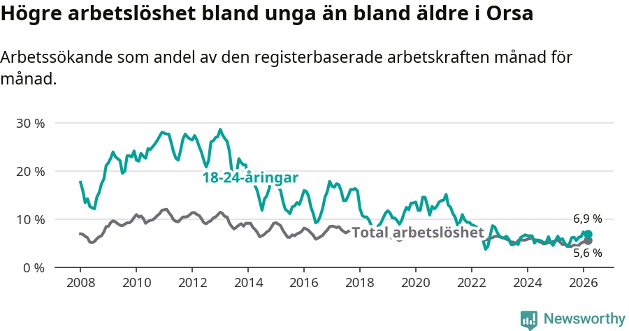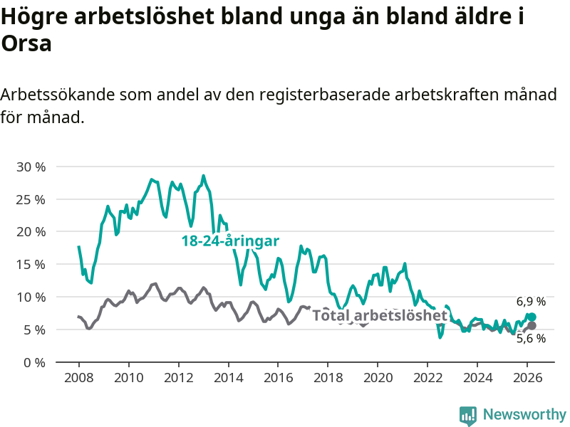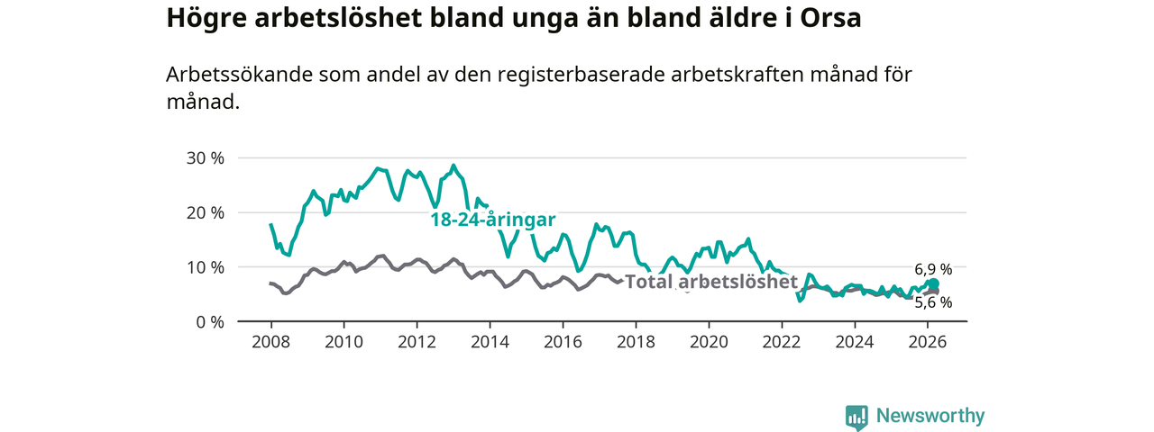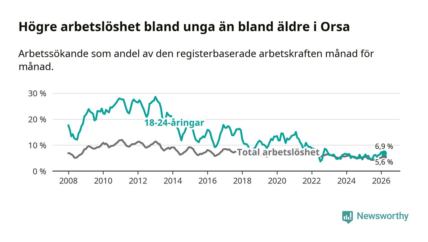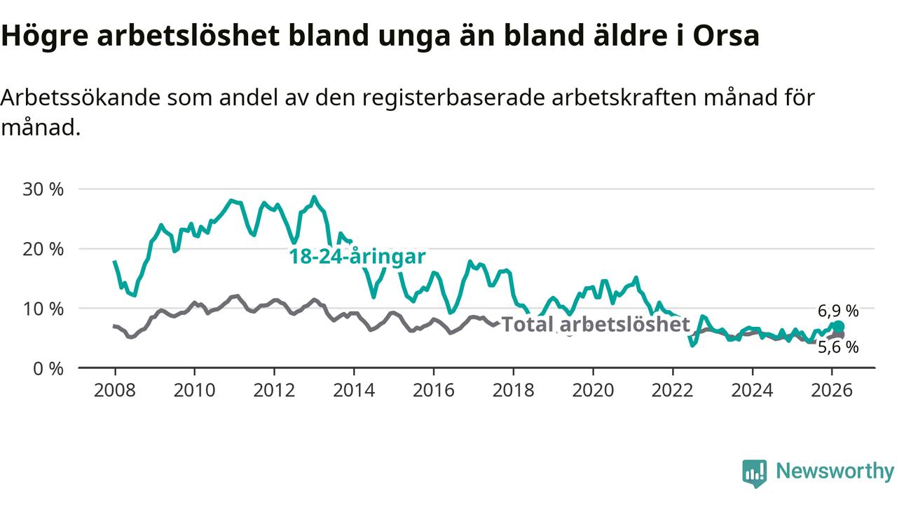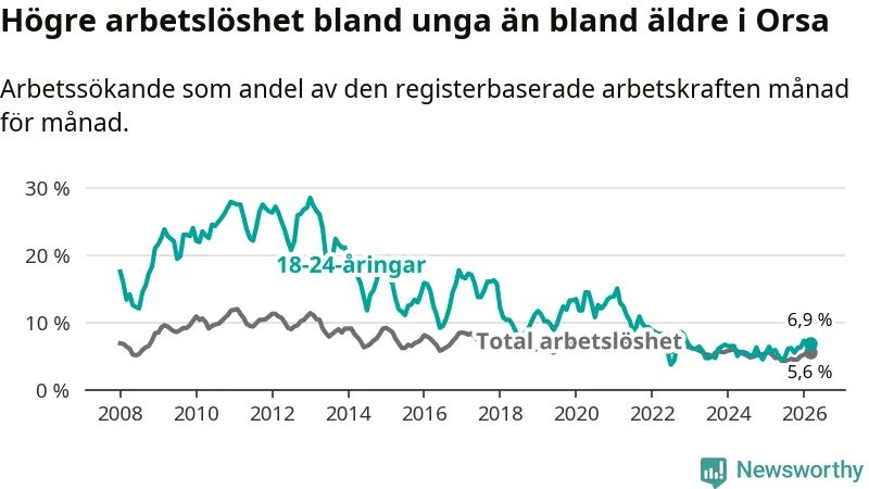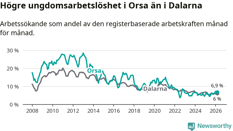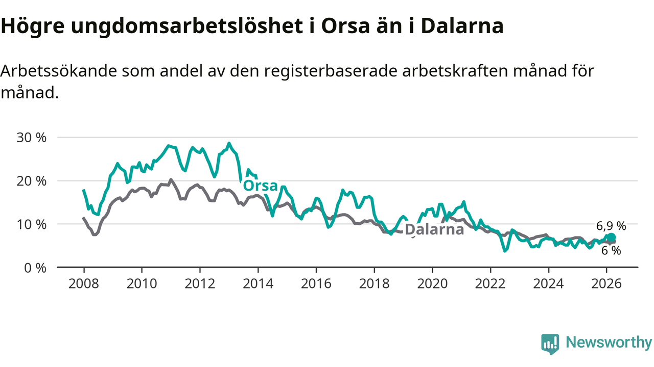 Precis som den totala arbetslösheten ligger ungdomsarbetslösheten i Orsa högre än i Dalarna som helhet. Skillnaden mellan kommunen och länet är 0,9 procentenheter.