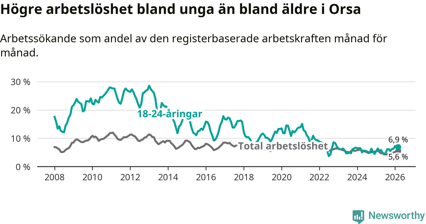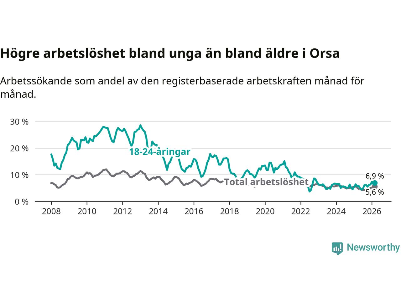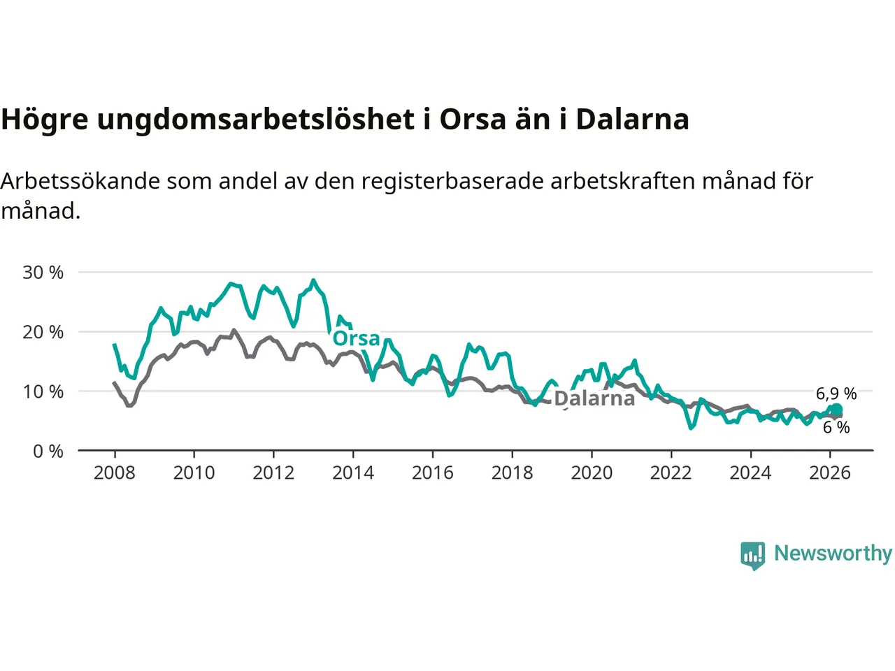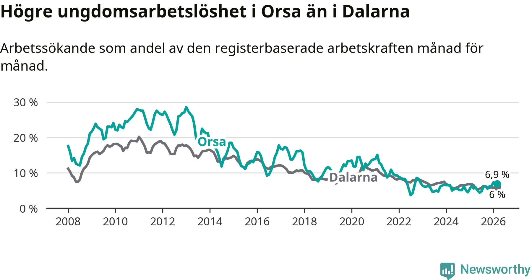 Precis som den totala arbetslösheten ligger ungdomsarbetslösheten i Orsa högre än i Dalarna som helhet. Skillnaden mellan kommunen och länet är 0,9 procentenheter.