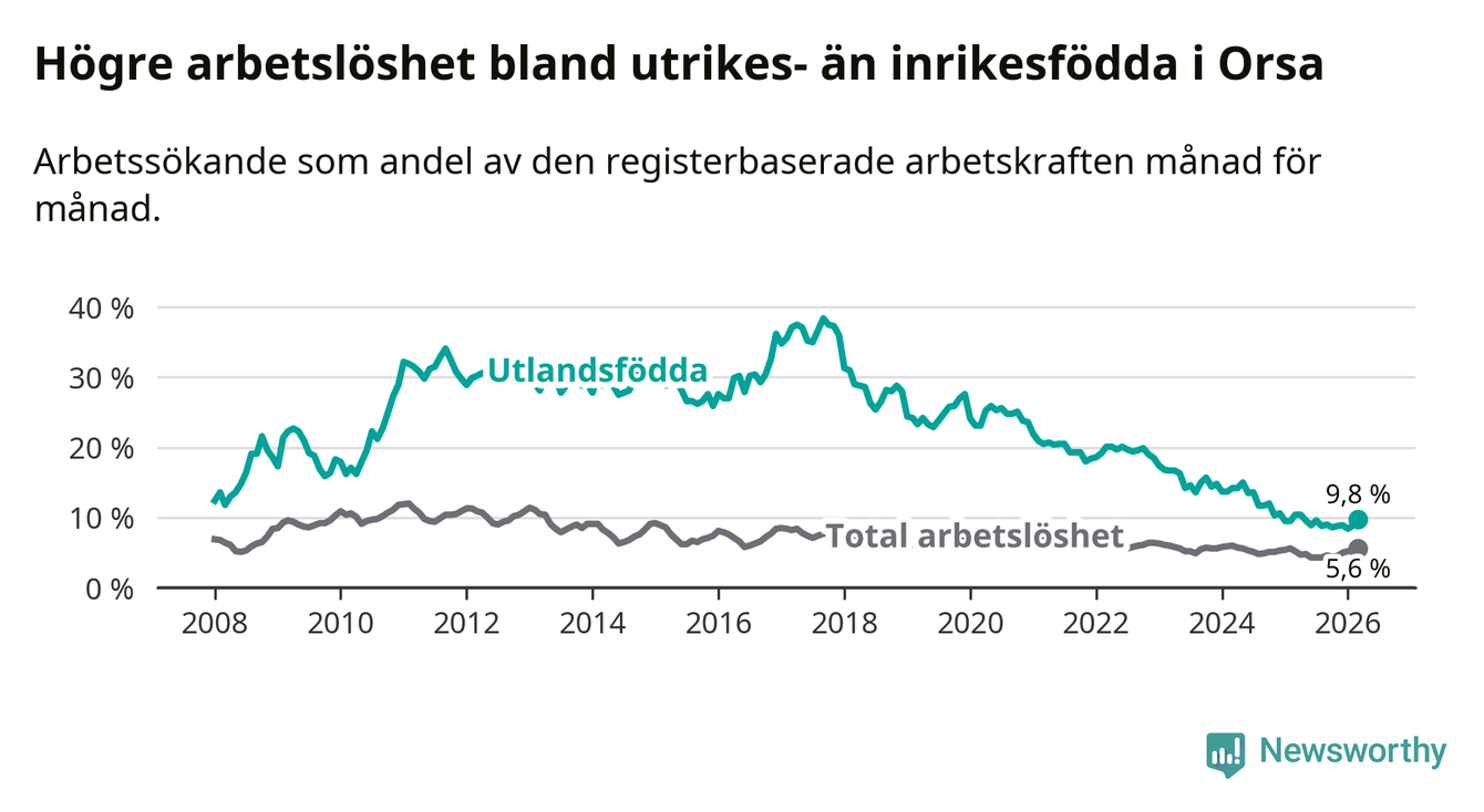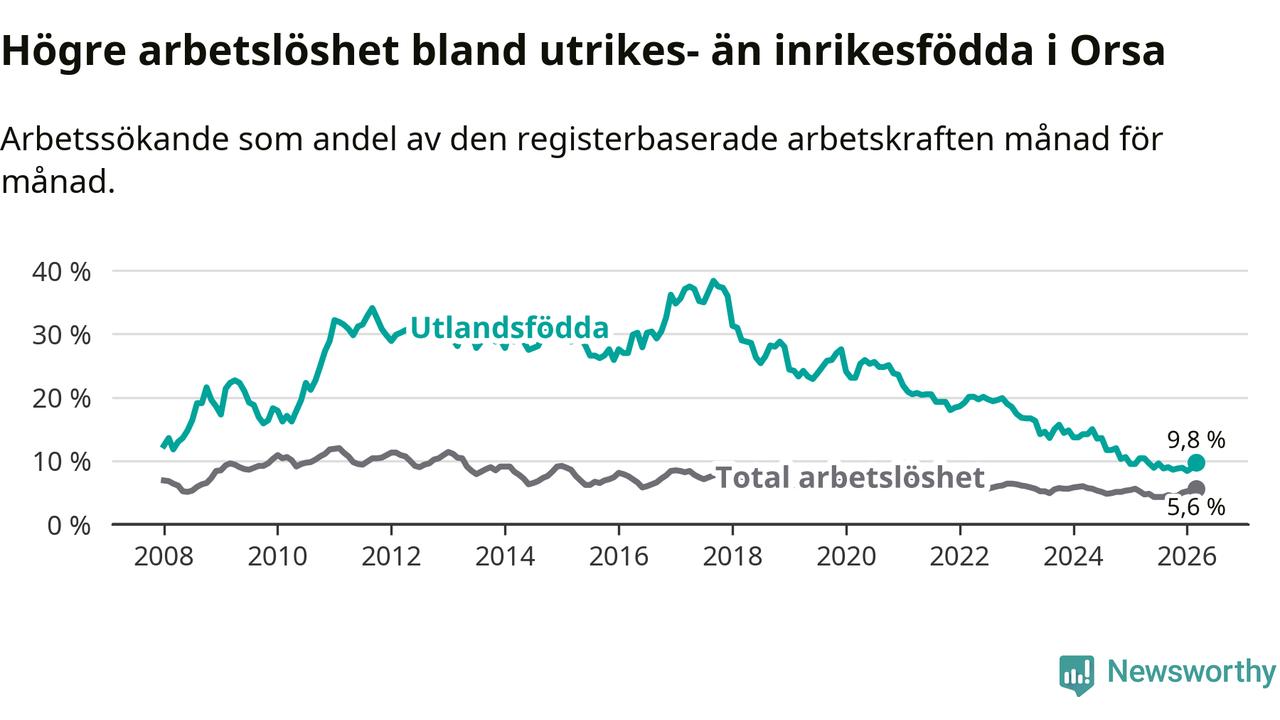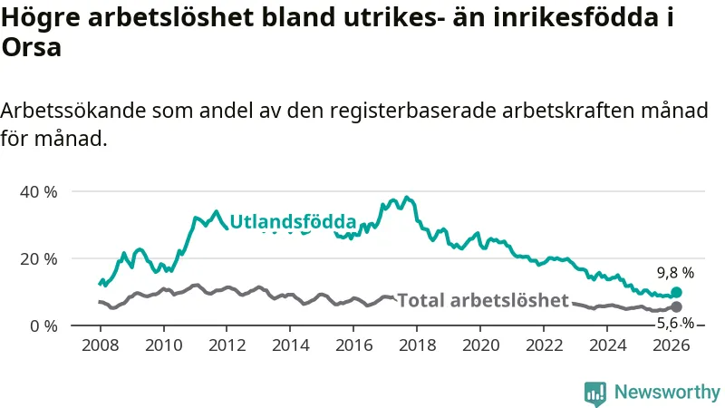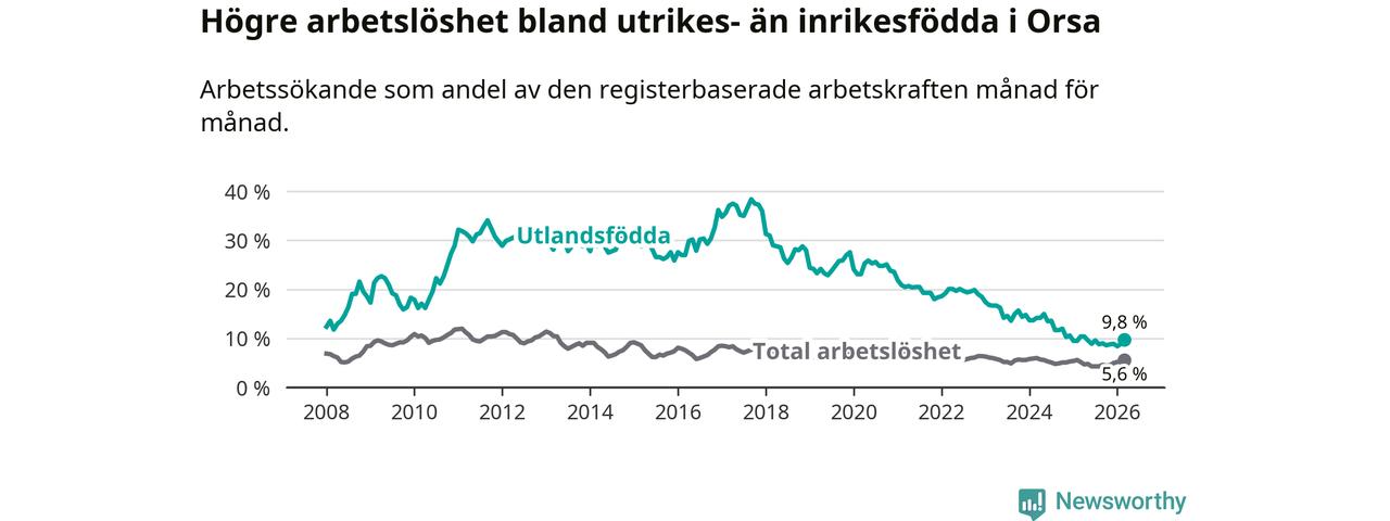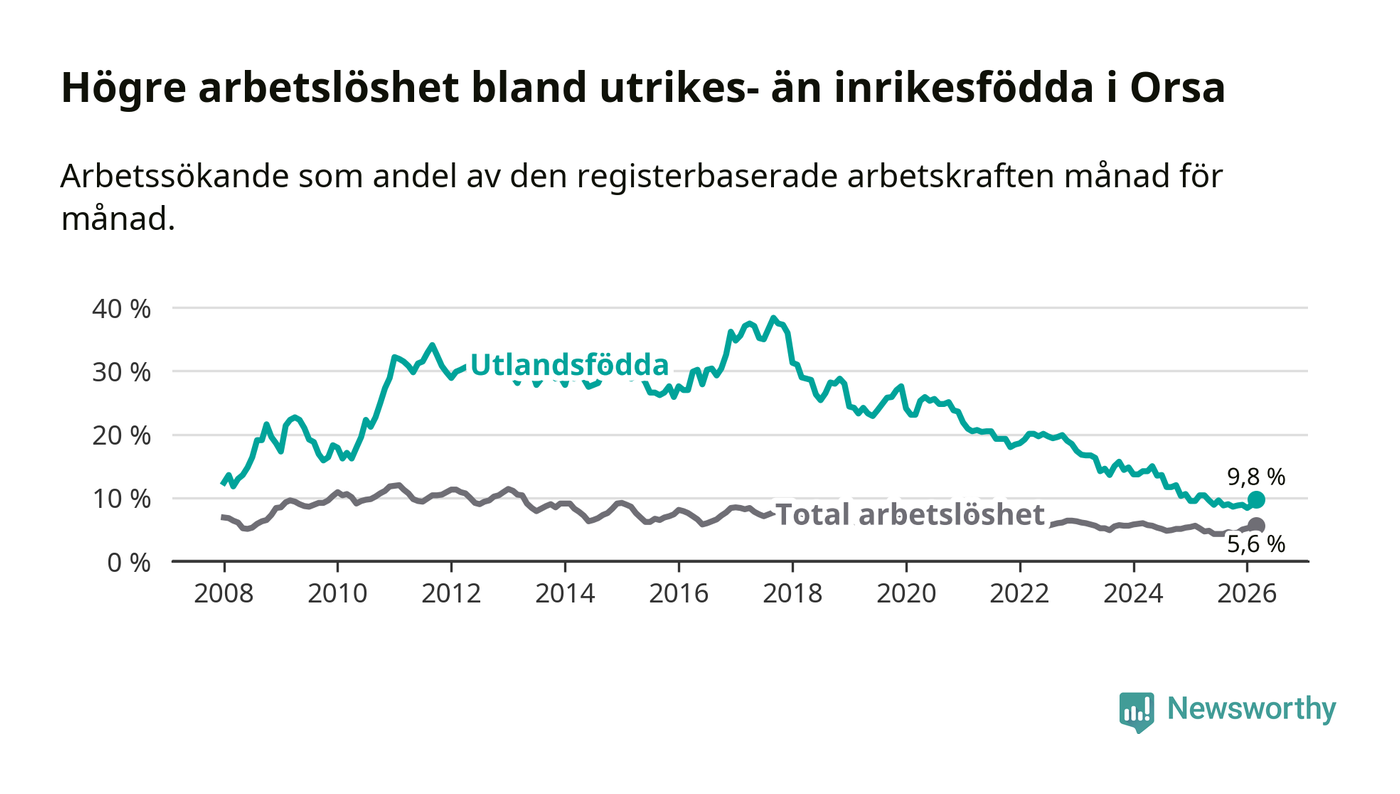 Arbetslösheten bland utlandsfödda var 9,8 procent i Orsa under mars månad, motsvarande 43 av 439 personer. Det är 0,6 procentenheter färre än vid samma tidpunkt i fjol (−4 om man räknar personer). Därmed har de utlandsföddas arbetslöshet varit lägre än vid samma tidpunkt i fjol i över tre år i sträck. Sedan december 2022 har arbetslösheten bland utlandsfödda minskat från 18,5 till 9,8 procent.
