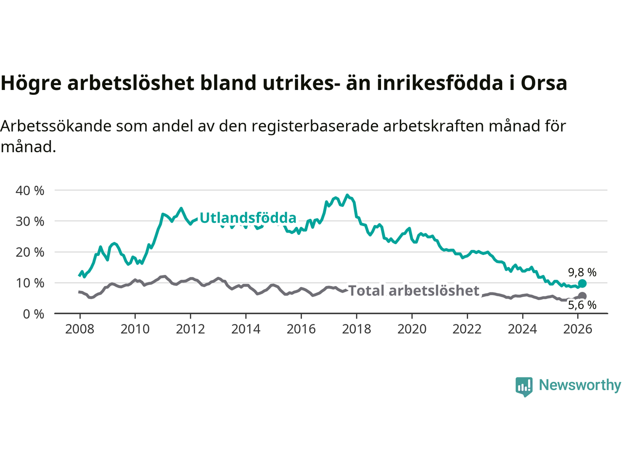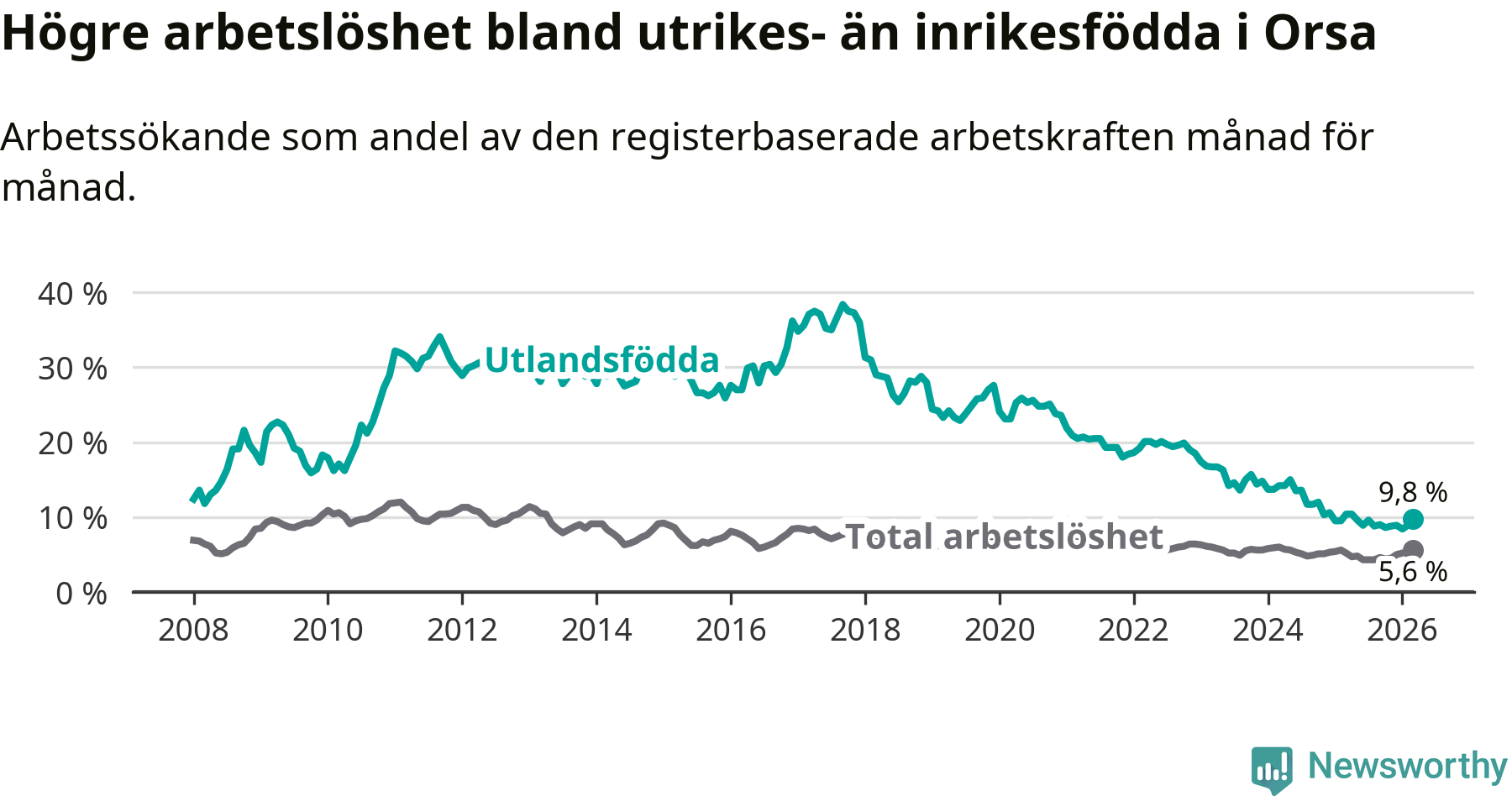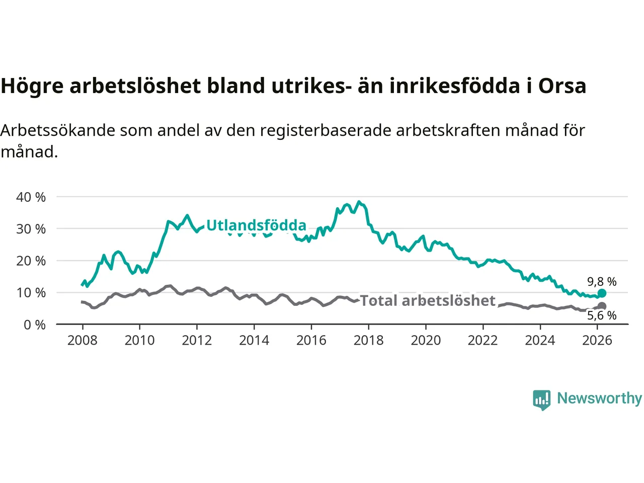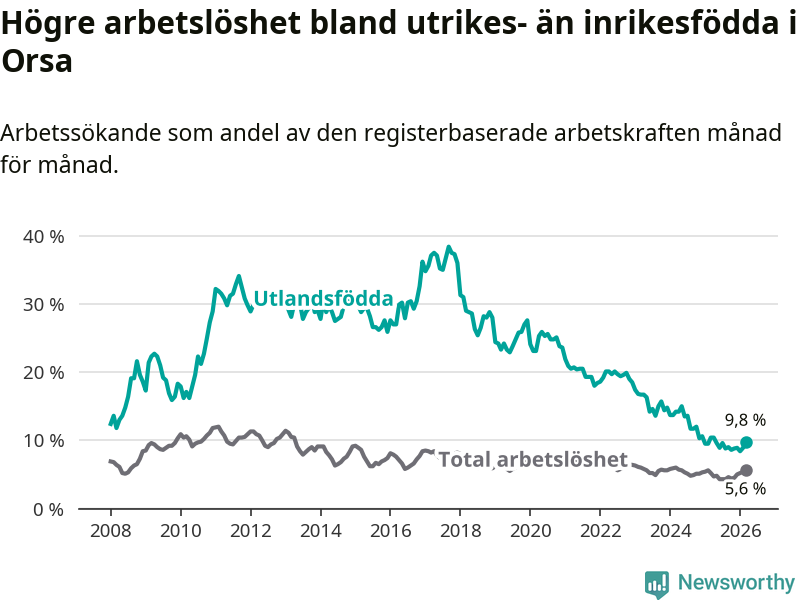 Arbetslösheten bland utlandsfödda var 9,8 procent i Orsa under mars månad, motsvarande 43 av 439 personer. Det är 0,6 procentenheter färre än vid samma tidpunkt i fjol (−4 om man räknar personer). Därmed har de utlandsföddas arbetslöshet varit lägre än vid samma tidpunkt i fjol i över tre år i sträck. Sedan december 2022 har arbetslösheten bland utlandsfödda minskat från 18,5 till 9,8 procent.