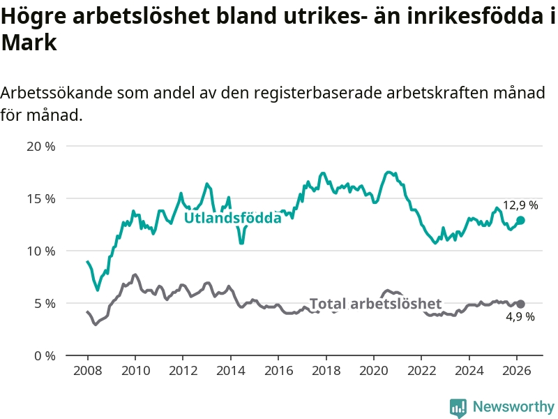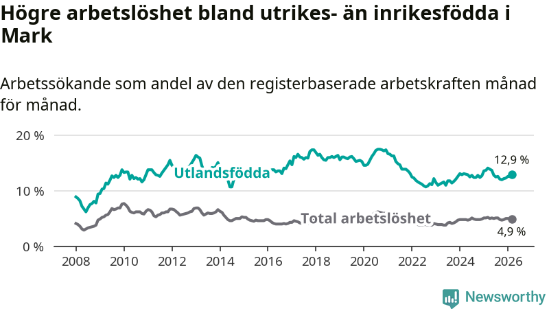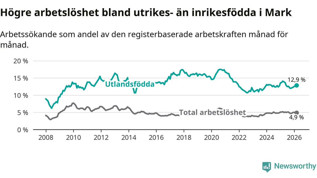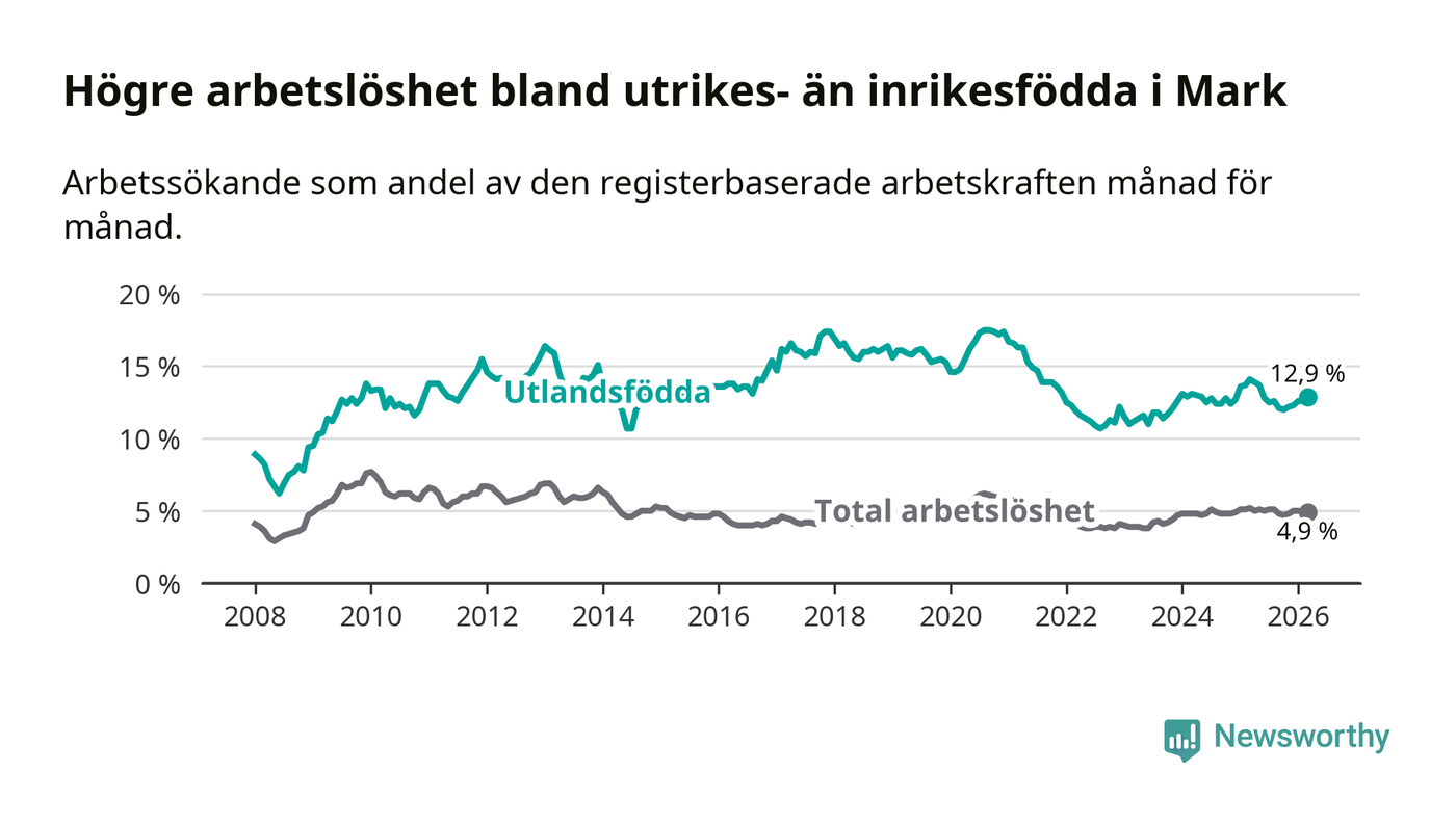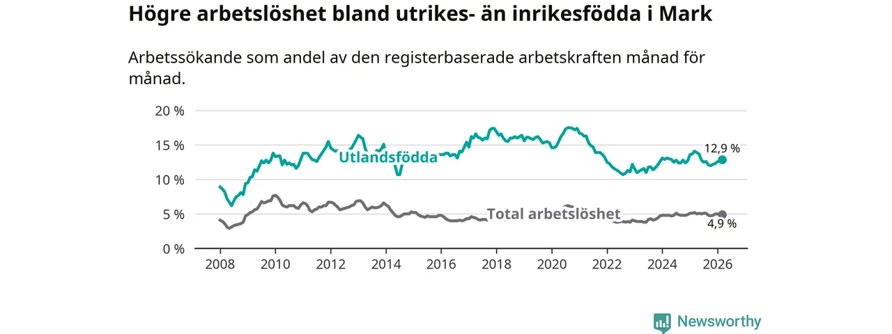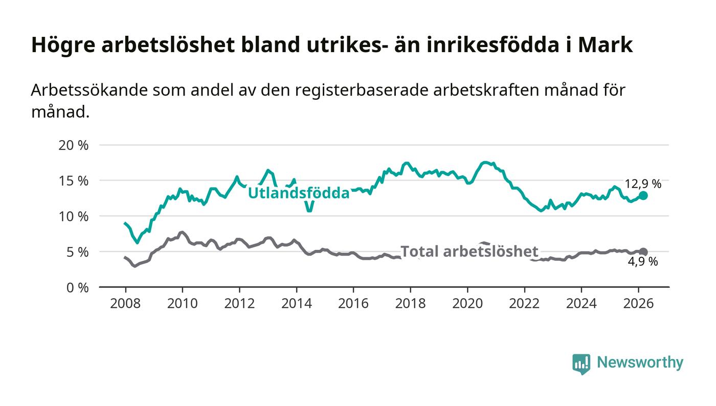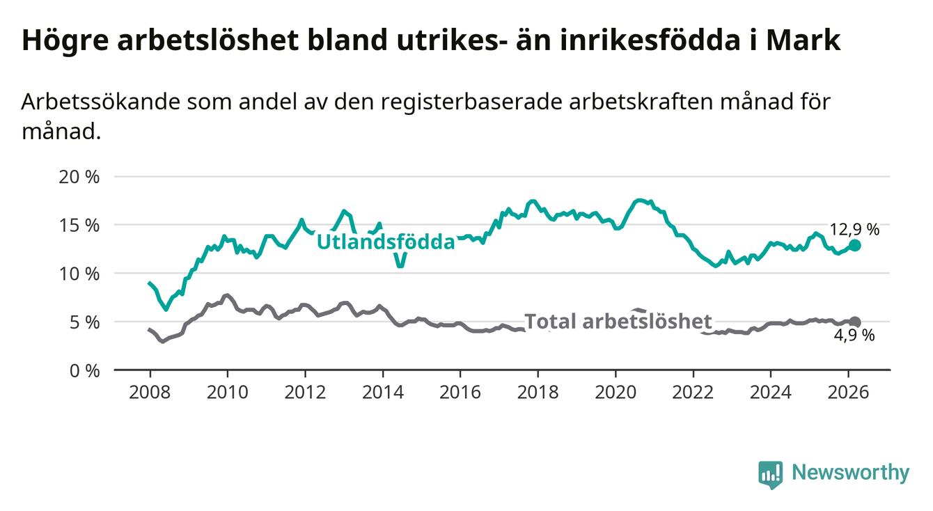 Arbetslösheten bland utlandsfödda var 12,9 procent i Mark under mars månad, motsvarande 343 av 2 659 personer. Det är 1,2 procentenheter färre än vid samma tidpunkt i fjol (−23 om man räknar personer). Därmed är de utlandsföddas arbetslöshet lägre än vid samma tidpunkt i fjol för sjunde månaden i följd.