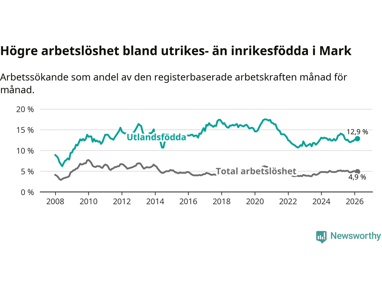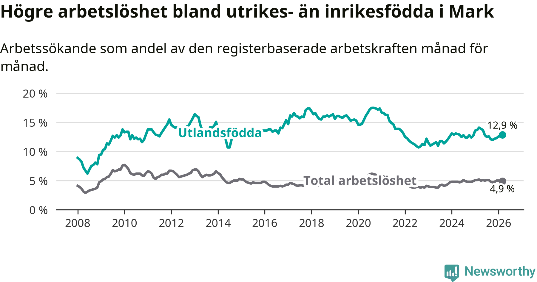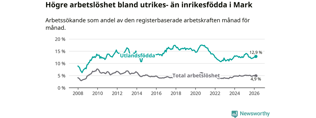 Skillnaden i arbetslöshet mellan utrikesfödda och hela befolkningen är 8,0 procentenheter i Mark. Det är en mindre skillnad än för ett år sedan (−0,9 procentenheter).