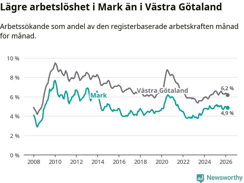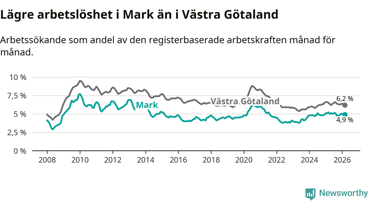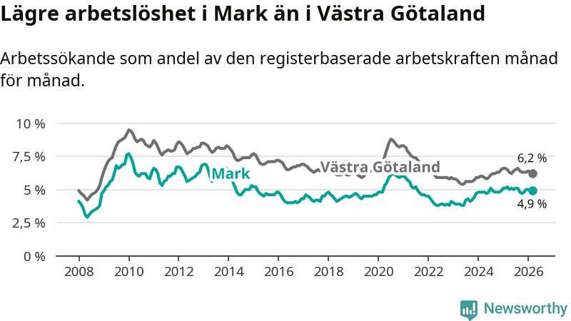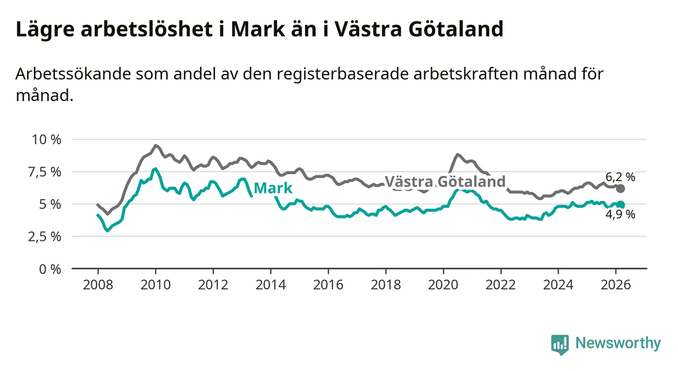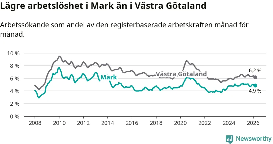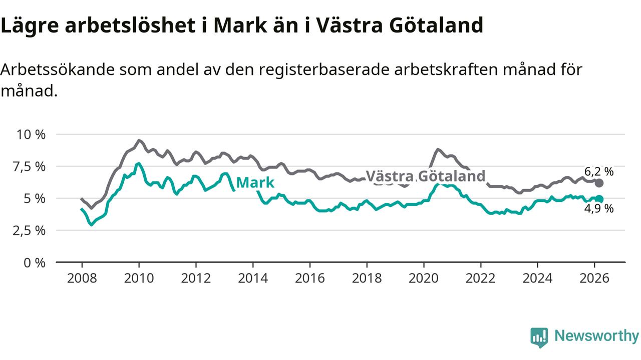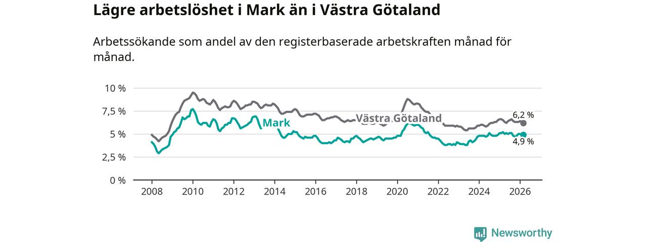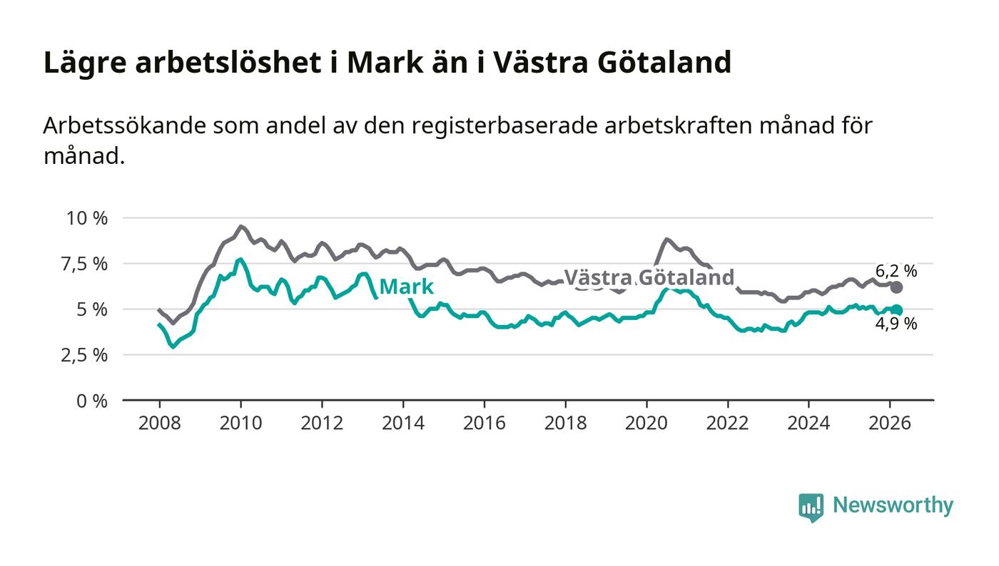 Under mars månad rapporterade Marks kommun en total arbetslöshet på 4,9 procent. Det är en minskning jämfört med samma tidpunkt i fjol (−0,3 procentenheter). Även i Västra Götalands län sjunker arbetslösheten .