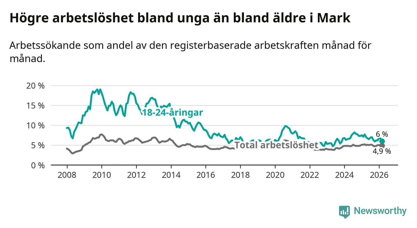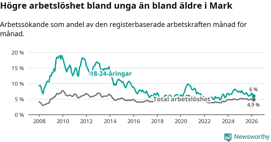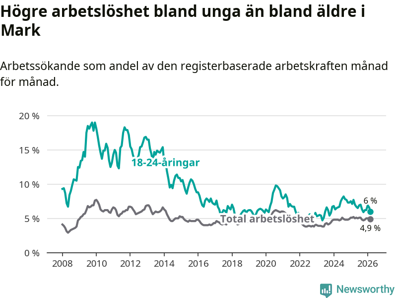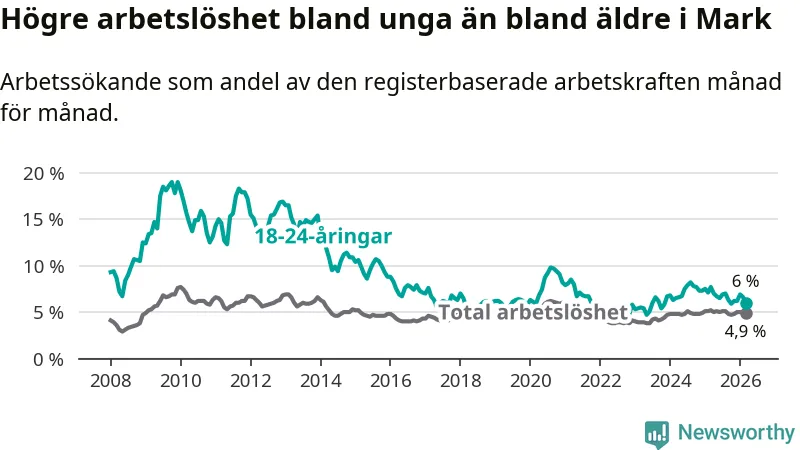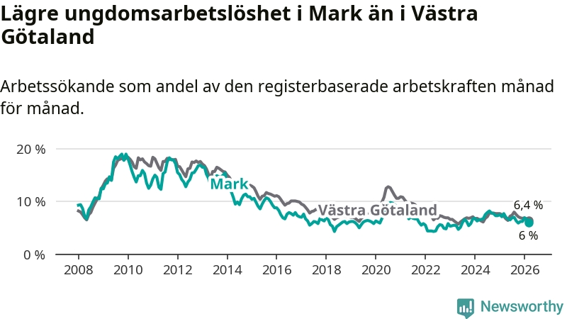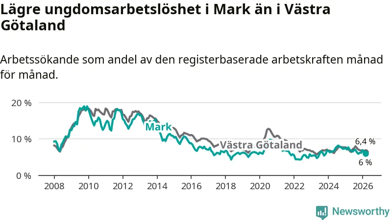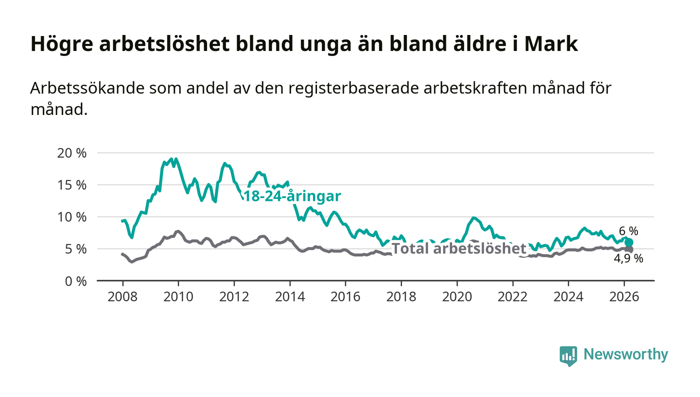 I och med den senaste månadens nedgång har de ungas arbetslöshet i Mark sjunkit tio månader i följd (ner från 6,7 procent i maj 2025 till 6,0 procent nu).