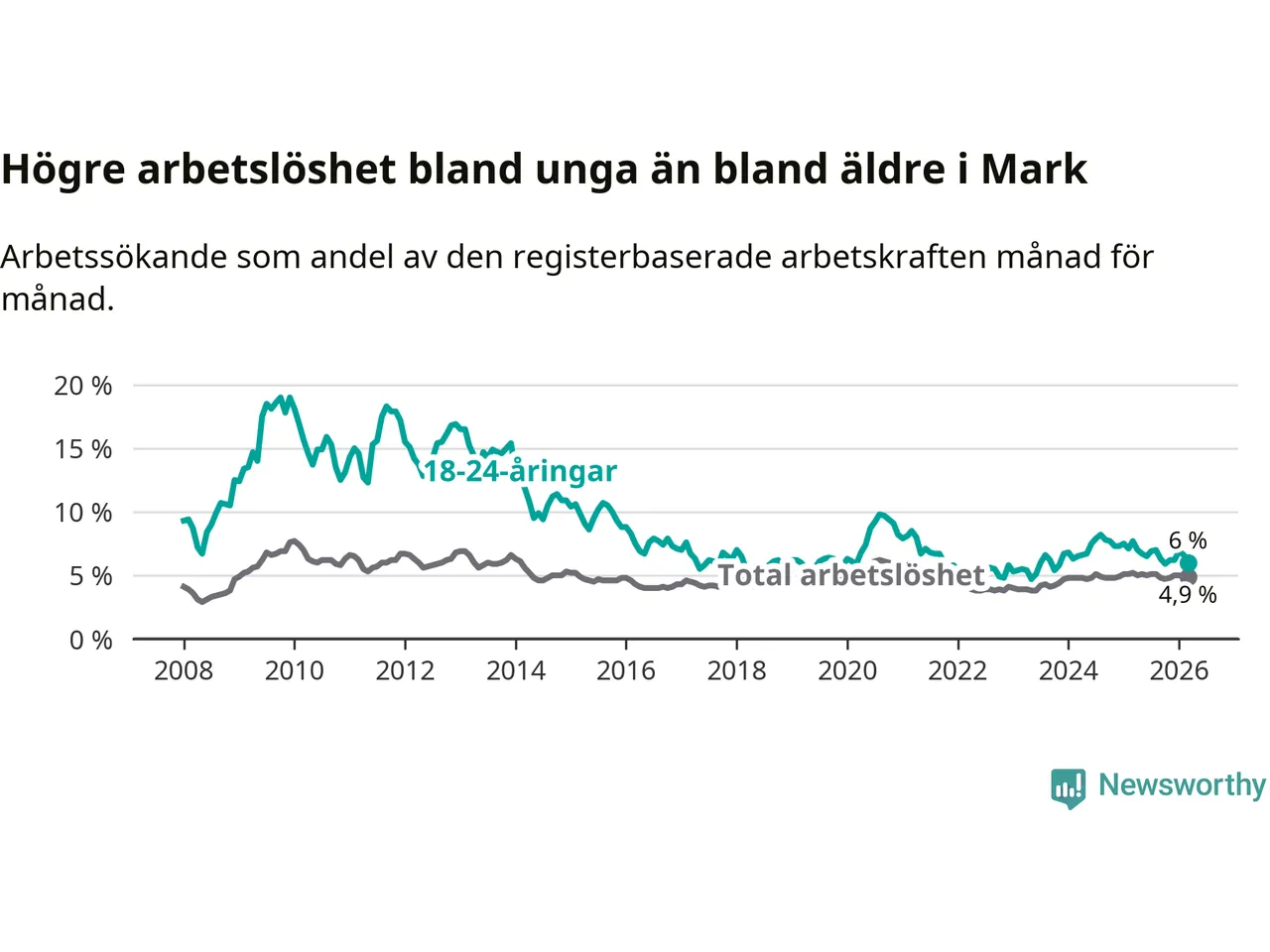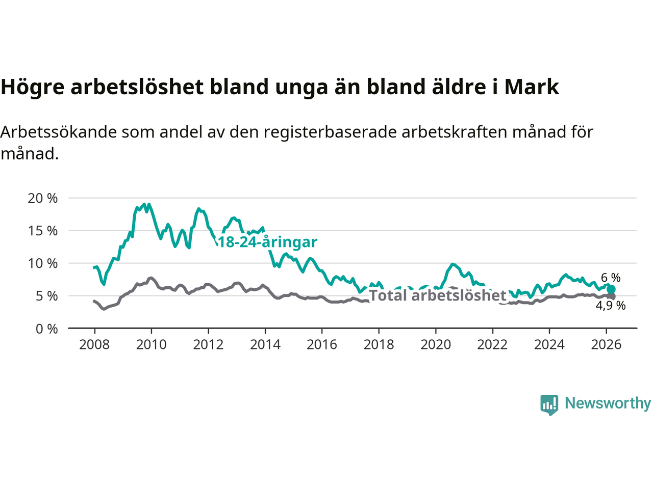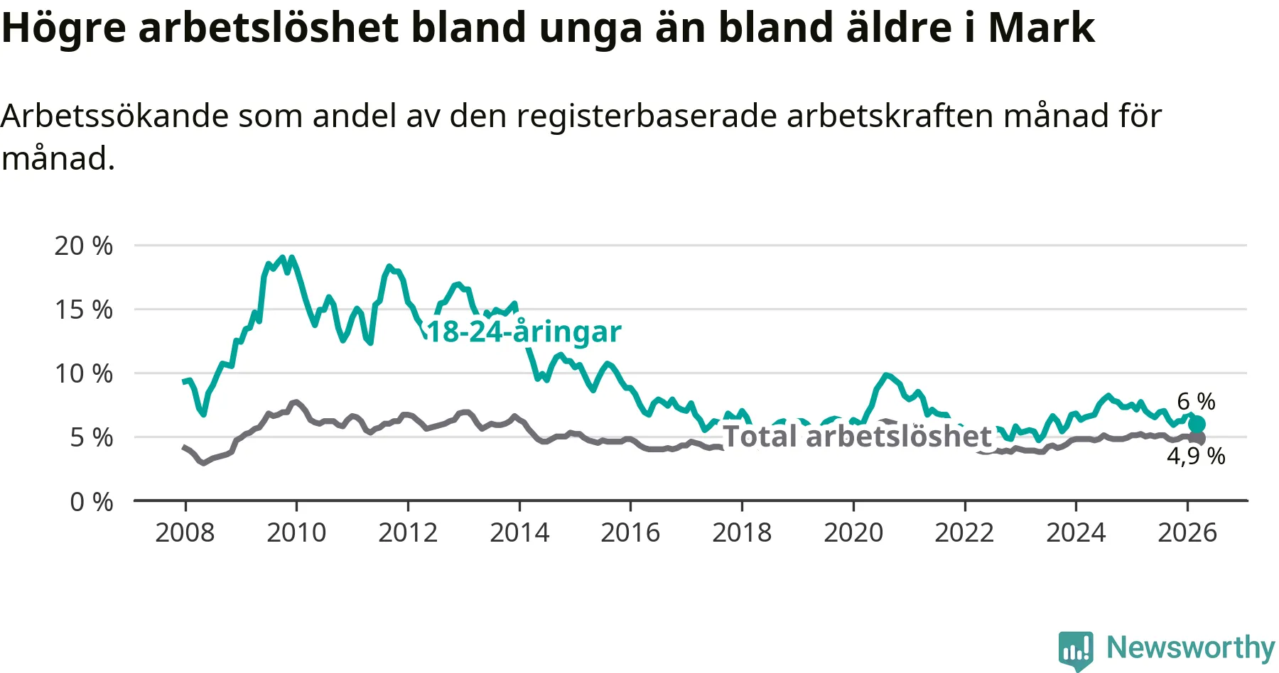 I och med den senaste månadens nedgång har de ungas arbetslöshet i Mark sjunkit tio månader i följd (ner från 6,7 procent i maj 2025 till 6,0 procent nu).