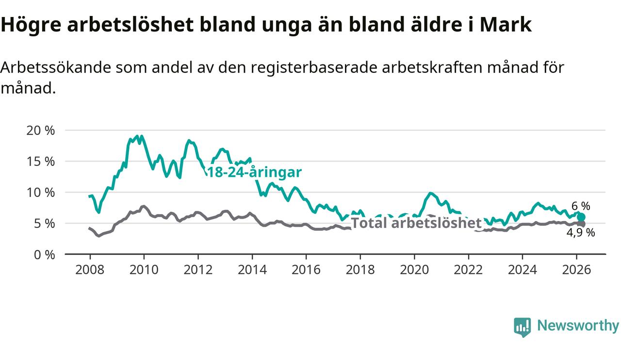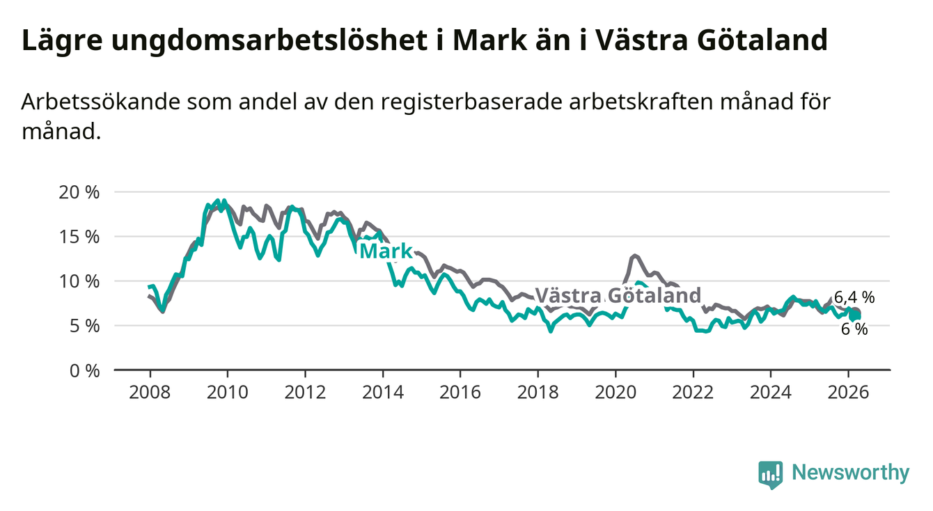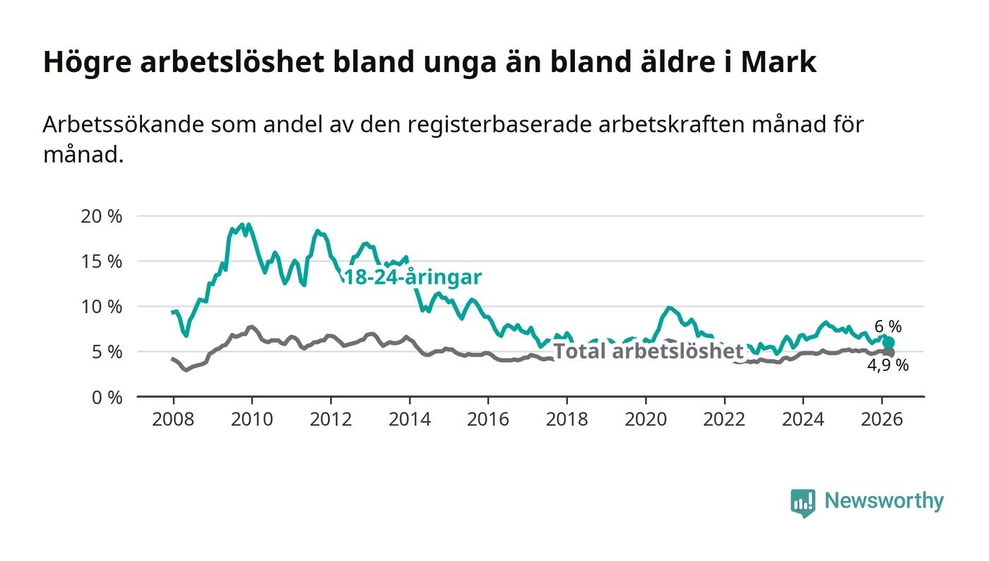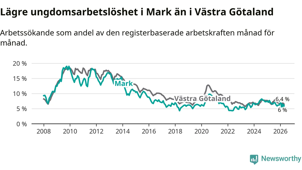 Graf: Arbetslöshet bland unga i Marks kommun och Västra Götalands län