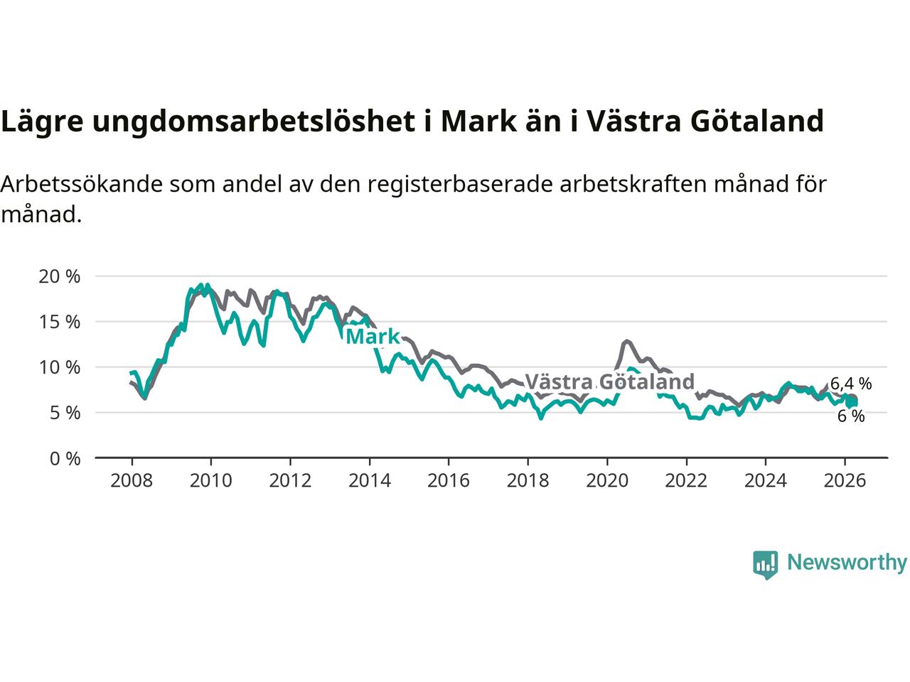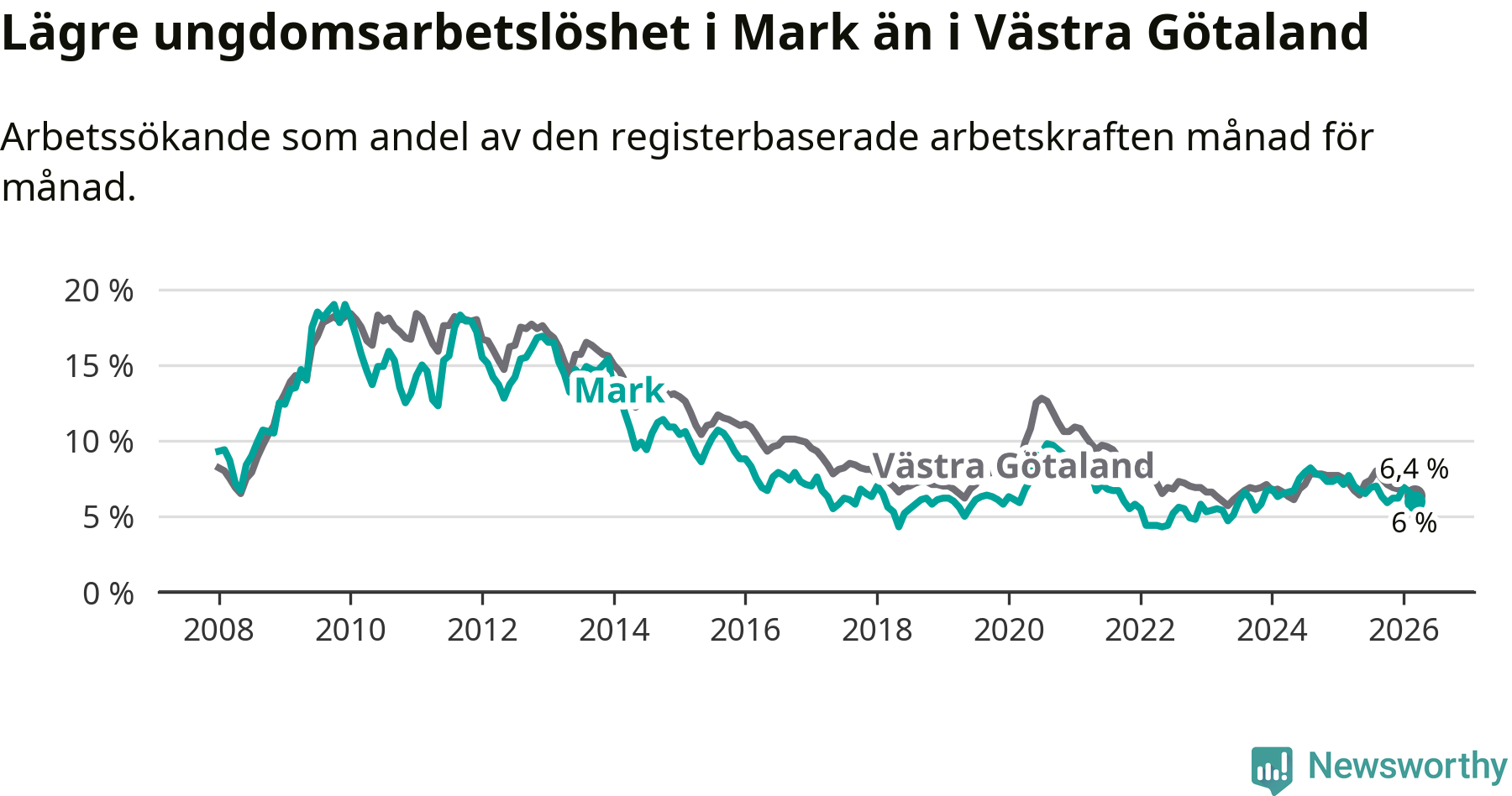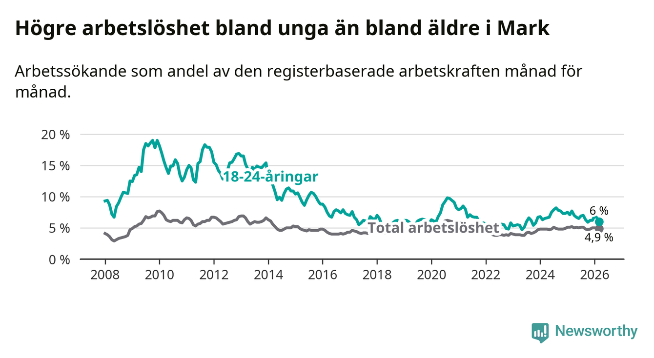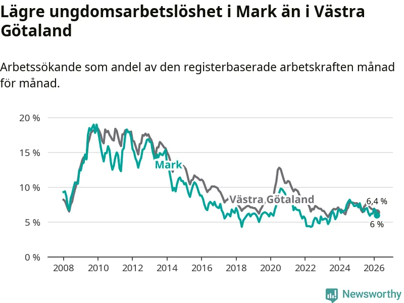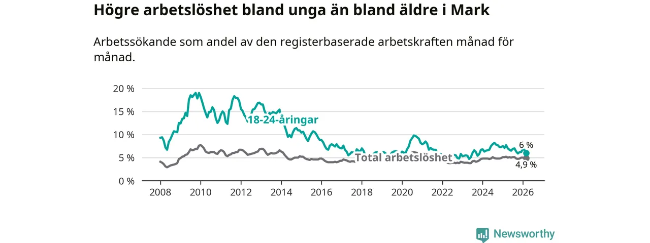 Graf: Arbetslöshet bland unga i Marks kommun och Västra Götalands län