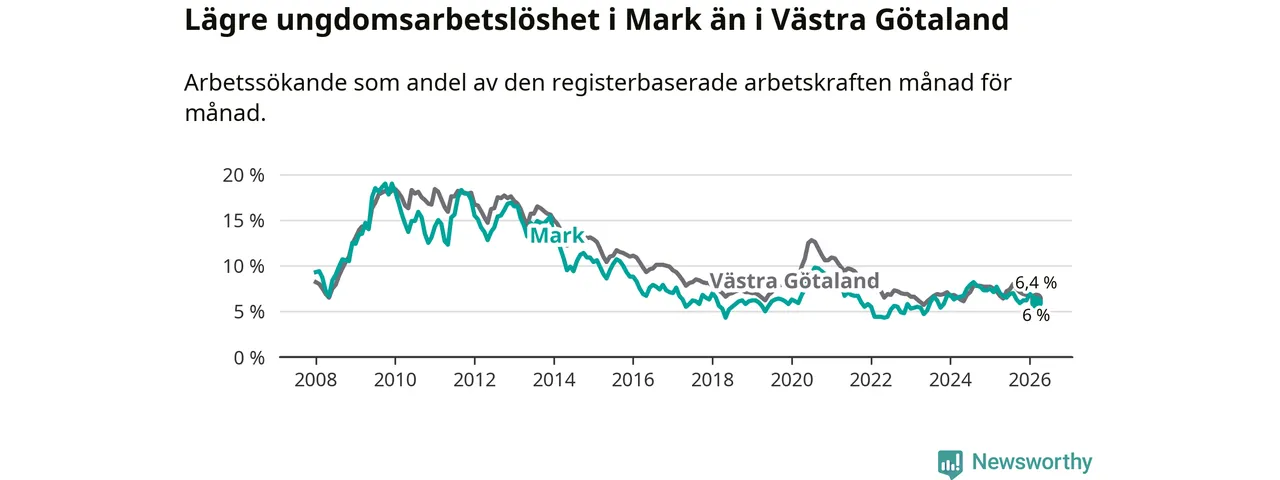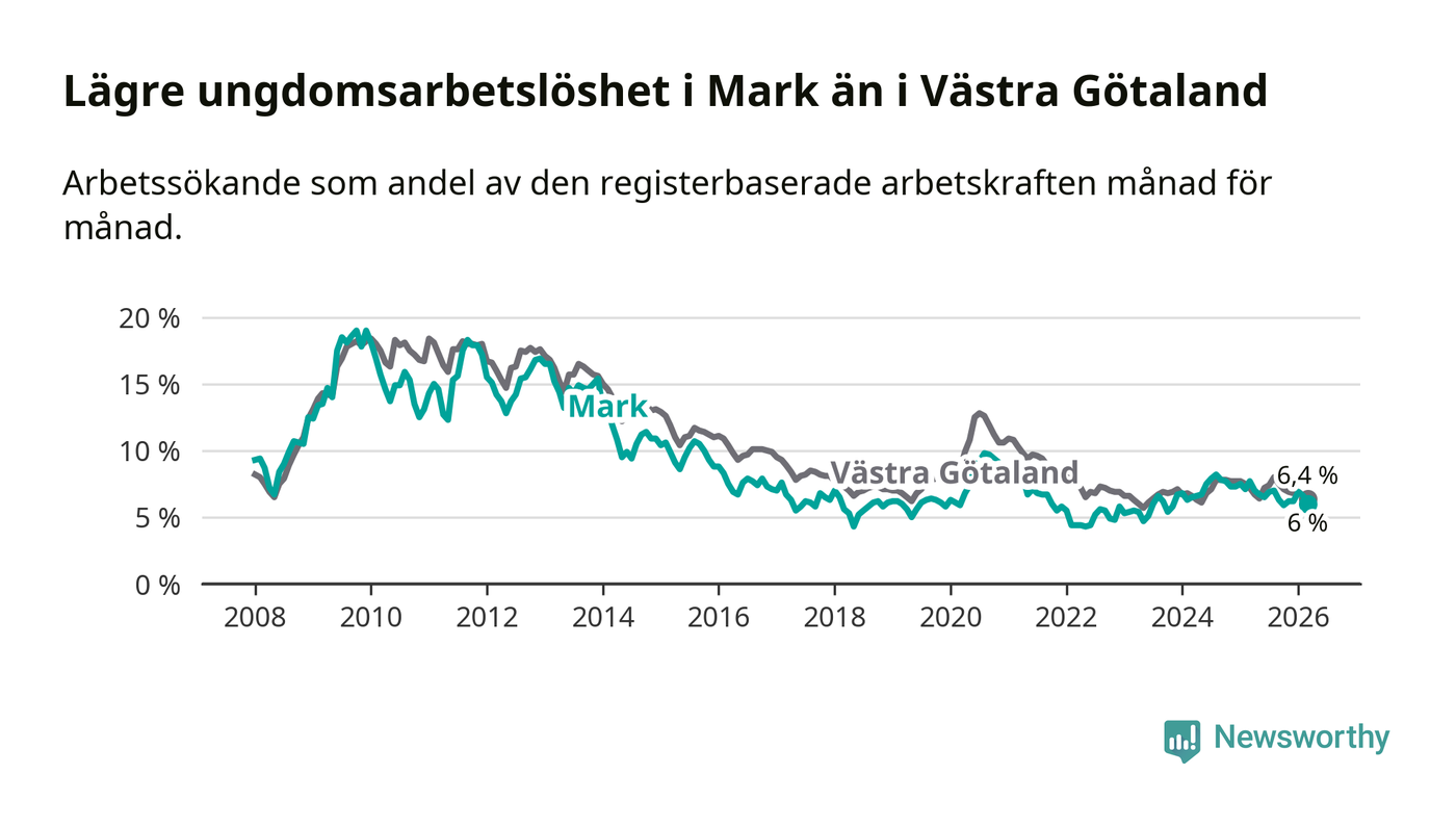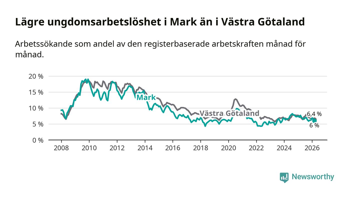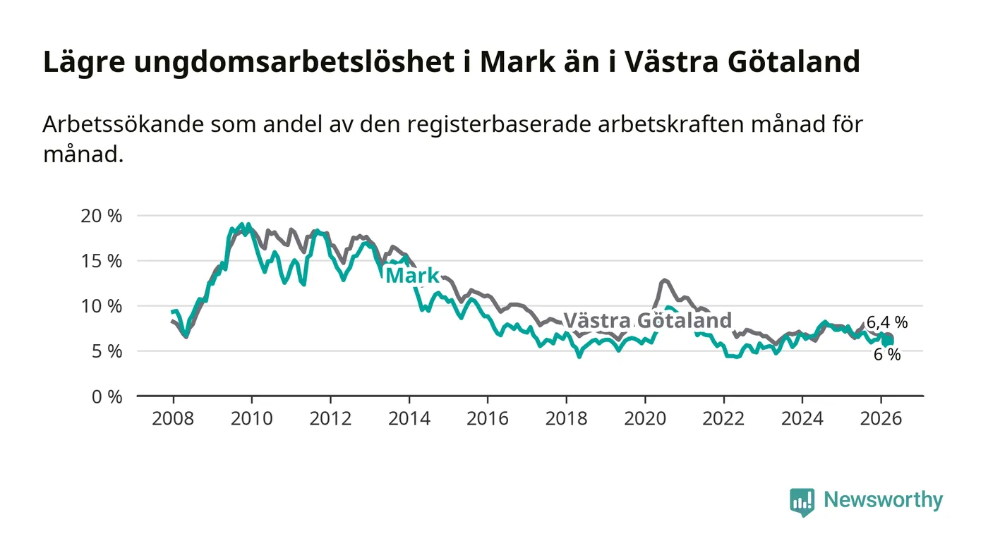 Precis som den totala arbetslösheten ligger ungdomsarbetslösheten i Mark lägre än i Västra Götaland som helhet. Skillnaden mellan kommunen och länet är 0,4 procentenheter.