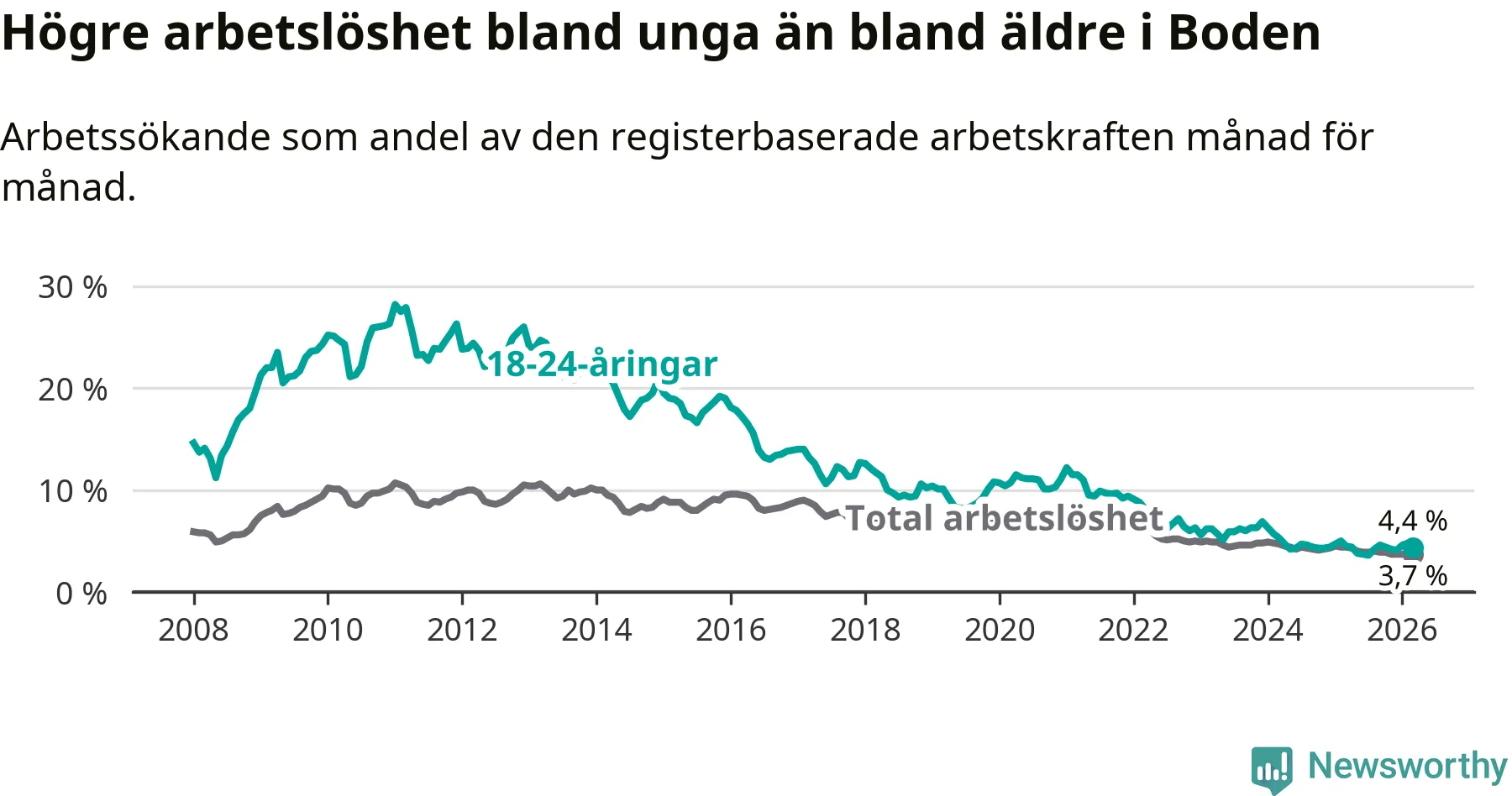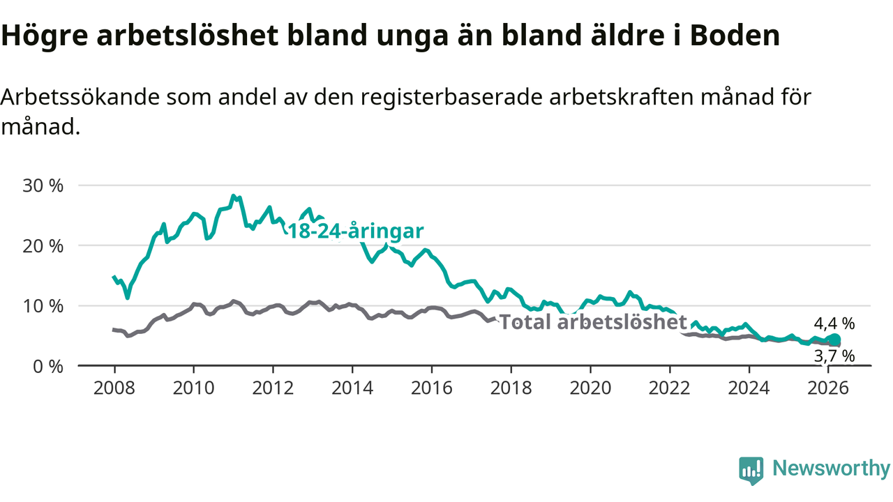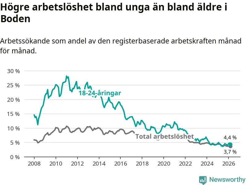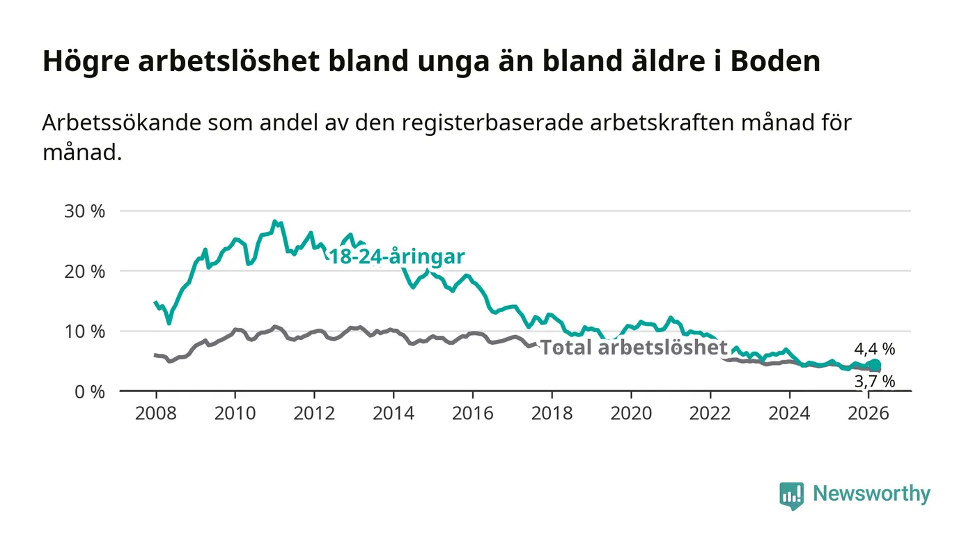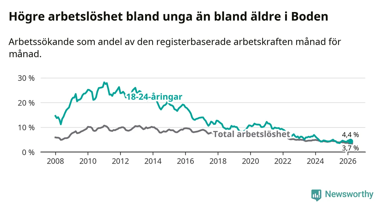 Graf: Arbetslöshet bland unga i Bodens kommun och Norrbottens län