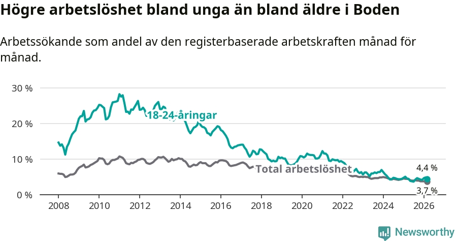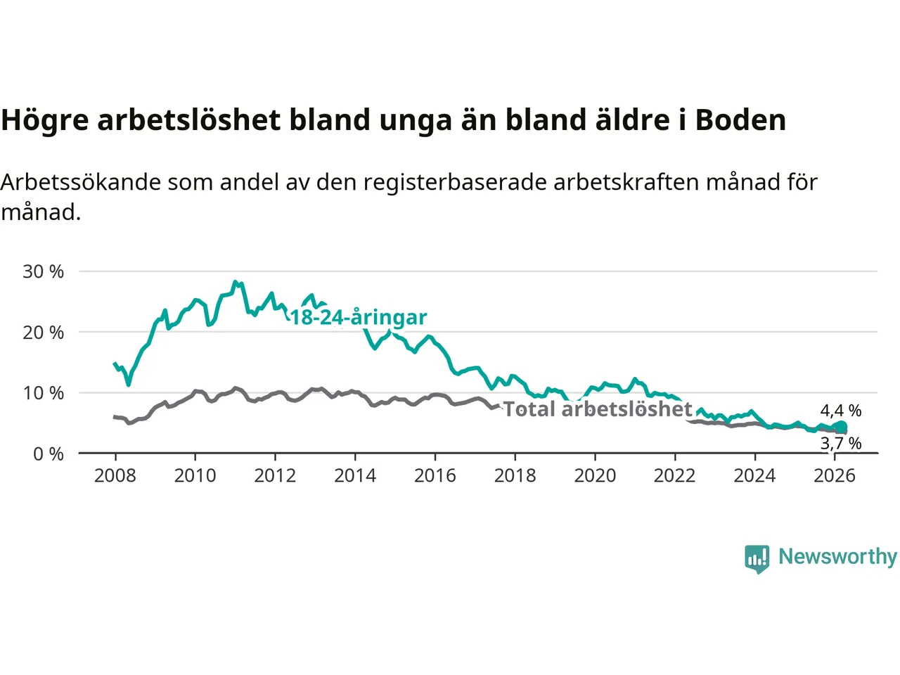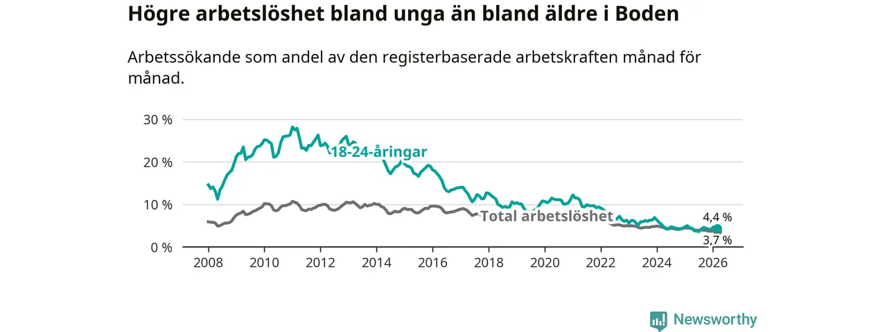 Det är 26:e månaden i följd som arbetslösheten i Boden är lägre än den var under samma tidpunkt året innan. Sedan januari 2024 har arbetslösheten gått ner från 4,9 till 3,7 procent.