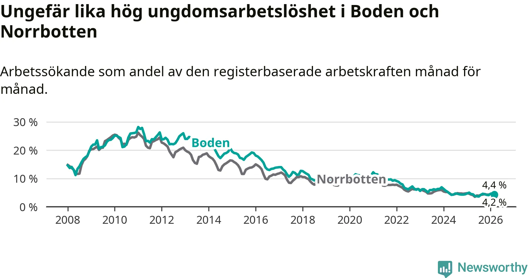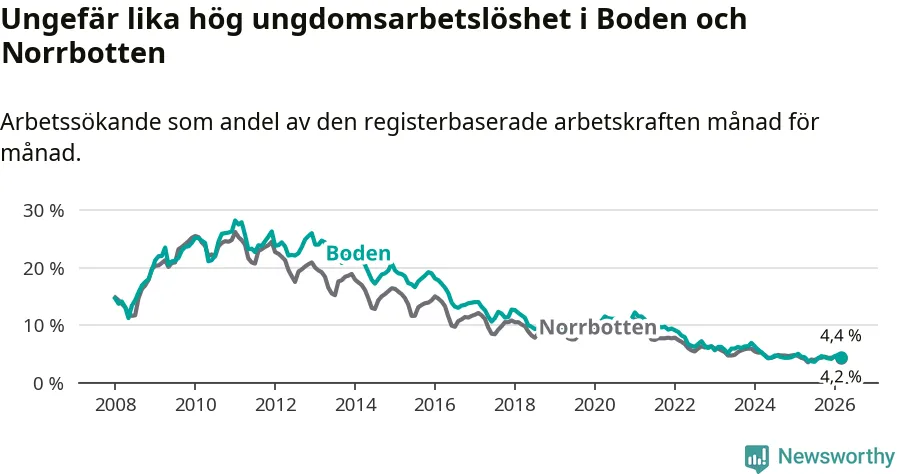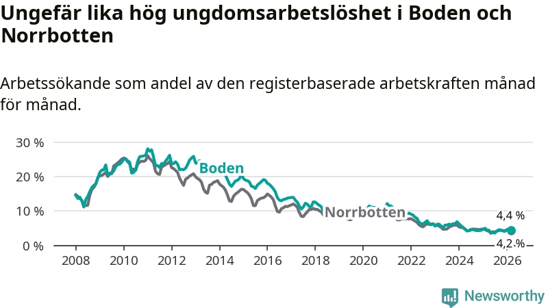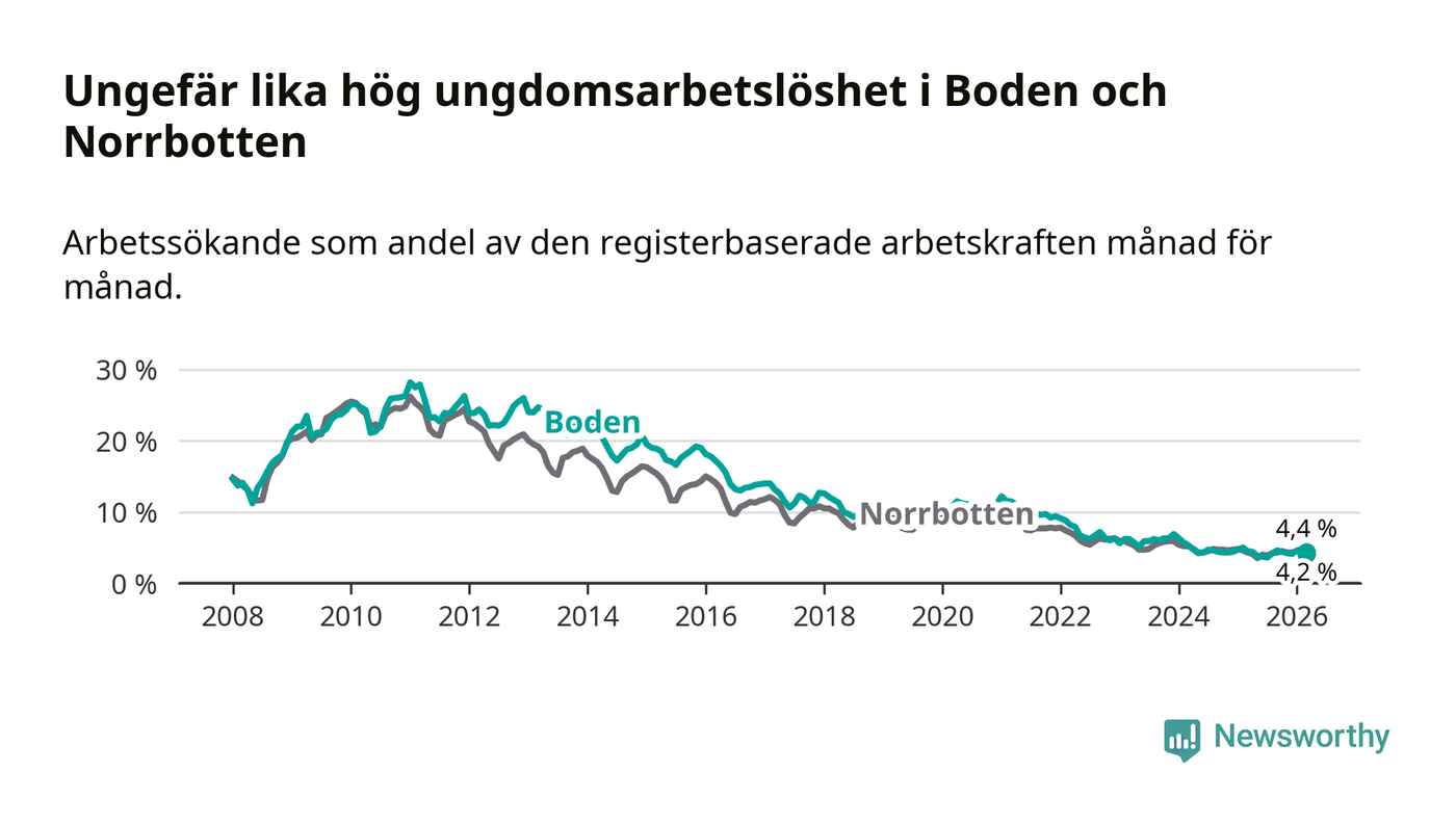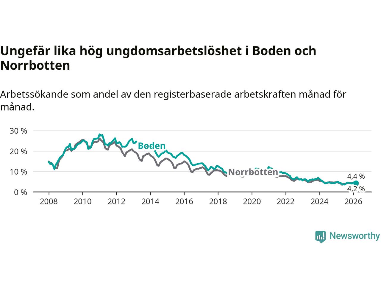 Precis som den totala arbetslösheten ligger ungdomsarbetslösheten i Boden på i stort sett samma nivå som i Norrbotten som helhet.