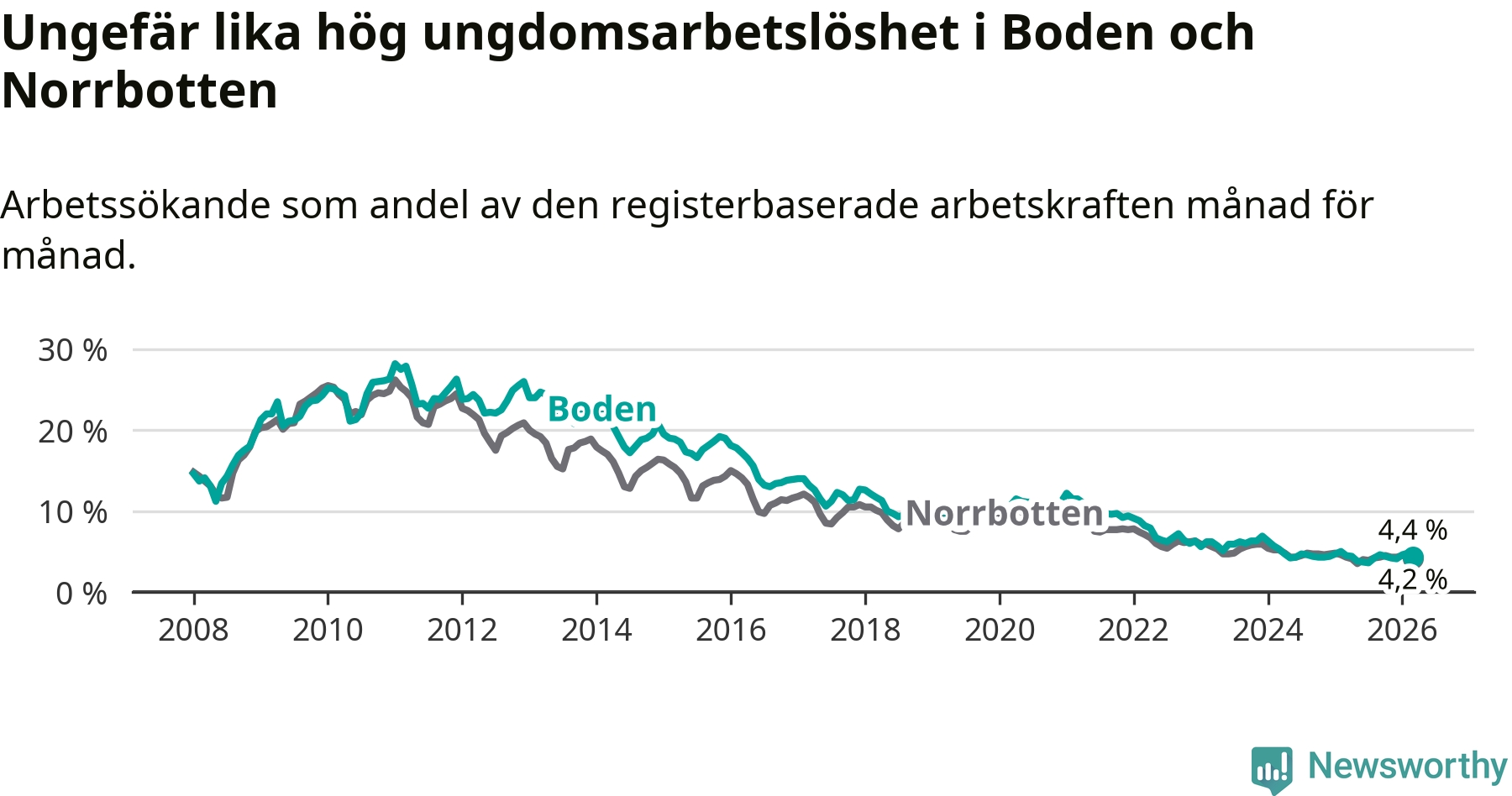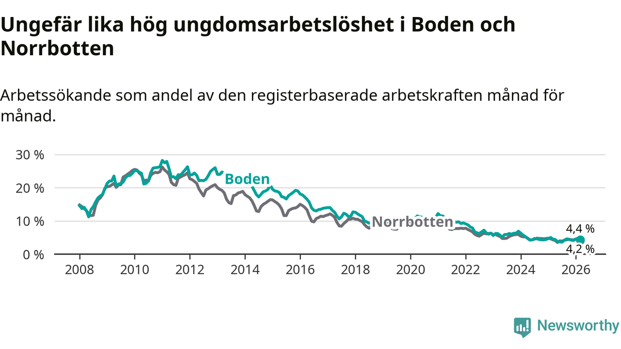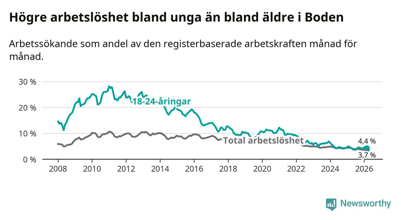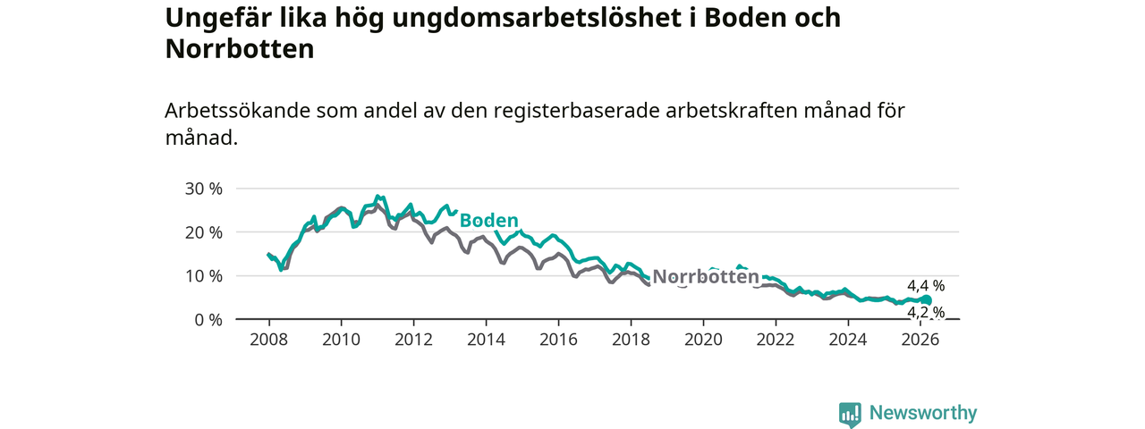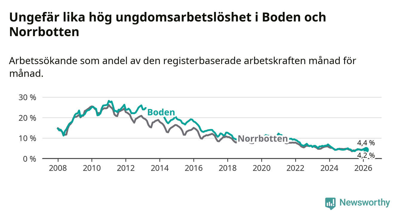 Precis som den totala arbetslösheten ligger ungdomsarbetslösheten i Boden på i stort sett samma nivå som i Norrbotten som helhet.